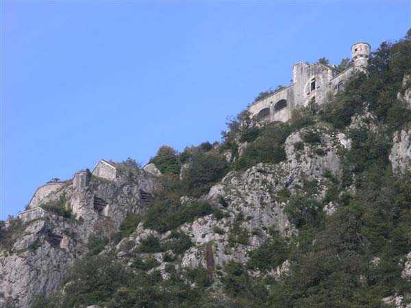 Dept 01 (Ain) Vorhang des Jura. ± 425 M/ü M. Etwa 40 km südlich der Festung Les Rousses, diese seit dem 13. Jahrhundert militärisch besetzte Stelle ist eine wichtige Straßen- und Eisenbahnpassage ins Landesinnere von Genf aus, eine Passage, die die Rhône nutzt. Der Name selbst ist eine Verformung von "La cluse" und die Straße überquerte übrigens die 2 Zugbrücken des unteren Forts. Die heutige Befestigung besteht aus 2 getrennten Forts, dem Unteren und dem Oberen (oder inférieur und supérieur), verbunden durch eine in den Fels gegrabene Galerie, die eine Treppe von 1.165 Stufen schützt, die einen Höhenunterschied von etwa 200 m überwindet. Der Bau des unteren Forts geht auf das 17. und 18. Jahrhundert zurück, aber es wurde 1815 geschleift und von 1816 bis 1828 wieder aufgebaut. 1815 verlor Frankreich das linke Ufer der Rhône und damit die Möglichkeit, den gegenüberliegenden Mont Vuache (1101 M/ü M) zu befestigen. Das obere Fort seinerseits wurde von 1834 bis 1848 erbaut und von 1885 bis 1887 verstärkt. Die Elemente, die für diesen Index von Interesse sind, finden sich in der Gesamtheit der beiden Forts und ihrer Verbindung. Das untere Fort, dessen Zugänge von Zugbrücken nach Bélidor kontrolliert werden, erfuhr nach 1874 nur wenige Veränderungen; tatsächlich musste man bis 1886 warten, um auf der Höhe des oberen Hofes eine zweistöckige Unterkunft mit vier Jochen in den Fels graben zu sehen. Diese Unterkunft, deren Stuben durch dicke Felssteher getrennt sind, umfasst im Erdgeschoss einen Brotofen, während im Verkehrskorridor des 1. Stocks eine Galerie abgeht, die zur Maginot-Kasematte führt, die den Straßentunnel der Route Lyon-Genf bestreicht, ein 1937 in den Fels oberhalb des unteren Forts gegrabener Tunnel. Die Fenster der Stuben und Nebenräume sind ebenso viele kleine in den Fels gegrabene Tunnel. Wir notieren der Vollständigkeit halber, dass ein altes Pulverhaus einige Einrichtungen erhielt, darunter eine Lampennische sowie das Vorhandensein eines originellen Mechanismus zum Betätigen eines Fallgitters und einer hübschen Sonnenuhr, die mit dem Motto "Toujours l’ennemi s’use devant le fort l’Écluse" versehen ist. Die Verbesserungen am oberen Fort sind deutlich sichtbarer. Dieses obere Fort ist recht komplex und umfasst mehrere Ebenen. Das spektakulärste Element ist zweifellos der Eckturm der beiden Gräben (der Rest des Umfangs besteht aus einem Steilhang), ein Turm, dessen Erdgeschoss, unabhängig von den Etagen, als doppelte Kontereskarpenkasematte dient. Die oberen Etagen sind nur über eine Treppe mit Sperre erreichbar, die mit dem Grabengrund kommuniziert. Jenseits der Sperre führt eine Poterne zu einer Treppe, die fünf Ebenen von Schießscharten erschließt, bevor sie Zugang zu einer Gewehrgalerie gewährt, die ihrerseits drei in den Fels gegrabene Kasematten mit Rückwärtsfeuer bedient. Das untere Stockwerk, die Kontereskarpenkasematte, kommuniziert über eine unter dem Graben verlaufende Treppe mit dem oberen Fort. Wir bemerken, dass eine zweite Kasematte, an der Escarpe der Kehlfront angebracht, einen dritten Grachen bestreicht, der eine Ebene tiefer liegt als die von dem Turm verteidigten. Dieses obere Fort besitzt von Anfang an zweimal vier Kasematten nach Haxo, die auf mehrere Ebenen verteilt sind. Das 1848 fertiggestellte Fort besaß eine Unterkunft (1836) in Chevron-Form, deren zwei Schenkel jeweils drei Stuben auf zwei Ebenen aufreihten. Die Spitze des Chevrons war von anderen Räumen eingenommen, darunter der Hauptzugangstreppe, wobei die Unterkunft viel höher lag als der Forteingang. Die Unterkunft, dem französischen Territorium zugewandt, war nicht überdacht. 1886-87 ließ man ihr einen schmalen Lichtschachthof, an dessen Flanke vier auf den Mont Vuache gerichtete Kasematten gebaut wurden. Die beiden inneren Kasematten waren für direkten Schuss bestimmt, die äußeren für indirekten Schuss. Die Erdabdeckung dieser Kasematten erreichte nicht die Höhe der die Unterkunft bedeckenden, daher wurden, um die Decke des Hofs panzern zu können, in die Fassade der Unterkunft pro Stube zwei enorme Gusseisenkonsolen eingelassen. Die kurzen Seiten des Hofs wurden als Kaponnierflanke eingerichtet mit, was selten ist aber durch die Notwendigkeit von Steilschüssen auferlegt wurde, gestuften Schießscharten. Das Dach der Unterkunft ist als Infanteriestellung ausgebaut, von wo aus die Aussichten prächtig sind und bis zum Genfersee und dem Alpenmassiv reichen. Zwei der zahlreichen Schießscharten der Unterkunft zeigen einen Drehbolzen mit einem im Boden verankerten Metallbogen, einem Bogen von 90 cm Länge und 75 cm vom Bolzen entfernt verankert. Wir wissen nicht, welche Lafette und welche Bewaffnung dort installiert werden konnte, aber ähnliche Vorrichtungen werden vor einigen Schießscharten der Verbindung bemerkt werden. Wir notieren schließlich in dieser Unterkunft ein Gestell eines Vaillant-Ofens, die Ruinen eines Brotofens, zwei Reihen von drei Latrinen und eine prächtige dreifache Steinwacht. Die höchste der Kasematten für direkten Schuss, auf der Höhe des Forteingangs gelegen, umfasst merkwürdigerweise ein Waschbecken, eine Toilette und ein Chronogramm 1887. Es ist wahrscheinlich, dass es sich dabei eher um eine Kasematte für direkten Schuss "Séré de Rivières" als um eine Kasematte "Haxo" handelt, zumal die architektonischen Unterschiede zwischen den beiden Modellen eher gering sind. In dieser Kasematte beginnt die Treppe, die zum unteren Fort zurückführt. Die Verbindung umfasst neun Ebenen von Kasematten, insgesamt sechzehn Kasematten, davon sieben in Richtung Schweiz, fünf auf den Mont Vuache und vier flussabwärts gerichtet. Man findet auch, neben mehreren Terrassen, einen weitläufigen Höhlenunterstand für 70 Mann, ein Pulvermagazin, eine Ladewerkstatt, drei Magazine für Fertigmunition und ein Magazin für 260.000 Infanteriepatronen. Jeder Kasemattengang wurde mit einer von oben nach unten zunehmenden Num