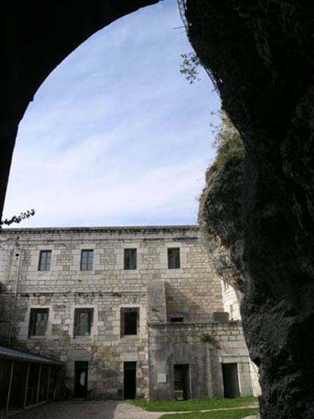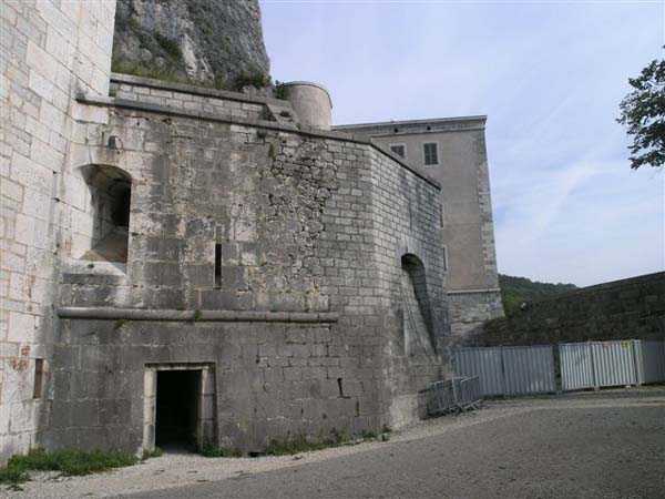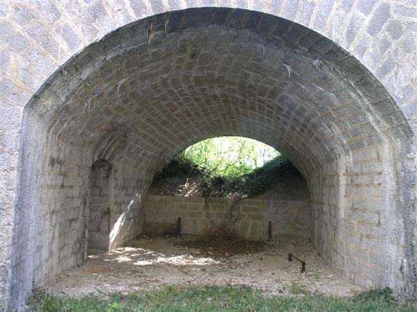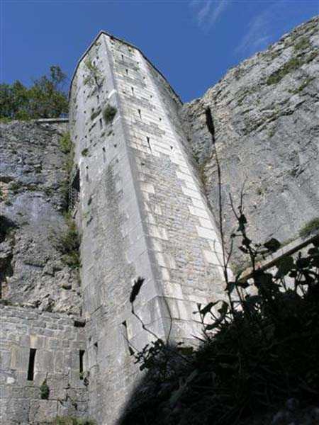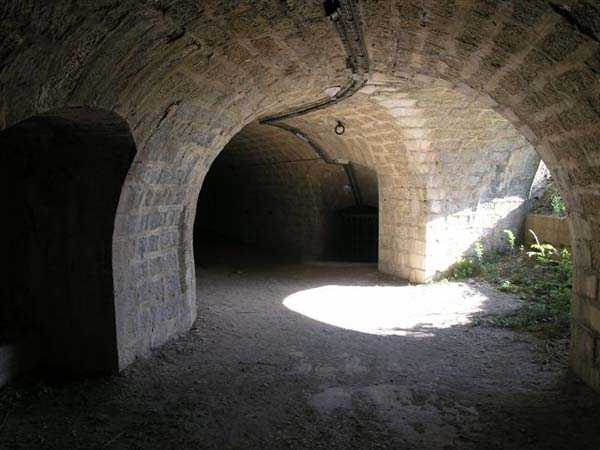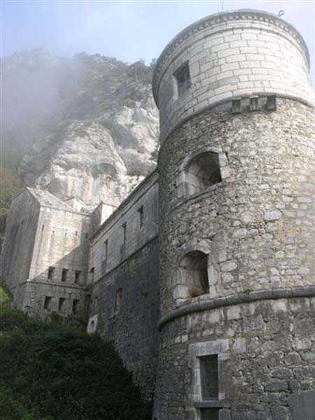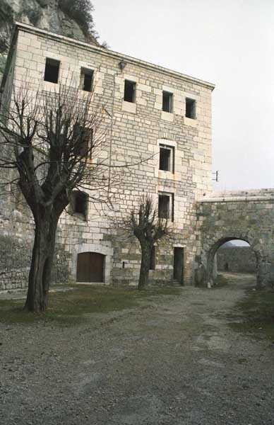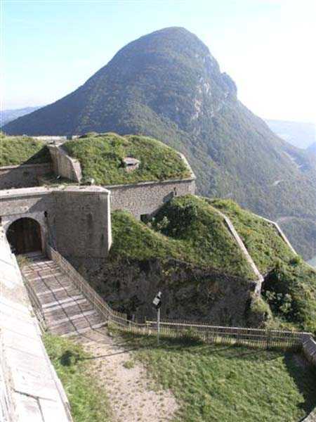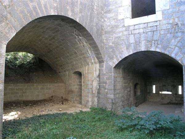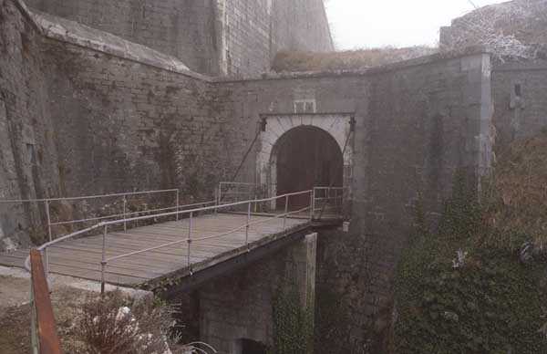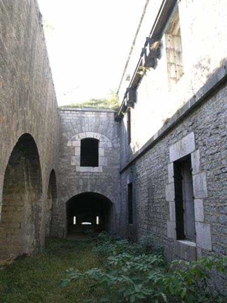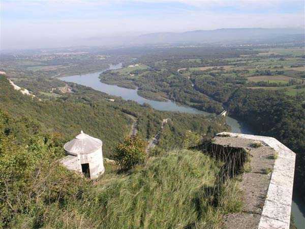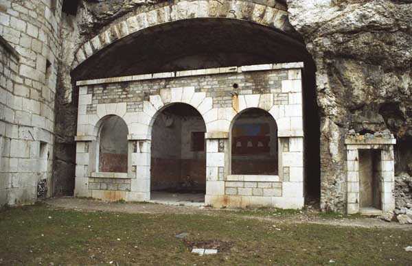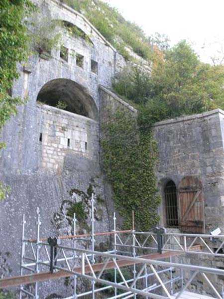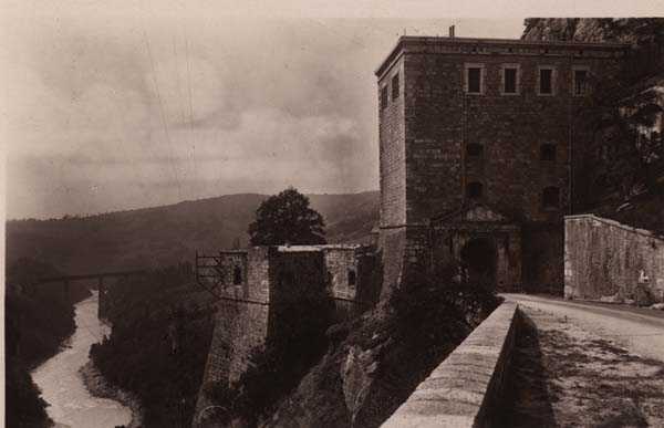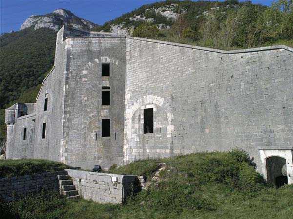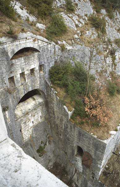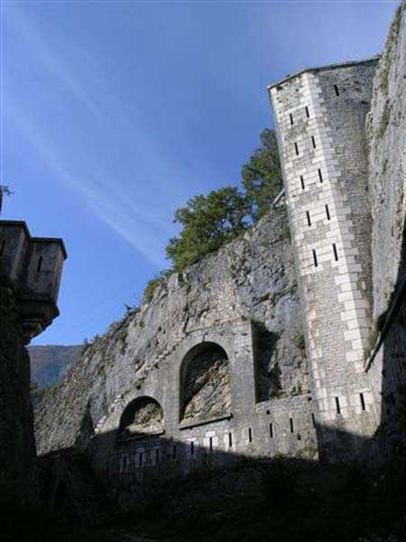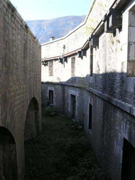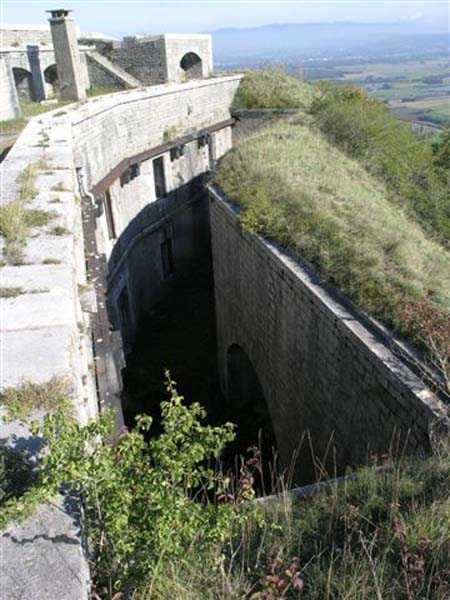 Dept 01 (Ain) Jura curtain. ± 425 m/alt. About 40 km south of the fortress of Les Rousses, this site, occupied militarily since the 13th century, is an important road and railway passage inland from Geneva, a passage used by the Rhône. The name itself is a deformation of "La cluse" and the road, moreover, crossed the 2 drawbridges of the lower fort. The current fortification consists of 2 distinct forts, the Lower and the Upper (or inférieur and supérieur) connected by a gallery dug into the rock, a gallery protecting a staircase of 1,165 steps overcoming a difference in height of about 200 m. The construction of the lower fort dates back to the 17th and 18th centuries but it was dismantled in 1815 and rebuilt from 1816 to 1828. In 1815, France lost the left bank of the Rhône and with it the possibility of fortifying the opposite Mont Vuache (1101 m/alt). The upper fort, for its part, was built from 1834 to 1848 and reinforced from 1885 to 1887. The elements of interest to this index are found in the ensemble formed by the two forts and their junction. The lower fort, whose accesses are controlled by Bélidor drawbridges, underwent few transformations after 1874; in fact, one had to wait until 1886 to see a two-story barracks with four bays dug into the rock at the level of the upper courtyard. This barracks, whose rooms are separated by thick rock piers, includes, on the ground floor, a bread oven, while in the circulation corridor of the 1st floor opens a gallery leading to the Maginot casemate sweeping the road tunnel of the Lyon-Geneva route, a tunnel dug into the rock above the lower fort in 1937. The windows of the rooms and related premises are as many small tunnels dug into the rock. Let us note for the record that an old powder magazine received some fittings including a lamp embrasure as well as the presence of an original mechanism for operating a portcullis and a pretty sundial bearing the motto "Toujours l’ennemi s’use devant le fort l’Écluse". The improvements to the upper fort are clearly more visible. This upper fort is quite complex and includes multiple levels. The most spectacular element is undoubtedly the corner tower of the two ditches (the rest of the perimeter consists of a cliff), a tower whose ground floor, independent of the floors, serves as a double counterscarp casemate. The upper floors can only be reached by a staircase with a cut communicating with the bottom of the ditch. Beyond the cut, a postern gives onto a staircase serving five levels of loopholes before giving access to a firing gallery which itself serves three casemates with reverse fire dug into the rock. The lower floor, the counterscarp casemate, communicates via a staircase passing under the ditch with the upper fort. Note that a second casemate, attached to the scarp of the gorge front, sweeps a third ditch located one level lower than those defended by the tower. This upper fort possesses, from the outset, twice four Haxo casemates distributed over several levels. The fort completed in 1848 had a barracks (1836) in chevron shape whose two wings each aligned three rooms on two levels. The angle of the chevron was occupied by other premises, including the main access staircase, the barracks being located much higher than the fort entrance. The barracks, facing French territory, was not covered. In 1886-87, it was left with a narrow light well courtyard on the flank of which four casemates aimed at Mont Vuache were built. The two inner casemates were devoted to direct fire, the outer ones to indirect fire. The mass of covering earth of these casemates did not reach the height of that covering the barracks, also, in order to be able to armor the ceiling of the courtyard, two enormous cast-iron consoles per room were embedded in the facade of the barracks. The short sides of the courtyard will be arranged as a caponier flank with, which is rare but imposed by the necessity of achieving plunging fire, stepped embrasures. The roof of the barracks is arranged as an infantry position from where the views are splendid and extend to Lake Geneva and the alpine massif. Two of the numerous embrasures of the barracks show a pivot pin with a metal arc sealed in the ground, an arc 90 cm long and sealed 75 cm from the pin. We do not know which mount and which armament could be installed there but similar devices will be spotted in front of some embrasures of the junction. Let us finally note in this barracks a frame of a Vaillant stove, the ruins of a bread oven, two lines of three latrines and a magnificent triple stone sentry box. The highest of the direct fire casemates, located at the level of the fort entrance, singularly includes a sink, a toilet, and a chronogram 1887. It is likely that this is more of a "Séré de Rivières" direct fire casemate than a "Haxo" casemate, given that the architectural differences between the two models are rather tenuous. It is in this casemate that the staircase leading back to the lower fort begins. The junction comprises nine levels of casemates totaling sixteen casemates of which seven are oriented towards Switzerland, five towards Mont Vuache and four downstream. There are also, besides several terraces, a vast cavern shelter for 70 men, a powder magazine, a loading workshop, three magazines for made ammunition and a magazine for 260,000 infantry cartridges. Each casemate level was assigned a number increasing from the upper fort. Thus battery 1 = 1 casemate (upstream), batteries 2 and 3 likewise; battery 4 = 1 casemate (downstream); then the numbers resume at battery 10: 1 casemate but 2 firing directions (downstream and Vuache), 11: 3 casemates (2 upstream, 1 Vuache), 12: 2 casemates with, each, two embrasures (2 downstream, 2 Vuache), no no. 13 and, finally, number 14: 3 casemates (1 Vuache, 2 upstream). It will be understood, each casemate level has its own magazine. These magazines are built in a niche dug into the rock and are therefore independent
