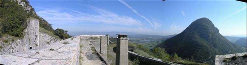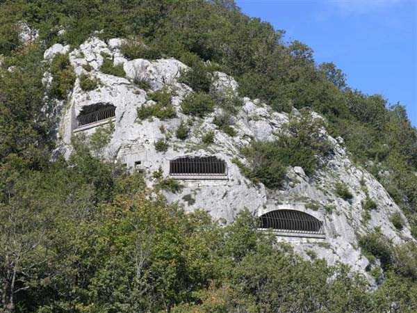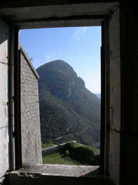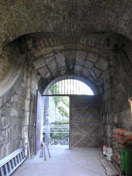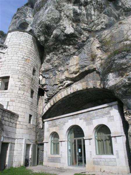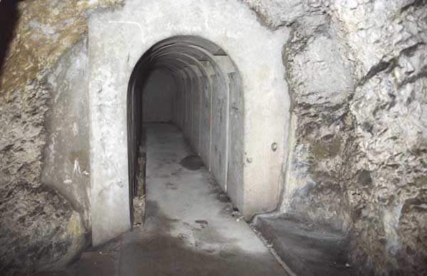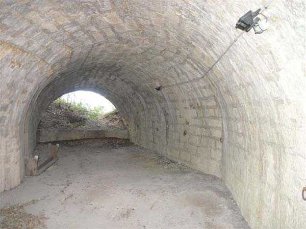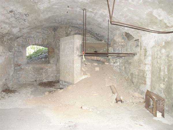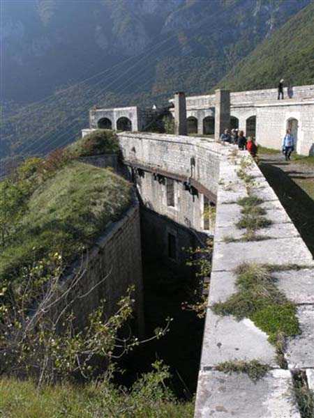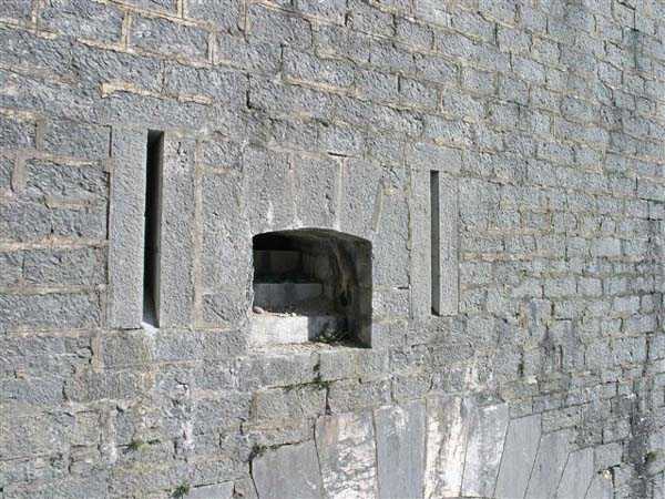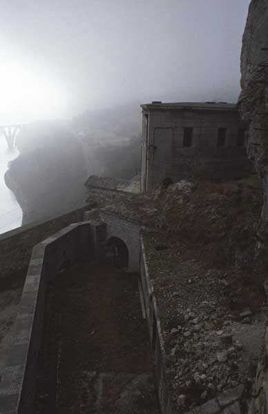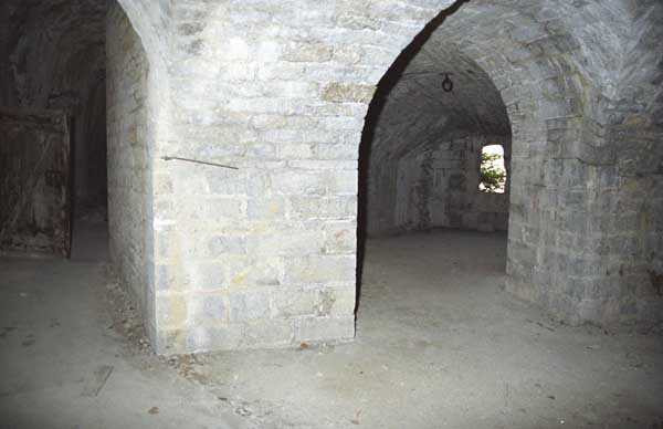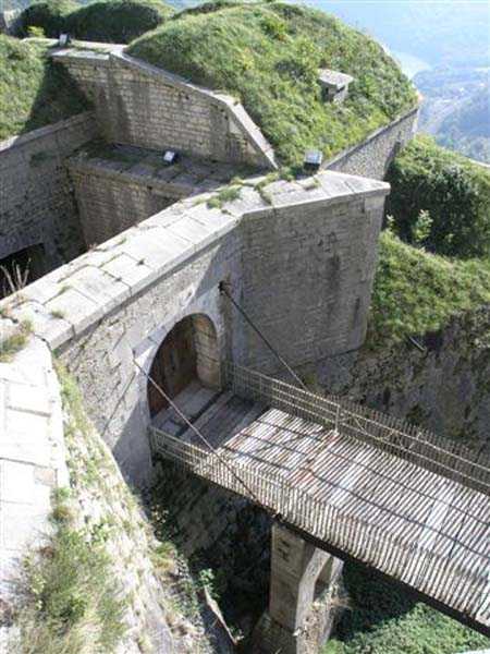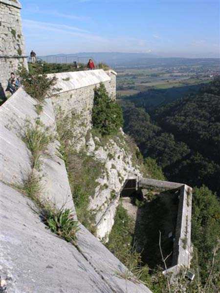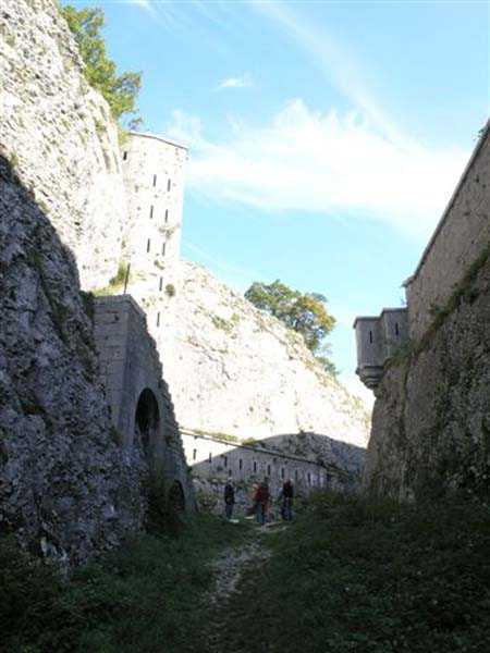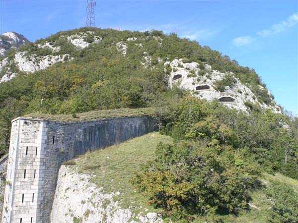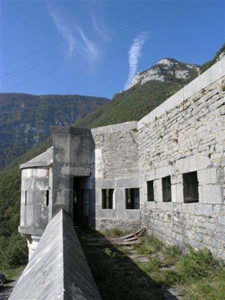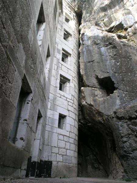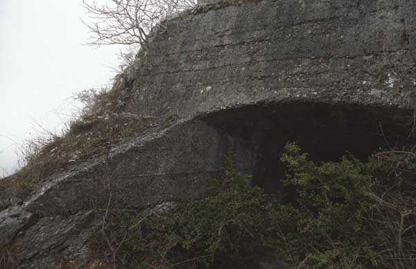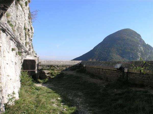 Dept 01 (Ain) Jura curtain. ± 425 m/alt. About 40 km south of the fortress of Les Rousses, this site, occupied militarily since the 13th century, is an important road and railway passage inland from Geneva, a passage used by the Rhône. The name itself is a deformation of "La cluse" and the road, moreover, crossed the 2 drawbridges of the lower fort. The current fortification consists of 2 distinct forts, the Lower and the Upper (or inférieur and supérieur) connected by a gallery dug into the rock, a gallery protecting a staircase of 1,165 steps overcoming a difference in height of about 200 m. The construction of the lower fort dates back to the 17th and 18th centuries but it was dismantled in 1815 and rebuilt from 1816 to 1828. In 1815, France lost the left bank of the Rhône and with it the possibility of fortifying the opposite Mont Vuache (1101 m/alt). The upper fort, for its part, was built from 1834 to 1848 and reinforced from 1885 to 1887. The elements of interest to this index are found in the ensemble formed by the two forts and their junction. The lower fort, whose accesses are controlled by Bélidor drawbridges, underwent few transformations after 1874; in fact, one had to wait until 1886 to see a two-story barracks with four bays dug into the rock at the level of the upper courtyard. This barracks, whose rooms are separated by thick rock piers, includes, on the ground floor, a bread oven, while in the circulation corridor of the 1st floor opens a gallery leading to the Maginot casemate sweeping the road tunnel of the Lyon-Geneva route, a tunnel dug into the rock above the lower fort in 1937. The windows of the rooms and related premises are as many small tunnels dug into the rock. Let us note for the record that an old powder magazine received some fittings including a lamp embrasure as well as the presence of an original mechanism for operating a portcullis and a pretty sundial bearing the motto "Toujours l’ennemi s’use devant le fort l’Écluse". The improvements to the upper fort are clearly more visible. This upper fort is quite complex and includes multiple levels. The most spectacular element is undoubtedly the corner tower of the two ditches (the rest of the perimeter consists of a cliff), a tower whose ground floor, independent of the floors, serves as a double counterscarp casemate. The upper floors can only be reached by a staircase with a cut communicating with the bottom of the ditch. Beyond the cut, a postern gives onto a staircase serving five levels of loopholes before giving access to a firing gallery which itself serves three casemates with reverse fire dug into the rock. The lower floor, the counterscarp casemate, communicates via a staircase passing under the ditch with the upper fort. Note that a second casemate, attached to the scarp of the gorge front, sweeps a third ditch located one level lower than those defended by the tower. This upper fort possesses, from the outset, twice four Haxo casemates distributed over several levels. The fort completed in 1848 had a barracks (1836) in chevron shape whose two wings each aligned three rooms on two levels. The angle of the chevron was occupied by other premises, including the main access staircase, the barracks being located much higher than the fort entrance. The barracks, facing French territory, was not covered. In 1886-87, it was left with a narrow light well courtyard on the flank of which four casemates aimed at Mont Vuache were built. The two inner casemates were devoted to direct fire, the outer ones to indirect fire. The mass of covering earth of these casemates did not reach the height of that covering the barracks, also, in order to be able to armor the ceiling of the courtyard, two enormous cast-iron consoles per room were embedded in the facade of the barracks. The short sides of the courtyard will be arranged as a caponier flank with, which is rare but imposed by the necessity of achieving plunging fire, stepped embrasures. The roof of the barracks is arranged as an infantry position from where the views are splendid and extend to Lake Geneva and the alpine massif. Two of the numerous embrasures of the barracks show a pivot pin with a metal arc sealed in the ground, an arc 90 cm long and sealed 75 cm from the pin. We do not know which mount and which armament could be installed there but similar devices will be spotted in front of some embrasures of the junction. Let us finally note in this barracks a frame of a Vaillant stove, the ruins of a bread oven, two lines of three latrines and a magnificent triple stone sentry box. The highest of the direct fire casemates, located at the level of the fort entrance, singularly includes a sink, a toilet, and a chronogram 1887. It is likely that this is more of a "Séré de Rivières" direct fire casemate than a "Haxo" casemate, given that the architectural differences between the two models are rather tenuous. It is in this casemate that the staircase leading back to the lower fort begins. The junction comprises nine levels of casemates totaling sixteen casemates of which seven are oriented towards Switzerland, five towards Mont Vuache and four downstream. There are also, besides several terraces, a vast cavern shelter for 70 men, a powder magazine, a loading workshop, three magazines for made ammunition and a magazine for 260,000 infantry cartridges. Each casemate level was assigned a number increasing from the upper fort. Thus battery 1 = 1 casemate (upstream), batteries 2 and 3 likewise; battery 4 = 1 casemate (downstream); then the numbers resume at battery 10: 1 casemate but 2 firing directions (downstream and Vuache), 11: 3 casemates (2 upstream, 1 Vuache), 12: 2 casemates with, each, two embrasures (2 downstream, 2 Vuache), no no. 13 and, finally, number 14: 3 casemates (1 Vuache, 2 upstream). It will be understood, each casemate level has its own magazine. These magazines are built in a niche dug into the rock and are therefore independent