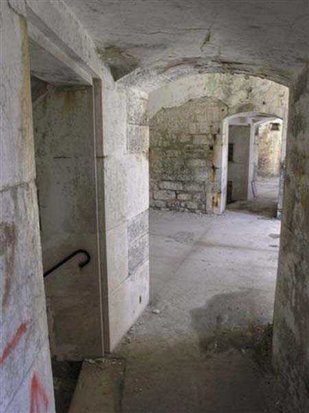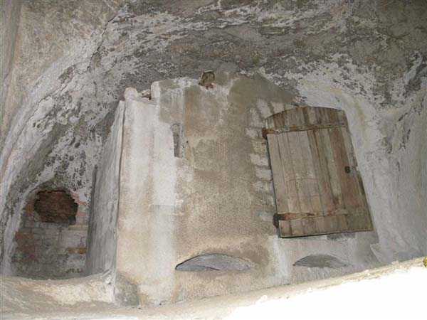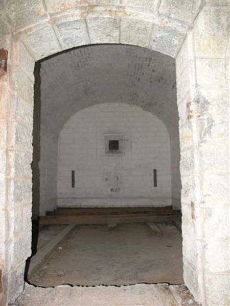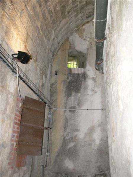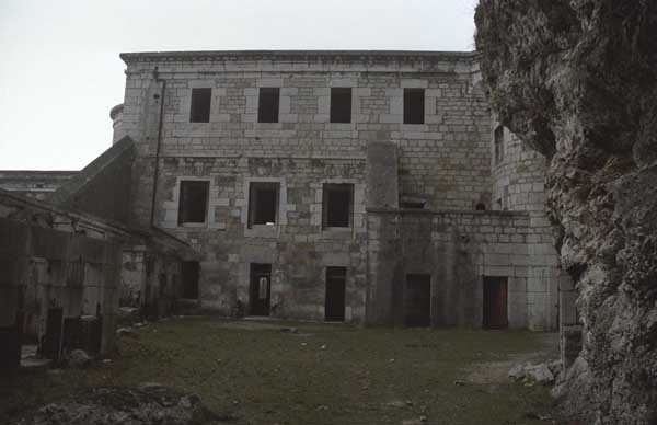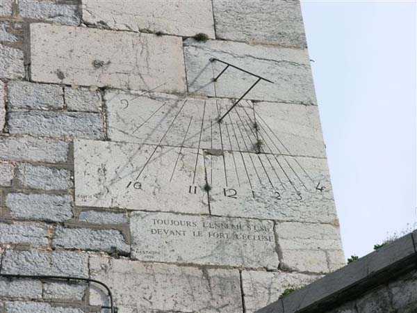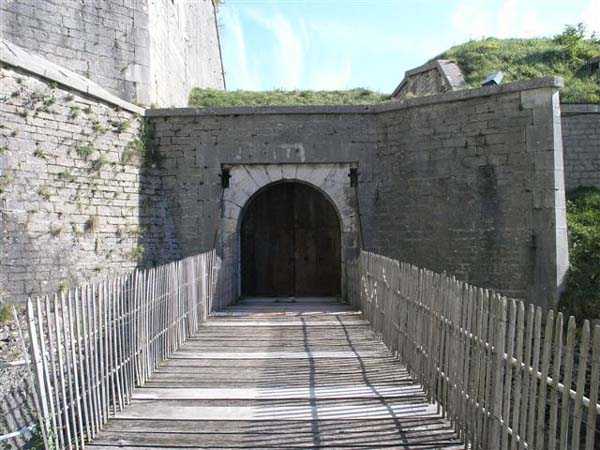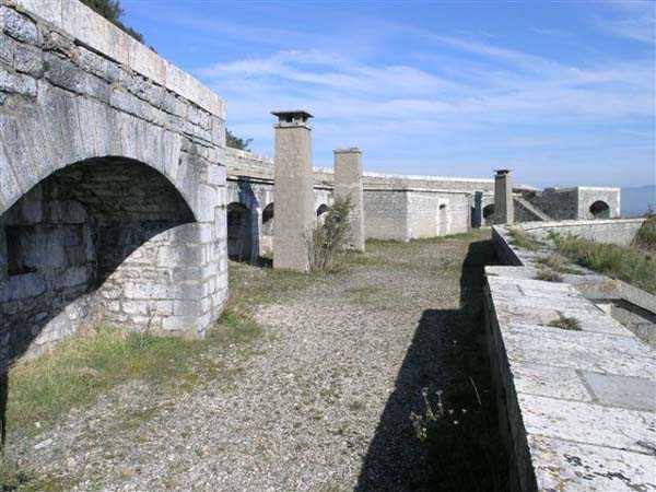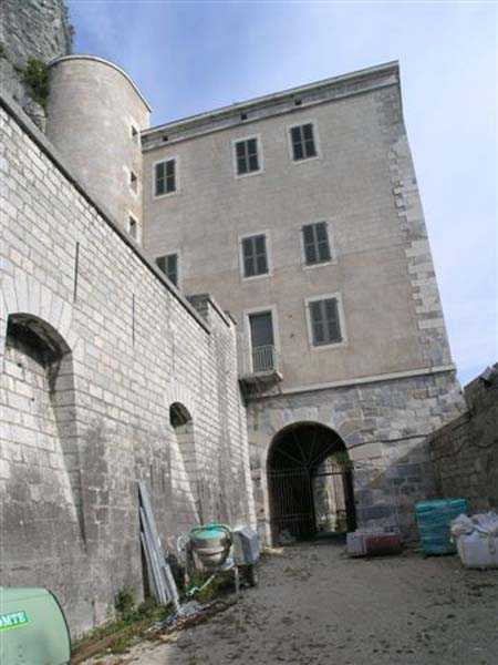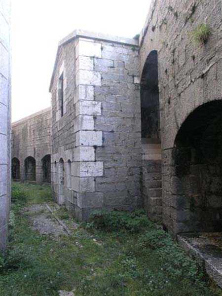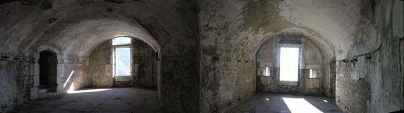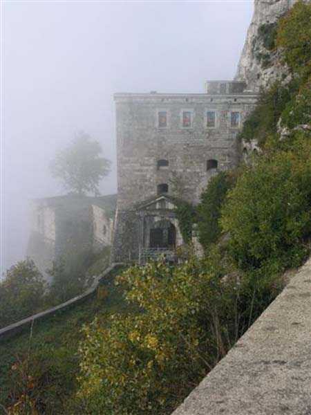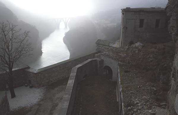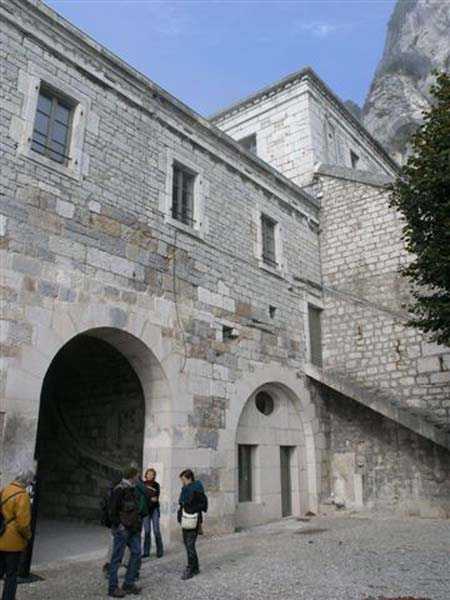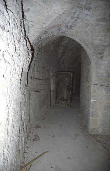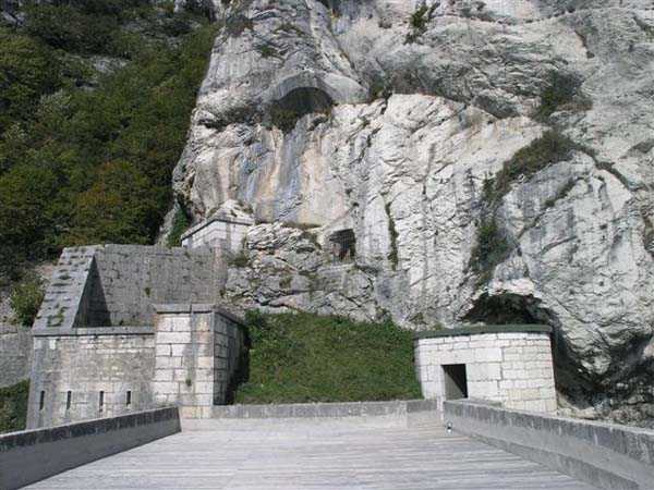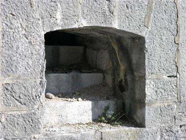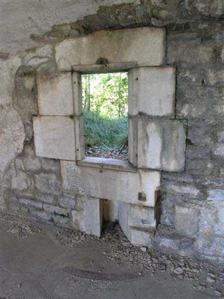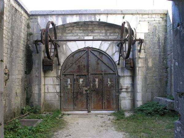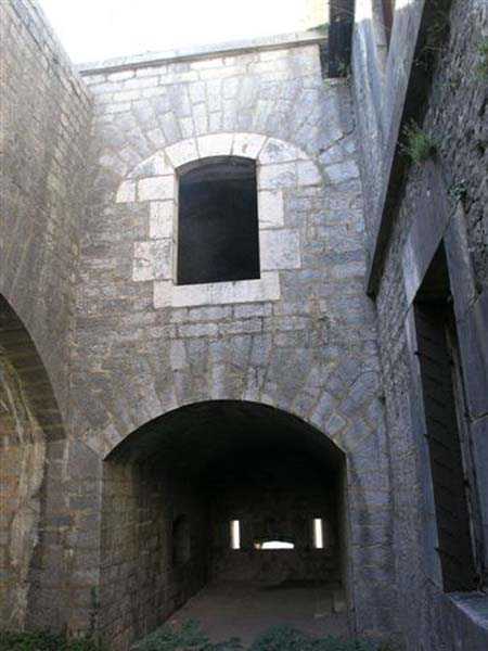 Dept 01 (Ain) Jura curtain. ± 425 m/alt. About 40 km south of the fortress of Les Rousses, this site, occupied militarily since the 13th century, is an important road and railway passage inland from Geneva, a passage used by the Rhône. The name itself is a deformation of "La cluse" and the road, moreover, crossed the 2 drawbridges of the lower fort. The current fortification consists of 2 distinct forts, the Lower and the Upper (or inférieur and supérieur) connected by a gallery dug into the rock, a gallery protecting a staircase of 1,165 steps overcoming a difference in height of about 200 m. The construction of the lower fort dates back to the 17th and 18th centuries but it was dismantled in 1815 and rebuilt from 1816 to 1828. In 1815, France lost the left bank of the Rhône and with it the possibility of fortifying the opposite Mont Vuache (1101 m/alt). The upper fort, for its part, was built from 1834 to 1848 and reinforced from 1885 to 1887. The elements of interest to this index are found in the ensemble formed by the two forts and their junction. The lower fort, whose accesses are controlled by Bélidor drawbridges, underwent few transformations after 1874; in fact, one had to wait until 1886 to see a two-story barracks with four bays dug into the rock at the level of the upper courtyard. This barracks, whose rooms are separated by thick rock piers, includes, on the ground floor, a bread oven, while in the circulation corridor of the 1st floor opens a gallery leading to the Maginot casemate sweeping the road tunnel of the Lyon-Geneva route, a tunnel dug into the rock above the lower fort in 1937. The windows of the rooms and related premises are as many small tunnels dug into the rock. Let us note for the record that an old powder magazine received some fittings including a lamp embrasure as well as the presence of an original mechanism for operating a portcullis and a pretty sundial bearing the motto "Toujours l’ennemi s’use devant le fort l’Écluse". The improvements to the upper fort are clearly more visible. This upper fort is quite complex and includes multiple levels. The most spectacular element is undoubtedly the corner tower of the two ditches (the rest of the perimeter consists of a cliff), a tower whose ground floor, independent of the floors, serves as a double counterscarp casemate. The upper floors can only be reached by a staircase with a cut communicating with the bottom of the ditch. Beyond the cut, a postern gives onto a staircase serving five levels of loopholes before giving access to a firing gallery which itself serves three casemates with reverse fire dug into the rock. The lower floor, the counterscarp casemate, communicates via a staircase passing under the ditch with the upper fort. Note that a second casemate, attached to the scarp of the gorge front, sweeps a third ditch located one level lower than those defended by the tower. This upper fort possesses, from the outset, twice four Haxo casemates distributed over several levels. The fort completed in 1848 had a barracks (1836) in chevron shape whose two wings each aligned three rooms on two levels. The angle of the chevron was occupied by other premises, including the main access staircase, the barracks being located much higher than the fort entrance. The barracks, facing French territory, was not covered. In 1886-87, it was left with a narrow light well courtyard on the flank of which four casemates aimed at Mont Vuache were built. The two inner casemates were devoted to direct fire, the outer ones to indirect fire. The mass of covering earth of these casemates did not reach the height of that covering the barracks, also, in order to be able to armor the ceiling of the courtyard, two enormous cast-iron consoles per room were embedded in the facade of the barracks. The short sides of the courtyard will be arranged as a caponier flank with, which is rare but imposed by the necessity of achieving plunging fire, stepped embrasures. The roof of the barracks is arranged as an infantry position from where the views are splendid and extend to Lake Geneva and the alpine massif. Two of the numerous embrasures of the barracks show a pivot pin with a metal arc sealed in the ground, an arc 90 cm long and sealed 75 cm from the pin. We do not know which mount and which armament could be installed there but similar devices will be spotted in front of some embrasures of the junction. Let us finally note in this barracks a frame of a Vaillant stove, the ruins of a bread oven, two lines of three latrines and a magnificent triple stone sentry box. The highest of the direct fire casemates, located at the level of the fort entrance, singularly includes a sink, a toilet, and a chronogram 1887. It is likely that this is more of a "Séré de Rivières" direct fire casemate than a "Haxo" casemate, given that the architectural differences between the two models are rather tenuous. It is in this casemate that the staircase leading back to the lower fort begins. The junction comprises nine levels of casemates totaling sixteen casemates of which seven are oriented towards Switzerland, five towards Mont Vuache and four downstream. There are also, besides several terraces, a vast cavern shelter for 70 men, a powder magazine, a loading workshop, three magazines for made ammunition and a magazine for 260,000 infantry cartridges. Each casemate level was assigned a number increasing from the upper fort. Thus battery 1 = 1 casemate (upstream), batteries 2 and 3 likewise; battery 4 = 1 casemate (downstream); then the numbers resume at battery 10: 1 casemate but 2 firing directions (downstream and Vuache), 11: 3 casemates (2 upstream, 1 Vuache), 12: 2 casemates with, each, two embrasures (2 downstream, 2 Vuache), no no. 13 and, finally, number 14: 3 casemates (1 Vuache, 2 upstream). It will be understood, each casemate level has its own magazine. These magazines are built in a niche dug into the rock and are therefore independent