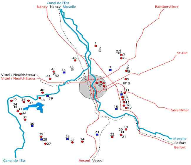 Dept 88 (Vosges) Southern pivot of the Charmes gap and connected to the Belfort fortified camp by the curtain of the upper Moselle, the Epinal fortified camp was, in 1914, one of the most modern in the country. 17 forts including 7 modernized, nearly 70 batteries, 12 combat shelters, 30 redoubts, 3 central stores, 5 sector stores, 7 intermediate depots, 3 optical posts, 8 barracks, 1 military hospital, 1 airfield, 1 aerostatic park; ± 600 artillery pieces for a garrison of 17,000 men in peacetime, garrison amounting to nearly 70,000 men in wartime. However, it was not until May 24, 1878 that the decision to make Epinal a front-line position was ratified. Some time before the First World War, it was decided to consider groups of batteries, redoubts, combat shelters, etc., around a fort or structure, as centers of resistance. Given the complexity of the fortress of Épinal, the details of these centers are not included in the index.