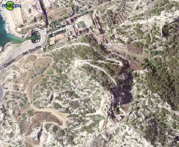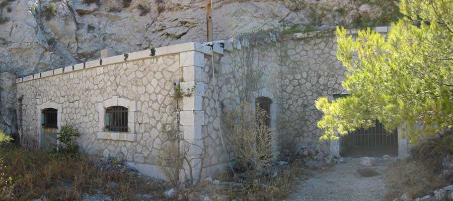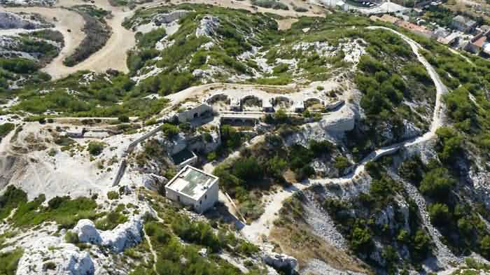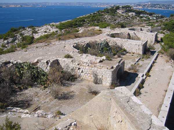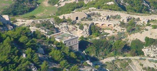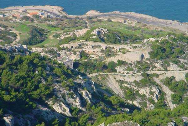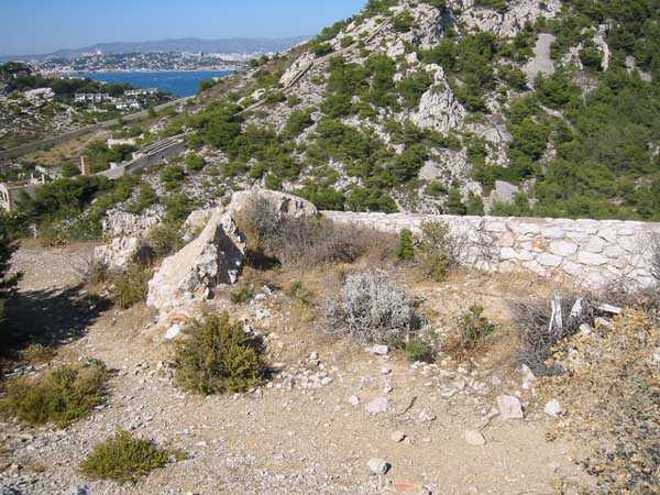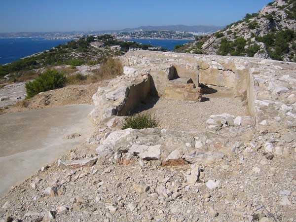 Fortress of Marseille, south of the city. 85 m/asl. Located about 500 m south of the battery of Mont Rose, it consists of four emplacements for 4 G guns 240 Mle 1884 on G PC carriage. The front of these emplacements constitutes the ceiling slab of a series of sheds. South of the line, we find a rather large magazine into which a hoist head emerges. A few meters south-east and to the rear, we find a modified structure that may have been a tower Mle 1846 whose platform has been partially levelled but whose stairway exit on the roof is, on the other hand, still visible. Finally, about forty meters further south, remain 4 emplacements for as many 95 Mle 1888 guns on G Mle 1904 carriage, grouped in pairs with a small traverse having a niche for safety shots. Note that the covered way connecting the two batteries was dug into the rock. A rock magazine, has its only entrance facing the old tower, which served as barracks. We note that this battery does not seem to have any concrete. The traverses are made of rubble masonry and, except for a niche at the root of each, they are solid. Today (10/2005), the whole is in a very good state of preservation but the tower and the rock magazine are fitted with deterrent grids. The site is apparently freely accessible.