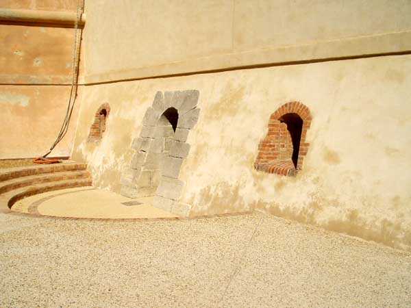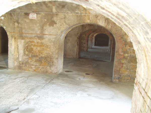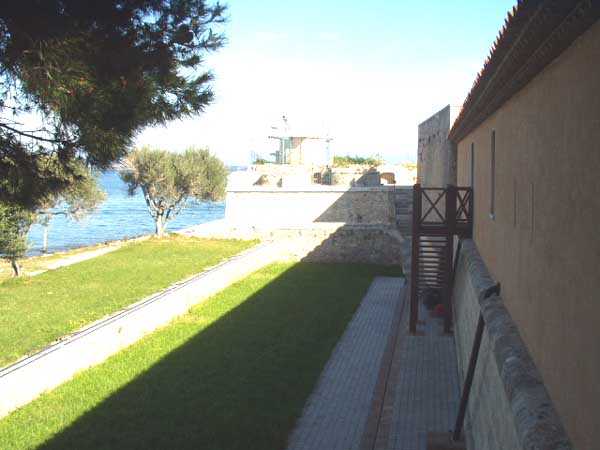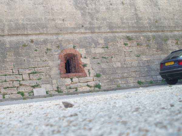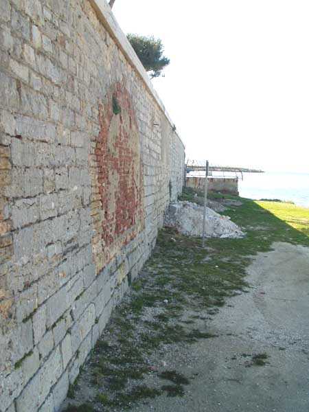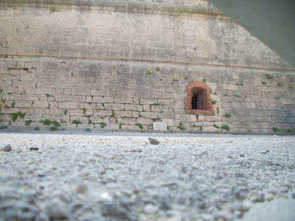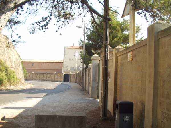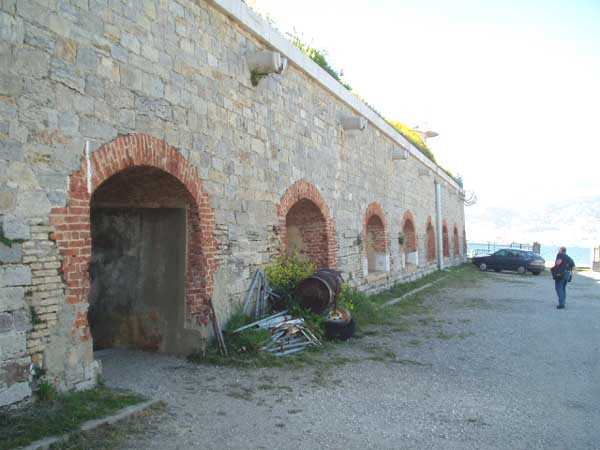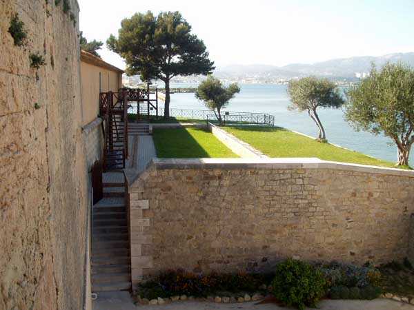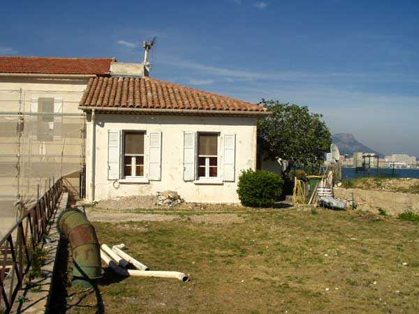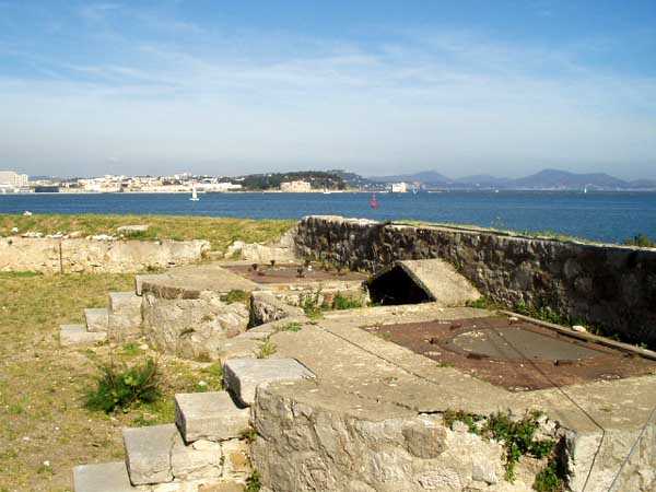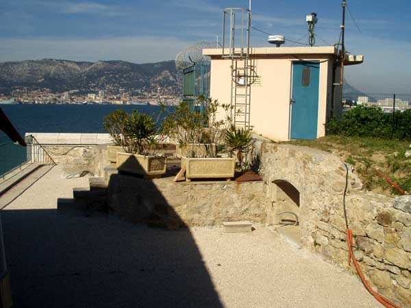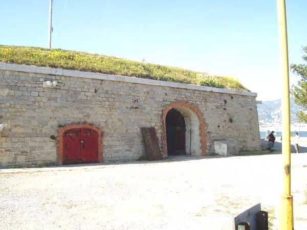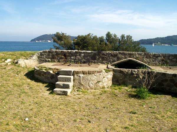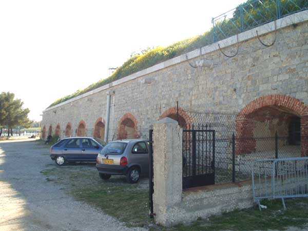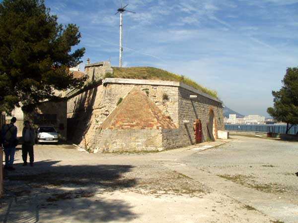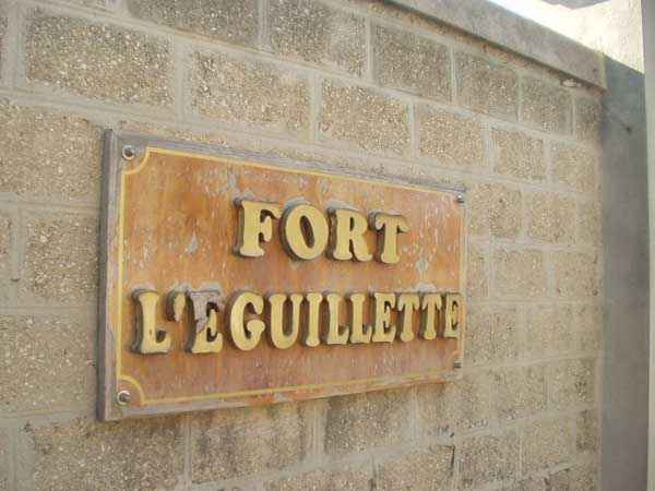 Fortress of Toulon, south of the city. At sea level. Old fort in the shape of a large chevron with long casemated batteries modified in 1845 and 1860. It was still armed on the eve of its declassification, in 1877, with 18 cannons including 14 smoothbore. Later, it was rearmed with the installation of two 47 mm quick fire guns at each of its ends, guns whose carriage sub-seats still remain today (04/2006). Long abandoned, this fort has been under restoration for several years by the Tremplin association which, with socially disadvantaged youth, carries out superb work there. Often spelled "Aiguillette" or, more rarely, "Éguillette".