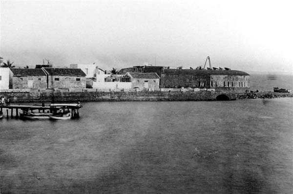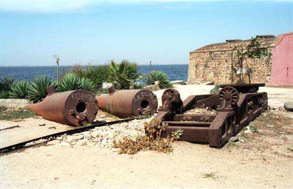 Gorée. In 1852, Commander Pinet-Laprade, Chief of Engineers for Senegal, is tasked with building a battery on the northern point of Gorée. At this location, at that time, only a simple earth parapet is found. He drew up the plans for the work in 1849, following the directives of the Committee of Colonial Fortifications. This "grazing" battery will be the counterpart to the fort of the Castel, whose batteries carry out bombardment fire. Designed to carry 12 large-caliber guns, the fort is ready to receive its armament in 1856. It is a closed battery, circular in shape, with a defensive redoubt. Due to the shortage of artillery pieces, only 5 22 cm gun-howitzers can be assigned to it. This armament will evolve slowly, at the same pace as that of the Castel. In 1881, the Admiralty Council proposes a modernization of the battery, which will finally be equipped with modern materials, namely guns 240 mm Mle 1870 on carriage Mle 1876, then Mle 1876.T.83 PA. In 1897, the fort is only armed with 4 guns 47 mm TR (quick fire), the mission of the large-caliber pieces being taken over by the North battery of the Castel. It does not appear on the armament states of 1914. In 1939, it receives a pass defense section, armed with 2 guns 75 mm Mle 1897 on field carriage adapted for coast firing, and machine guns. In September 1940, one of these machine guns fires on the launch transporting the parliamentarians sent by General de Gaulle. At the same time, the 75s have been replaced by 3 guns 90 mm Mle 1877 on carriage 1916. Those of the nearby East section have been replaced by 2 guns of the same model, which will fire on British ships. It seems that the battery of 75 mm CA Mle 22, installed in 1942 at Gorée, is located on and around the fort, as shown by a poor-quality photo taken in 1945. Today, Fort d'Estrées houses a historical museum and some cannons, unrelated to the work, installed as "flowerpots" on the artillery platform. The most interesting part is outside, where one finds a row of barrels 240 mm Mle 1870, as well as two inverted chassis of carriage Mle 1876.T.83 PA. Also called "Battery of the North Point". JJM 10/08/2008