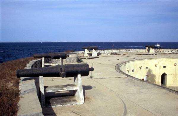 Gorée. 1852 wird Kommandant Pinet-Laprade, Chef des Genies für Senegal, mit dem Bau einer Batterie auf der Nordspitze von Gorée beauftragt. Zu dieser Zeit findet man an diesem Standort nur einen einfachen Erdwall. Er hat die Pläne des Werkes 1849 erstellt, entsprechend den Richtlinien des Komitees für die Fortifikationen der Kolonien. Diese "streichende" Batterie wird das Gegenstück zur Festung des Castel sein, deren Batterien einen Bombardementsbeschuss ausführen. Für die Aufnahme von 12 Kanonen großen Kalibers konzipiert, ist das Fort 1856 in der Lage, seine Bewaffnung zu empfangen. Es ist eine geschlossene Batterie, kreisförmig, mit Verteidigungsreduit. Wegen des Mangels an Artilleriegeschützen kann man ihm nur 5 22-cm-Kanonenhaubitzen zuweisen. Diese Bewaffnung wird sich langsam entwickeln, im gleichen Rhythmus wie die des Castel. 1881 schlägt der Admiralitätsrat eine Modernisierung der Batterie vor, die endlich mit modernem Material ausgestattet wird, nämlich Kanonen 240 mm Mle 1870 auf Lafette Mle 1876, dann Mle 1876.T.83 PA. 1897 ist das Fort nur noch mit 4 Kanonen 47 mm TR (Schnellfeuer) bewaffnet, die Aufgabe der großkalibrigen Geschütze wird von der Nordbatterie des Castel übernommen. Es erscheint nicht in den Bewaffnungsständen von 1914. 1939 erhält es eine Sektion zur Verteidigung der Pässe, bewaffnet mit 2 Kanonen 75 mm Mle 1897 auf Feldlafette, geeignet für den Küstenbeschuss, und Maschinengewehren. Im September 1940 feuert eines dieser Maschinengewehre auf das Motorboot, das die Parlamentarier, gesandt von General de Gaulle, transportiert. Zur gleichen Zeit wurden die 75er durch 3 Kanonen 90 mm Mle 1877 auf Lafette 1916 ersetzt. Die der nahegelegenen Ost-Sektion wurden durch 2 Kanonen desselben Modells ersetzt, die auf britische Schiffe schießen werden. Es scheint, dass die Batterie 75 mm CA Mle 22, 1942 in Gorée installiert, auf und um das Fort herum installiert ist, wie ein schlechtes, 1945 aufgenommenes Foto zeigt. Heutzutage beherbergt das Fort d'Estrées ein historisches Museum und einige Kanonen, ohne Bezug zum Werk, die als "Blumentöpfe" auf der Artillerieplattform aufgestellt sind. Das Interessanteste ist außen, wo man eine Reihe von Rohren 240 mm Mle 1870 findet, sowie zwei umgedrehte Fahrgestelle von Lafette Mle 1876.T.83 PA. Auch "Batterie der Nordspitze" genannt. JJM 10/08/2008