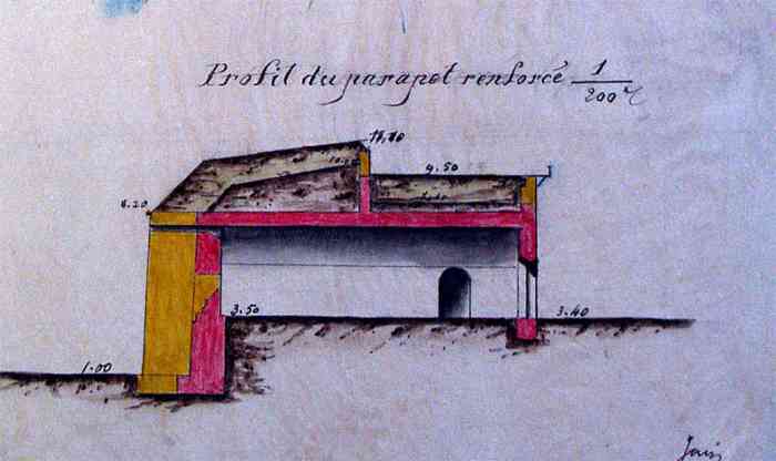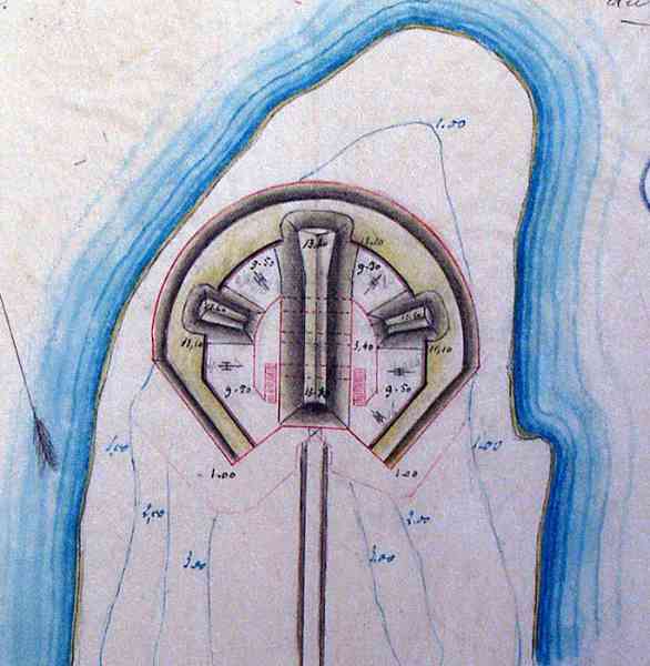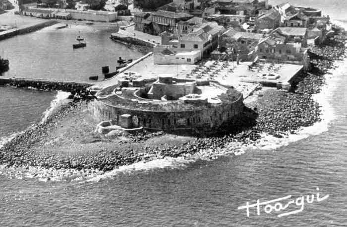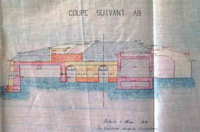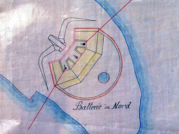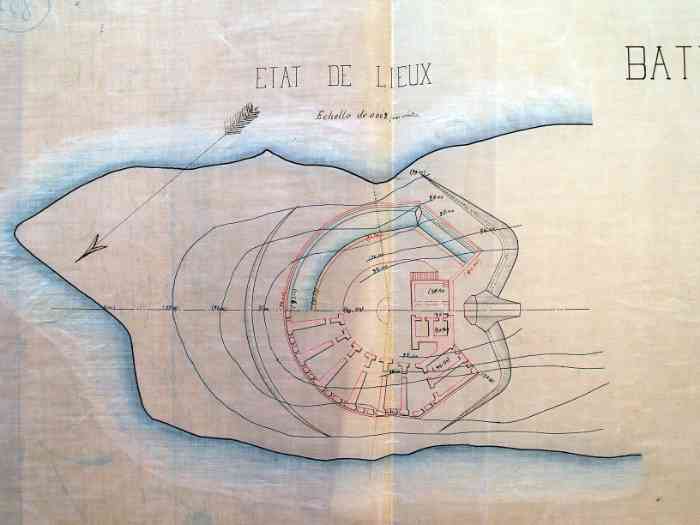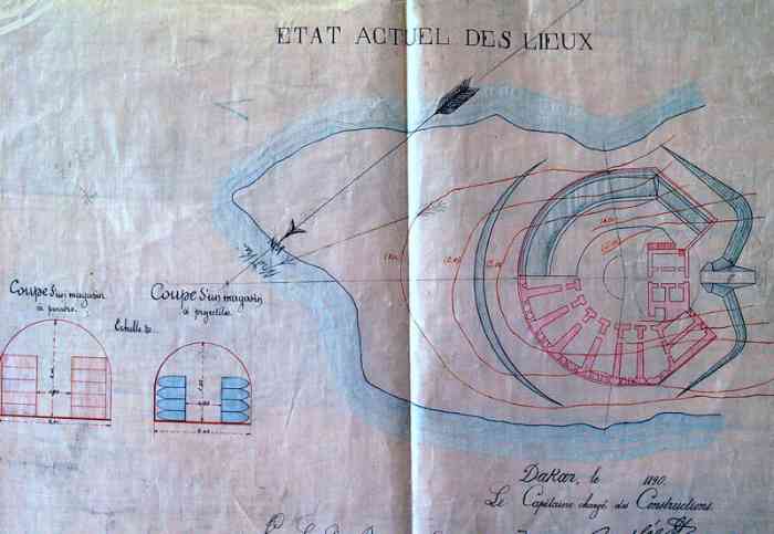 In 1852, Commandant Pinet-Laprade, head of the Engineers for Senegal, is tasked with building a battery on the North point of Gorée. At that time, only a simple earth parapet is found at this location. He had drawn up the plan of the work in 1849, in accordance with the directives of the fortifications committee of the colonies. This low-trajectory battery will be the counterpart of those of the Castel, which fire high-trajectory bombardment fire. It is christened Fort d'Estrées. It is a closed battery, circular in shape, with a defensive keep. Designed to carry twelve heavy guns, it receives its armament from 1856. But at that time, only five 22 cm gun-howitzers can be assigned to it. In 1870, the battery is armed with twelve 16 cm guns Mle 1858-60. In 1897, the fort is only armed with four 47 mm TR guns, the mission of the heavy pieces being taken over by that of the North battery of the castel. It no longer appears in the 1914 armament state. In 1939, it receives a harbour entrance defence section, armed with two 75 mm guns Mle 1897 on field mounting adapted for coast fire and machine guns. In September 1940, one of these fires on the motor launch of the parliamentarians sent by General de Gaulle. At the same time, the 75 mm guns were replaced by three 90 mm guns Mle 1877 on mounting 1916. Those of the east section, placed nearby, are replaced by two of these same guns, which will fire on British ships. In 1942, a battery of four 75 mm AA guns Mle 1922 is installed on and around the fort. Nowadays, the fort houses a museum. Ten 16 cm guns Mle 1858-60, recovered at the foot of the Castel cliff, are installed on the artillery platform. On the esplanade, in front of the fort, a dozen gun barrels and two pieces of mountings are still present. Here are the details: