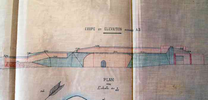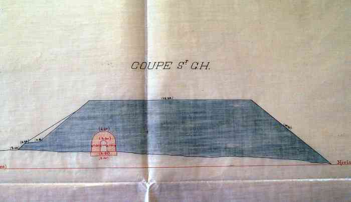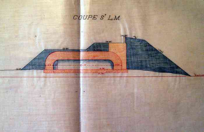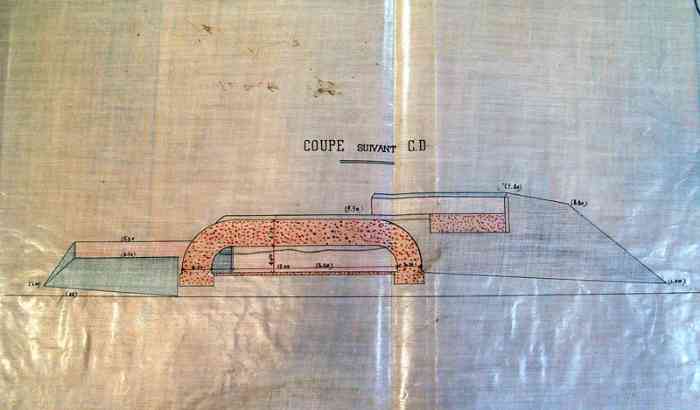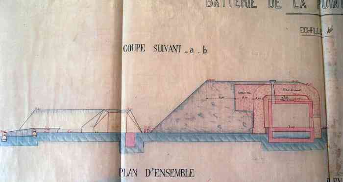 With the exception of the four repatriated 240 mm barrels Mle 1870-87 and the 16 cm guns Mle 1858-60, this is the totality of the barrels that armed or had armed the Castel, before the 1907 reorganisation. They were presumably brought down on that occasion, to clear the way before the work. As for the mountings, relatively easy to cut with rudimentary tools, unlike the barrels, they were certainly scrapped. A mounting stool Mle 1899 PC for 240 mm gun Mle 1870, and a Péchot bogie for 60 cm gauge railway, were discovered in 2017, and cleared from the sand. The mounting stool probably comes from the mounting Mle 1899 of the 240 mm gun Mle 1870 on PC mounting of bastion 5 of the Castel. At the foot of the west cliff of the said Castel, one can also see at least four 16 cm barrels Mle 1858-60, several pieces of mounting, and the cradles of the two 240 mm "colonies" barrels from the Castel turret. Not to mention other elements probably present beneath the surface.