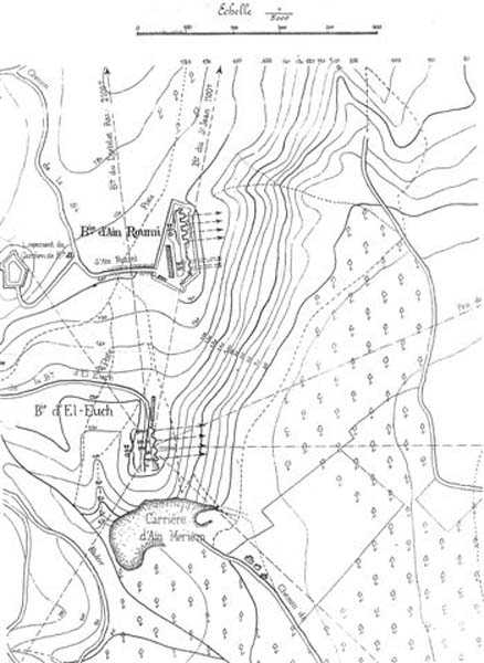 Bizerta. Tato baterie, která je součástí programu 1900, leží v kótě 120, 2500 metrů severně od Bizerty a 1500 metrů od břehu. Dílo, jako všechna třetí generace, nemá kapesní skladiště. Je to řada 4 plošin, oddělených betonovými bojovými úkryty, podle modelu přijatého CEPAC v roce 1901. V prodloužení se nachází skladiště střel, které zásobuje děla sítí 40 cm kolejí, následované provozními a ubytovacími prostorami. Dílo je vyzbrojeno 4 děly G 240 Mle 1884 vhodnými pro lafetu G 1901 a nemá pomocnou baterii. Postavené na úzkém skalním hřebeni, je velmi málo zranitelné palbou z širého moře. 29. dubna 1903 provedla baterie na moři brilantní střeleckou ukázku na počest prezidenta republiky Émila Loubeta a osobností, které jej doprovázely při jeho návštěvě Bizerty. Tato epizoda se dostala na titulní stranu Petit Parisien, který publikoval litografii, jež měla událost představovat. Zatímco zobrazení Bizerty je dosti přesné – všimněme si přítomnosti převozního mostu –, baterie, nazvaná El Ench, je umístěna na pravém břehu, zatímco El Euch je na levém břehu. Je to staré zděné dílo, zatímco El Euch je dílo zcela betonové. Co se týče znázorněné výzbroje, tvořené starými děly G 19 cm Mle 1878, jako na Koudii nebo na Djebilet Rara, nemá nic společného s výzbrojí El Euch, mnohem modernější se svými rychlopalnými děly. Lze tedy tuto litografii považovat za pozoruhodný příklad dezinformace… Baterie vyšla z první světové války beze změny. Je přezbrojena již v roce 1925 stejnými hlavněmi, umístěnými na zvýšených lafetách Mle 1901-21. Těsnost pozice neumožňuje zvětšit frontu baterie a dodržet předepsaný osový rozstup děl moderních baterií. Jsou tedy instalovány na starých plošinách. PDT, pokryté 160 mm pancířem, je instalováno napravo od staré pomocné baterie Aïn Roumi. Materiál, nepoškozeně ukořistěný silami Osy v listopadu 1942, je při jejich odchodu v květnu 1943 zničen. V dnešní době je stanoviště stále vojenské. Lze jej spatřit ze silnice Bizerte-Nador. JJM 14/10/07