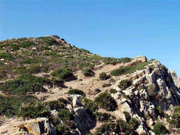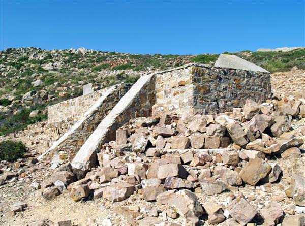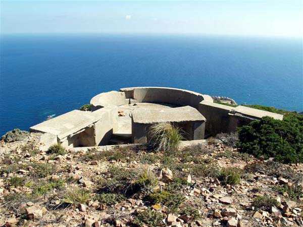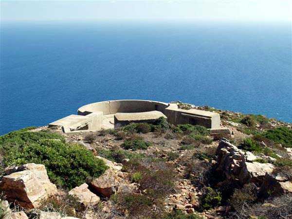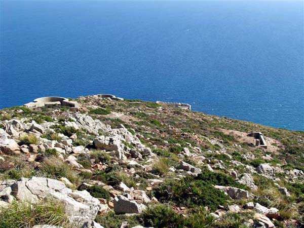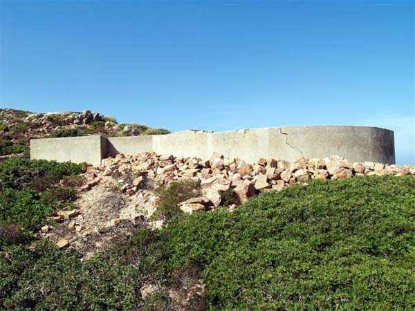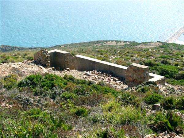 Tunis. This is a fixed light artillery battery, built in 1940 at the tip of Cape Bon, and armed with two guns 100 Mle 1897-17 on carriage C Mle 28, coming from the disarming of the Radès battery. The two pieces are installed in pits with adjoining ammunition niches, at an average altitude of 223 meters. The FCB was to be installed in a small bordj located nearby, which served as quarters for the crew. Events did not allow its completion, and only a temporary wooden installation was built. The ammunition is stored in two corrugated iron shelters covered with earth. The battery's mission was to deny the beaches to the south. Discovering this work is earned, as the access road no longer exists and the approach is made along the cliff via goat paths. And the place teems with vipers and scorpions, pests about which the occupants of the time already complained. But the site, freely accessible, is fabulous… JJM 14/10/07