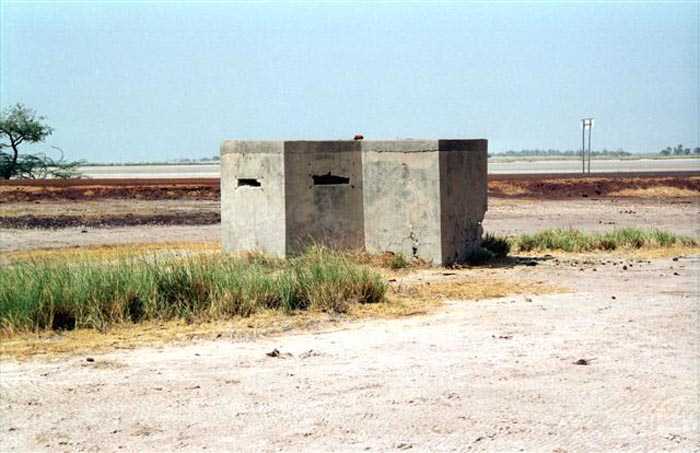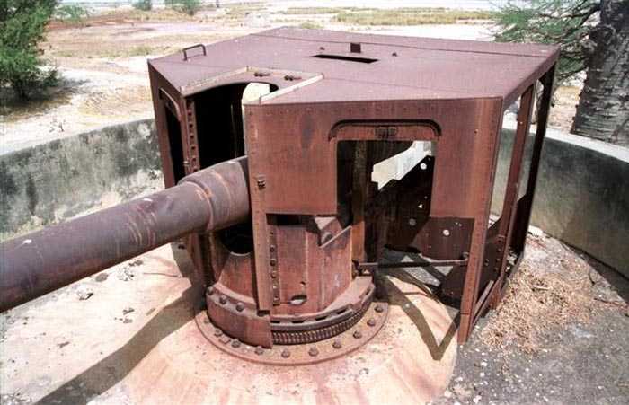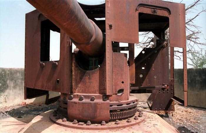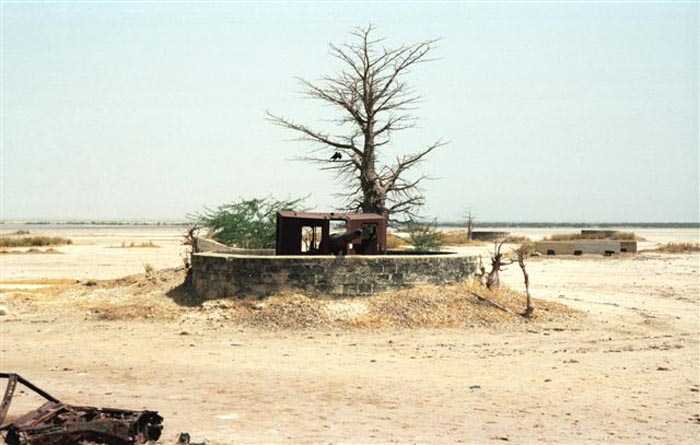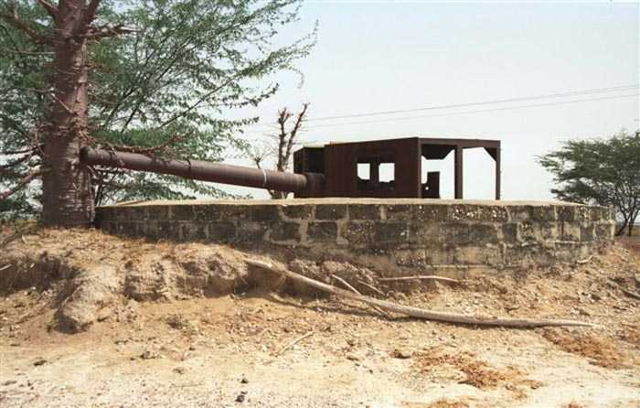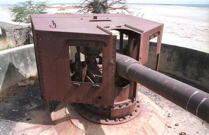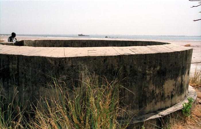 Battery installed in 1942, on the right bank of the Saloum, for the advanced defense of the port of Kaolack. Located 50 kilometers from the river mouth, it also blocks the Gambia road, which is interrupted at this point by the river, crossed by a ferry. It is armed with two guns 138 mm Mle 1893 on ship mounting, and two guns 90 mm Mle 1877 on carriage Mle 1916. These materials, installed in concrete pits, come from ships disarmed at Dakar. Several small blockhouses ensure the defense of the perimeter. The 138 mm pieces are still in place, in fairly good condition. Note, on one of the pits for 90 mm gun, the inscription "May 1942 Vive le Maréchal Vive la France". JJM 23/04/2008