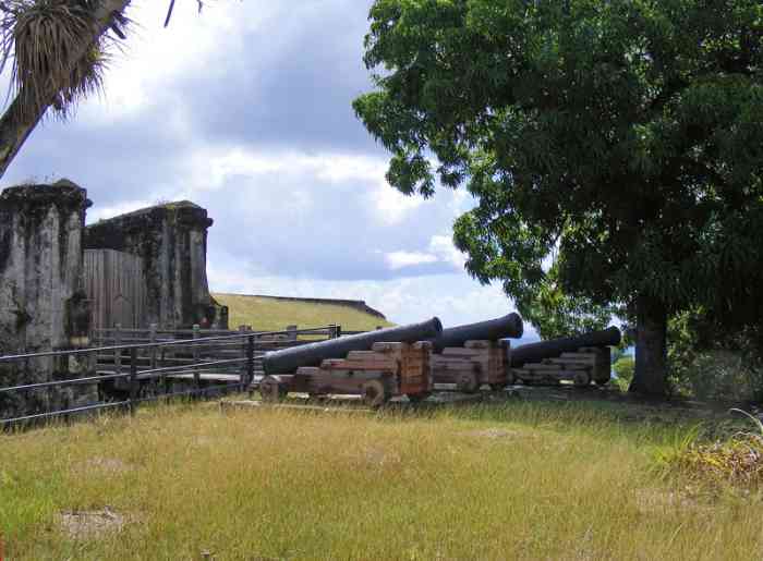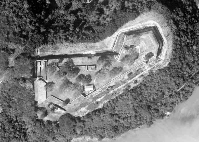 Guadeloupe. Pointe-à-Pitre. Fort polygonal, construit au Gosier, entre 1750 et 1763, pour la défense de la baie de Pointe-à-Pitre. En 1939, une section de deux canons de 95 Mle 1888 sur affût C Mle 1904 y est installée. Polygonales Fort, erbaut in Le Gosier zwischen 1750 und 1763, zur Verteidigung der Bucht von Pointe-à-Pitre. 1939 wurde dort eine Sektion von zwei Kanonen 95 mm Mle 1888 auf Lafette C Mle 1904 installiert. Veelhoekig fort, gebouwd in Le Gosier tussen 1750 en 1763, ter verdediging van de baai van Pointe-à-Pitre. In 1939 werd er een sectie van twee kanonnen van 95 mm Mle 1888 op affuit C Mle 1904 geïnstalleerd. Polygonal fort, built in Le Gosier between 1750 and 1763, for the defence of the Bay of Pointe-à-Pitre. In 1939, a section of two 95 mm guns Mle 1888 on mounting C Mle 1904 was installed there. Polygonální pevnost, postavená v Le Gosier mezi lety 1750 a 1763 na obranu zátoky Pointe-à-Pitre. V roce 1939 zde byla instalována sekce dvou 95mm děl vz. 1888 na lafetě C vz. 1904. © JJM 31/03/2026