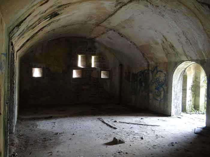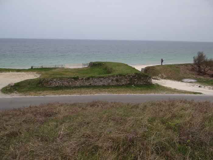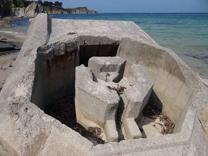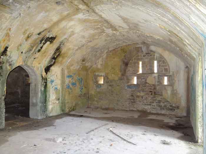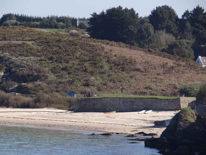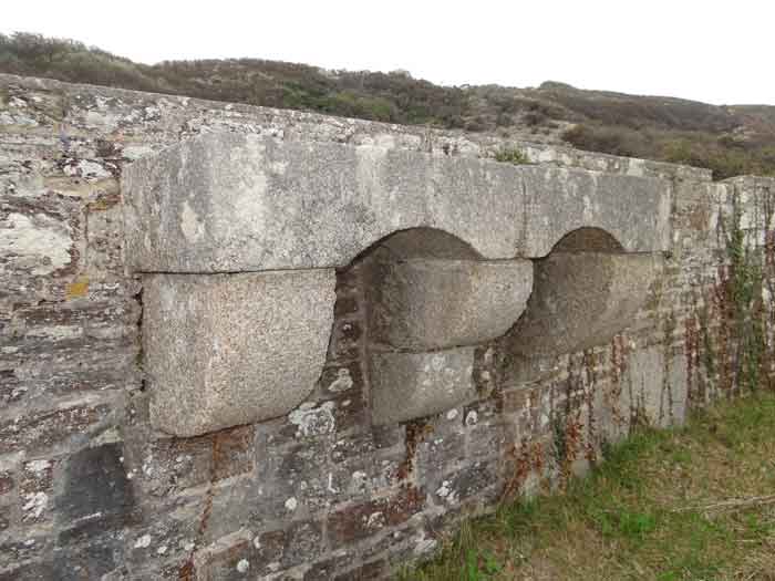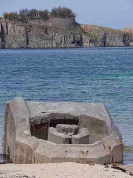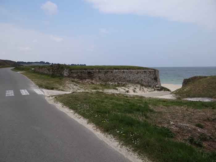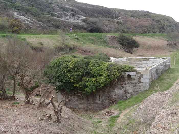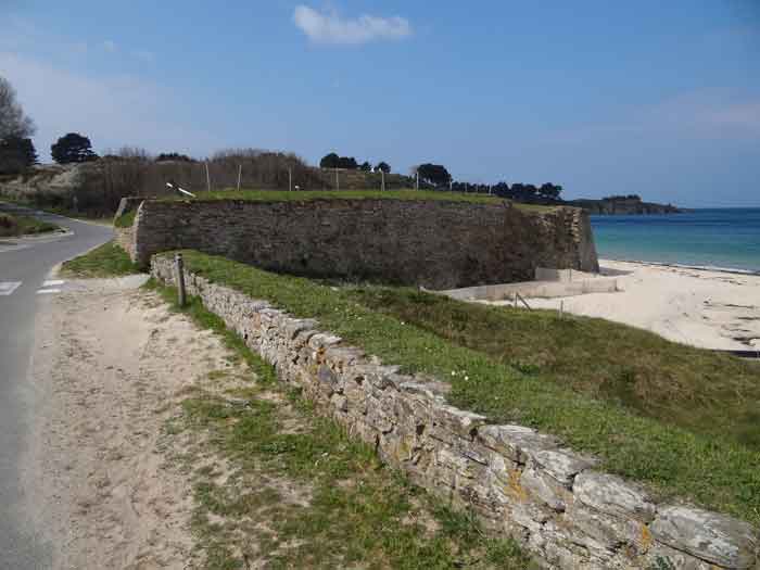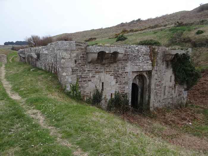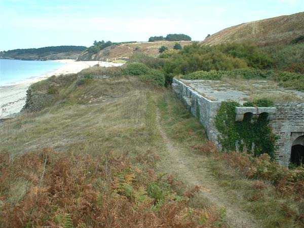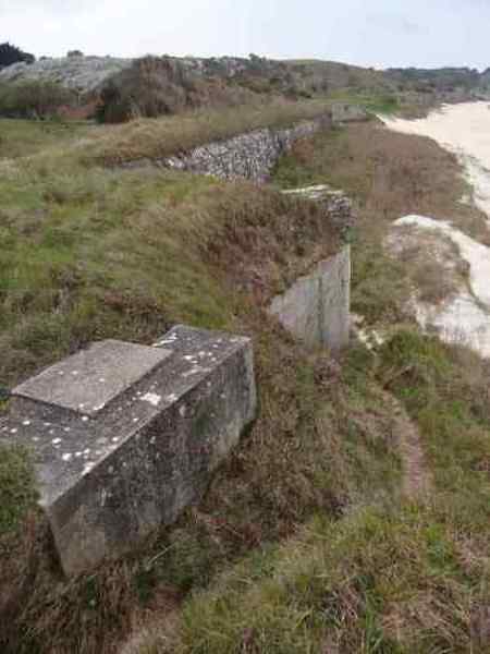 Fortress of Lorient, Belle-Île, southeast of the Palais. The Grands Sables beach, between the points of Gros Rocher and La Biche, approximately 1,500 m long, is undoubtedly the most suitable area on Belle-Île for a major landing. This had of course not escaped Vauban, who had advocated its defense. Note that he designated the area "Sables de Samzun," after the hamlet near the eastern end of the beach. Thus, to the two pre-existing redoubts, he had planned to add two batteries and to palisade the entire beach at the height of the tide line. It was estimated that the beach could accommodate 5,000 men abreast and the largest ships of the time could anchor 1,000 m from the shore. There is evidence of major works undertaken by a certain de La Sauvagère, engineer, in 1746. Are these the bastioned escarpments that have come down to us? It is likely. These works include a battery of La Ferrière, named after the commander of the island at that time. These works will be followed by others in 1755. In the notes of the DRAC (Regional Directorate of Cultural Affairs) we can read: 1780; battery of La Ferrière whose front has a battery to oppose the ships… and two flanks to flank the entire cove. This redoubt is not closed at the gorge; housing for the troops was built there. It forms a kind of horseshoe with a circular face 30 fathoms long, pierced by 6 embrasures for 12-pounder cannon. It is built in very good masonry with a turfed earth parapet 3 fathoms thick, raised 15 feet above the sand. The large guardhouse can hold 100 men; opposite is that of the officers, the gunners and the powder magazines, the attics of these buildings serving as stores for rammers, spoons, levers… In peacetime, all the gun carriages of this battery and the neighboring batteries can be placed there. It is linked by a curtain wall to the Kerdavid redoubt 12 feet high, faced with good masonry, crowned with a parapet 15 feet thick with a small step in the center. (…) During the war of 1778 to 1783, two batteries were built on the summit of the mountain which runs from the valley of Saint-Laurent to that of Kerdavid, the high battery of La Ferrière and the high battery of Kerdavid, on each of which two 24-pounder cannons were placed. They are very high and can only fire offshore. La Ferrière, located practically in the center of the length of the beach, was therefore responsible for flanking the bastioned escarpment. All these developments will make the Grands Sables a piece which the English will avoid rubbing shoulders with in 1791. Then comes the Commission of 1841 which classifies La Ferrière as of 1st importance. Initially, a model 1846 tower No. 2 is planned, but its excessive height makes it vulnerable, a guardhouse No. 2 will be preferred. Its operational existence was brief, as it was proposed for decommissioning between June 13 and July 11, 1874. The Germans used it as barracks during the Second World War. Today (04/2012), the guardhouse is open to all winds and topped. The inscription and date on the pediment of the entrance remain visible. The arrangement of the firing loopholes, on either side of its entrance, is unusual, with the upper bay, vaulted in a semicircular arch, blocked with a loophole in its center. This loophole, almost impossible to fire, already appears on a CPA from the beginning of the century. Several incongruities of this type can be seen in other bays of the building, such as these two superimposed loopholes in the central room at the back of the guardhouse, between the projectile magazine and the powder magazine. There is no trace of the drawbridge. Apart from these details, the building is fairly well preserved, unlike the majority of the beach escarpments, which, built of poor schist, are collapsing a little more each year. Nothing remains of the initial battery on the circular face, and having only learned of the upper batteries after leaving the island, we were unable to verify what remained of them. The Germans fortified both ends of the beach, without much originality. At most, we can mention two Tobruk mortar bunkers and a 50 mm Pak casemate which have retained beautiful inscriptions. The guardhouse, for its part, was included in the Supplementary Inventory of Historic Monuments on March 2, 2001.