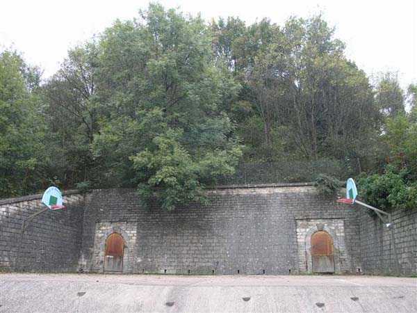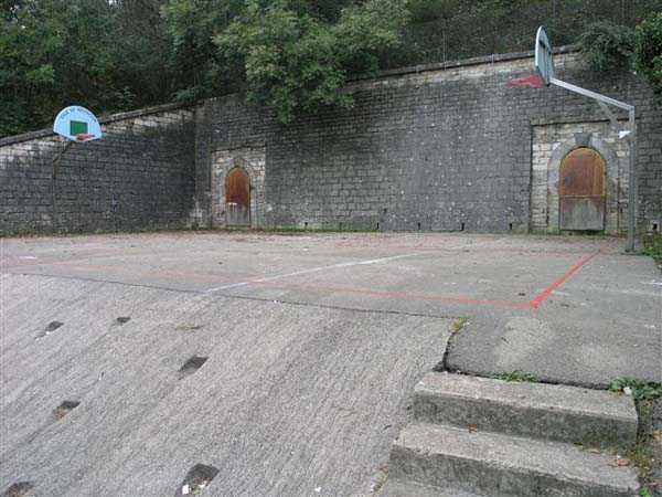 Fortress of Besançon, north-east of the city, 1889. 300 m/alt. Located about 1000 m south of Fort Benoît, this powder magazine under rock has two entrances, but the interior layout is unknown. Today (10/2006), its doors are welded and its courtyard has been transformed into a basketball court in front of council blocks.