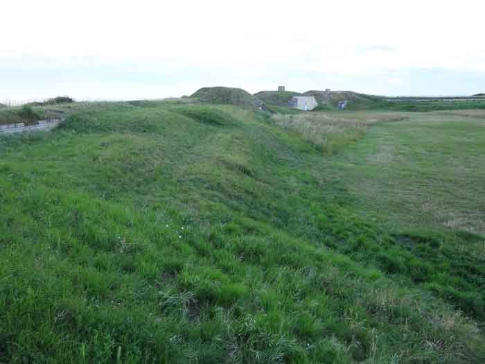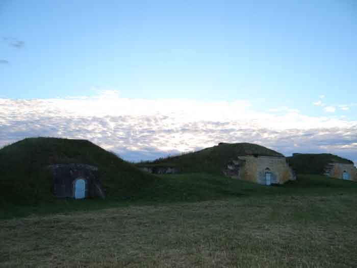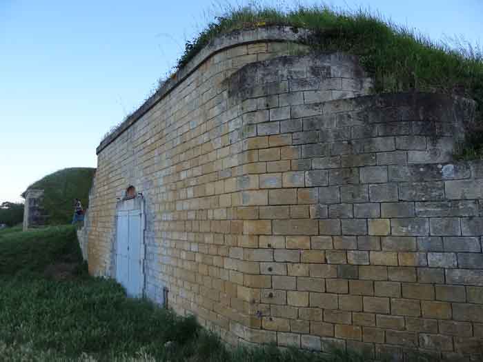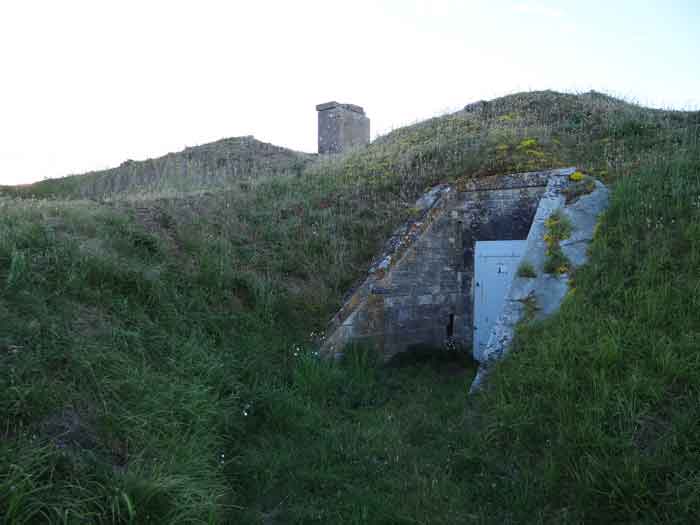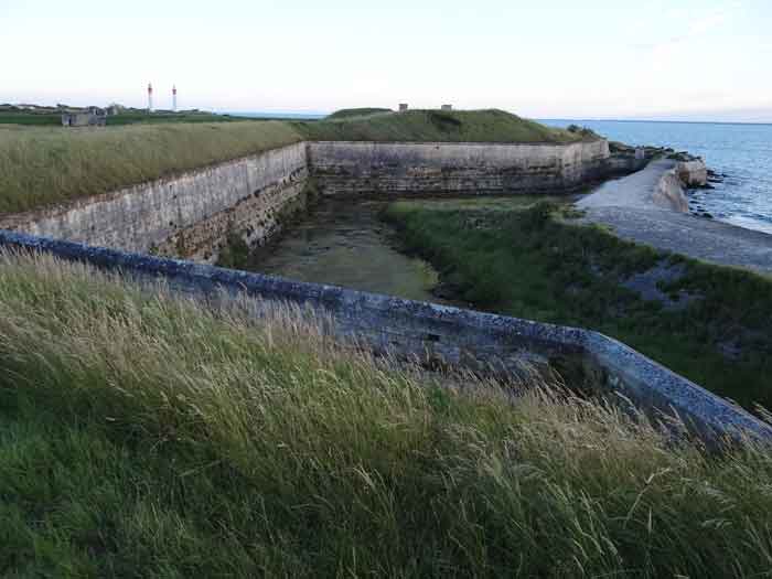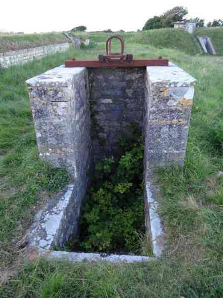 Festung von Rochefort, Île d'Aix. Wir konnten nur die Bauperiode dieser Batterie schätzen, die im Halbbastion zwischen den Gräben des Forts der Rade und des gleichnamigen Dorfes eingerichtet wurde. Der Halbbastion selbst datiert von 1850, und wir würden die Batterie um 1878-1880 situieren. Sie war mit vier Kanonen M von 27 cm Modell 1870 bewaffnet (auf Lafetten G mit Rundgestell, genau wie in der Batterie von Sainte-Catherine ?). Die Batterie befand sich in einem bereits militärisch geschützten Perimeter, versteht sich. Heute (03/2008) sind nur noch drei der Traversen-Schutzräume der Batterie vorhanden, gut freigelegt und frei zugänglich. Die vierte, die linkeste, scheint einige Schäden erlitten zu haben.