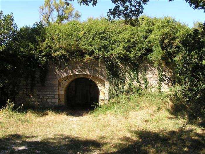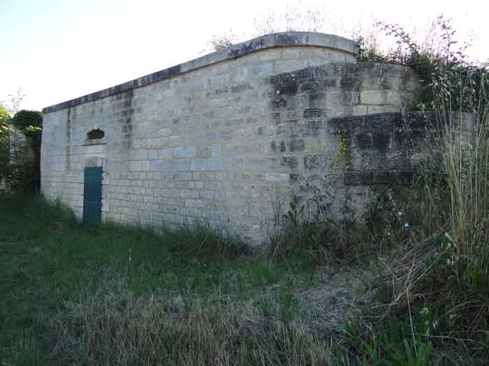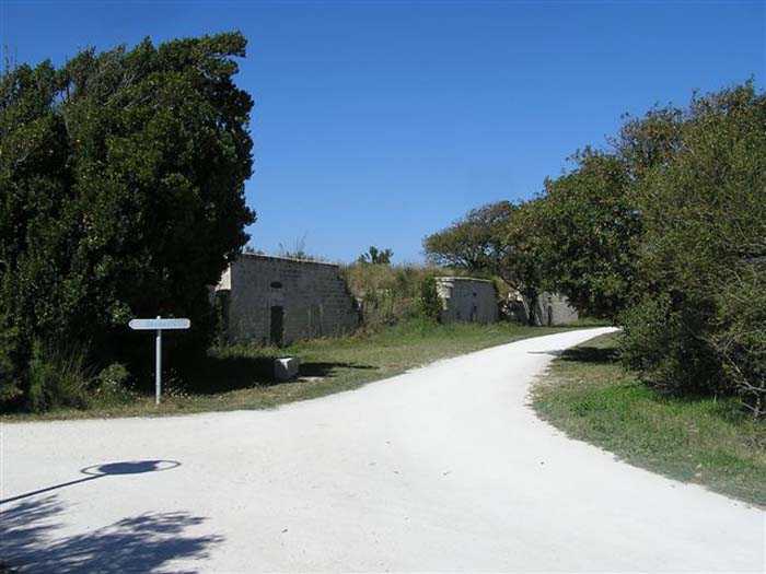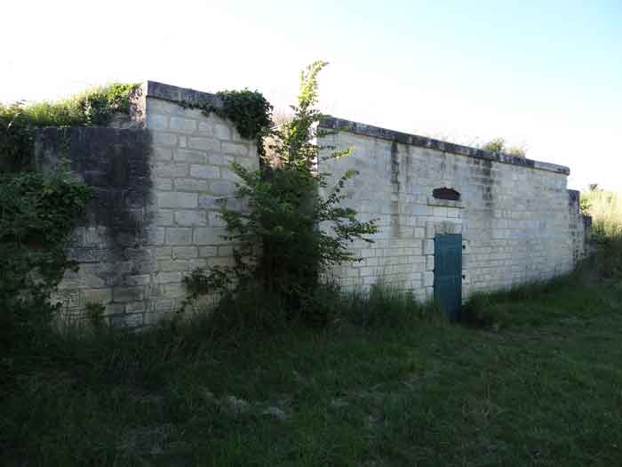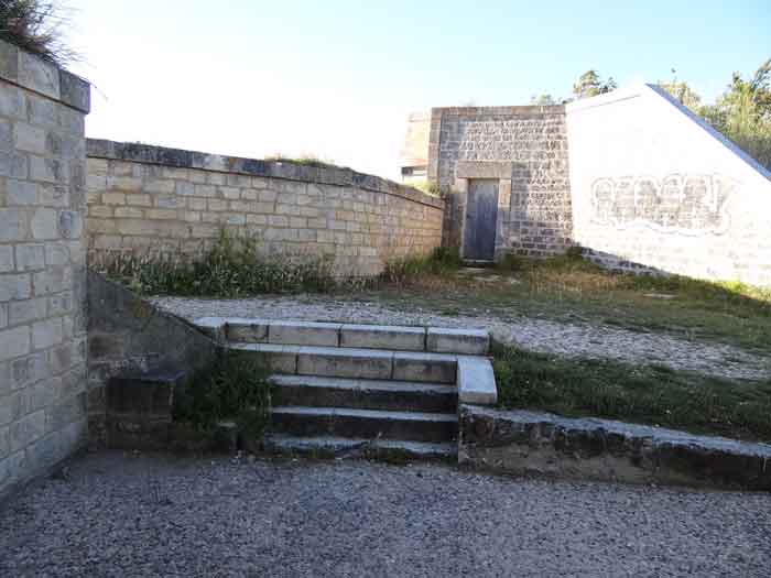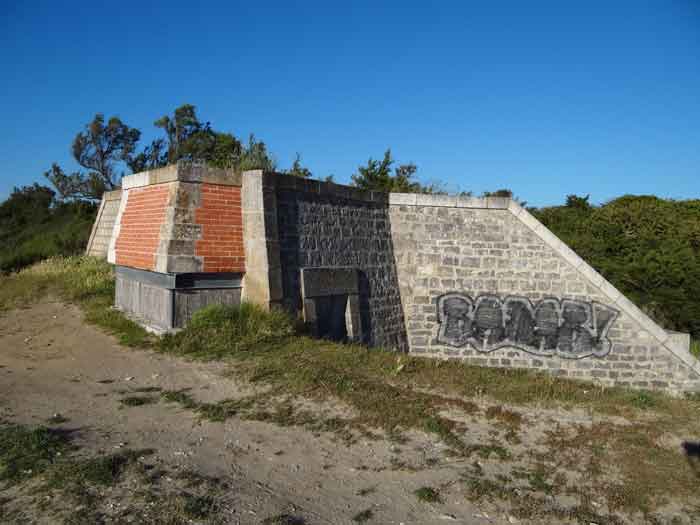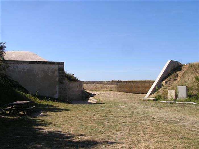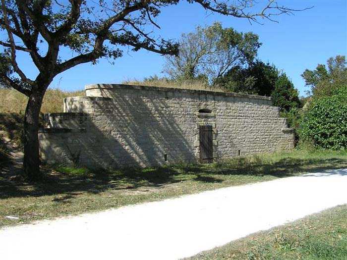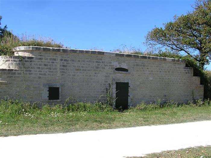 Fortress of Rochefort, Île d'Aix, 1878-1880. Located between the batteries of Jamblet and Saint-Eulard, this battery was initially supposed to be the exact copy of the project of the battery of Tridoux. For the description of this project, we refer the reader to the latter short article. Here too, the realization will be quite different since the gorge will be open and the barracks will very probably be established in huts. The battery will comprise four firing emplacements for 24 cm cannons separated by hollow traverses. These components will be placed on an ellipse showing a sudden hook on its right, a hook corresponding to the merlon of the powder magazine. From 1888, there is talk of establishing between it and the battery of Jamblet, a concrete powder magazine, which would serve both batteries. This will be done in 1892. This magazine, with walls and roof thick of 3.50 m, possessed two shrouded entrances leading to galleries about twenty meters long and each ending behind an airlock. The storage room, between these two airlocks, had a length of 8.40 m for a width of 4 m and a height (barrel vault) of 3 m. Also in 1888, a project to construct a concrete building, which would be founded in front left of the battery, takes shape. It was an electric power plant with its tanks for a searchlight. Unusually, the plant also cumulated the role of day shelter. The searchlight, of 150 cm caliber and mounted on a carriage, would have reached its combat platform via a railway. There is manifestly no question of a combat shelter. From its base, the searchlight would have had a field of vision of 166°, essentially in front of the two lines of 48 ground torpedoes blocking the roadstead of the Île d'Aix. This searchlight will have been connected telephonically with the exterior post located to the left of the battery of Jamblet and the interior posts (and ignition posts) of these torpedoes located, one in the fort of the Rade, the other in fort Boyard. The battery will still undergo modifications later, but we do not have the detail except that of 1926. That year, the whole Jamblet – Fougères will be merged into a single battery of 4 x 120 L placed in emplacements dug in their respective parapets. The emplacements of the Fougères will take place at the extreme left of the battery and behind traverse no. 4. For the most part, the battery is still visible today (03/2008), and one notes that its traverses have stepped return wing walls. The powder magazine is present but its entrances are closed, and the plant/day shelter of the searchlight has been converted into toilets. On the other hand, the magazine to the right of the battery seems to have disappeared. Free access.