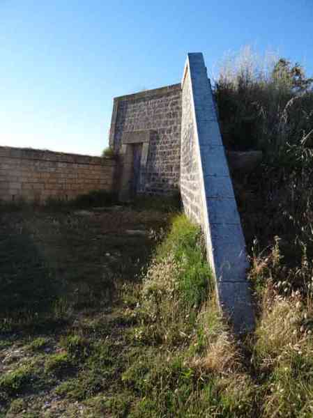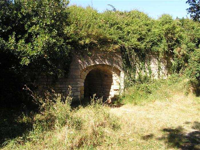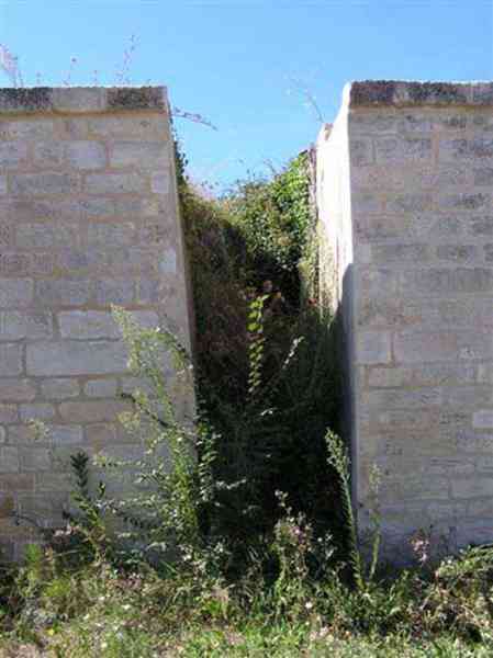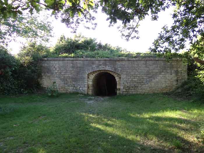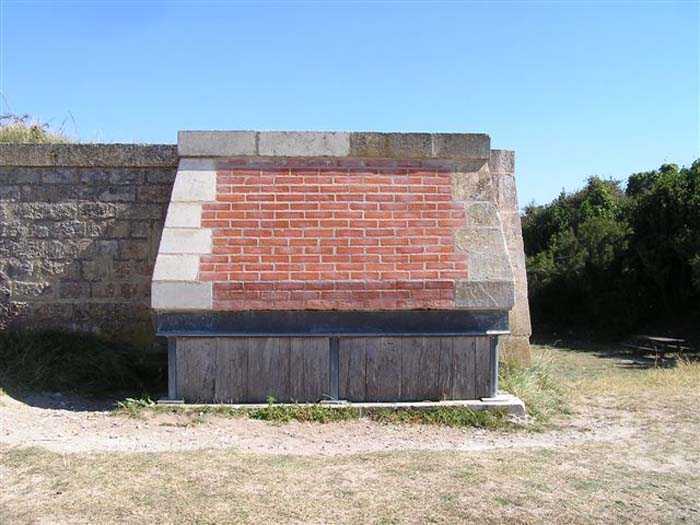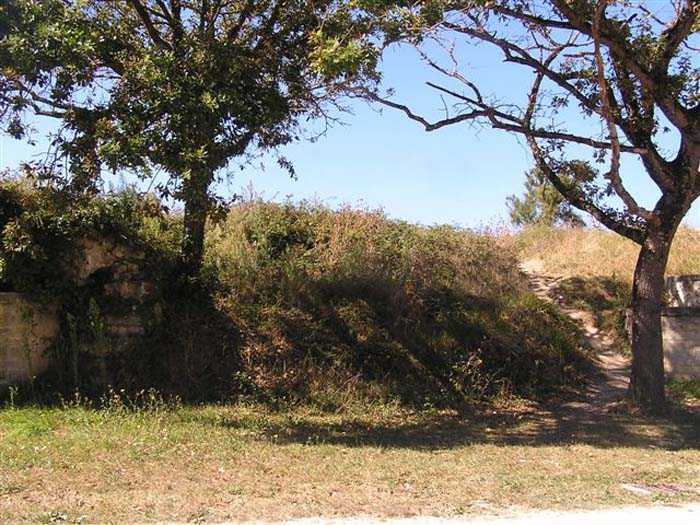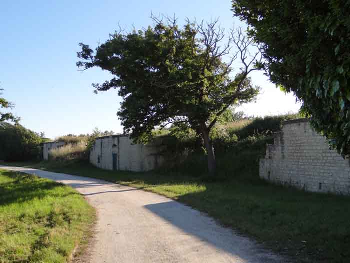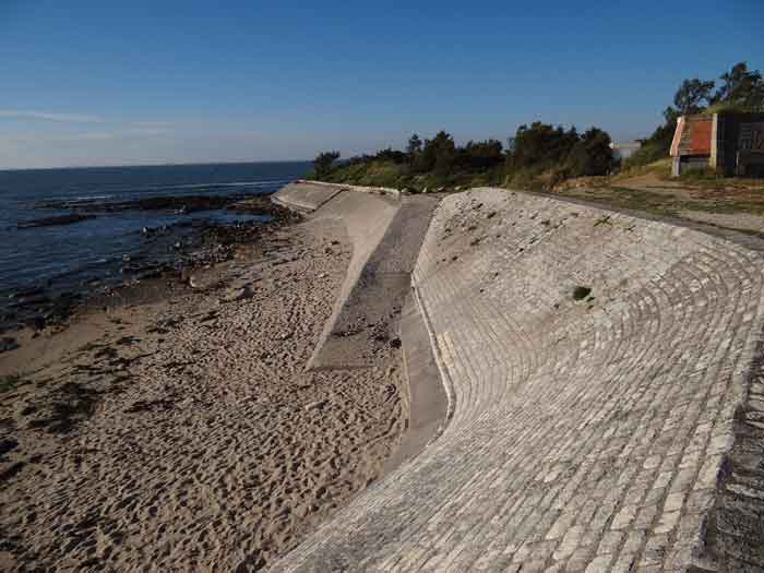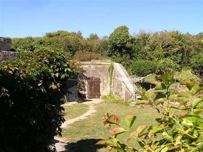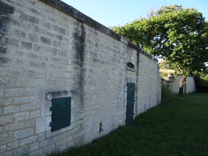 Fortress of Rochefort, Île d'Aix, 1878-1880. Located between the batteries of Jamblet and Saint-Eulard, this battery was initially supposed to be the exact copy of the project of the battery of Tridoux. For the description of this project, we refer the reader to the latter short article. Here too, the realization will be quite different since the gorge will be open and the barracks will very probably be established in huts. The battery will comprise four firing emplacements for 24 cm cannons separated by hollow traverses. These components will be placed on an ellipse showing a sudden hook on its right, a hook corresponding to the merlon of the powder magazine. From 1888, there is talk of establishing between it and the battery of Jamblet, a concrete powder magazine, which would serve both batteries. This will be done in 1892. This magazine, with walls and roof thick of 3.50 m, possessed two shrouded entrances leading to galleries about twenty meters long and each ending behind an airlock. The storage room, between these two airlocks, had a length of 8.40 m for a width of 4 m and a height (barrel vault) of 3 m. Also in 1888, a project to construct a concrete building, which would be founded in front left of the battery, takes shape. It was an electric power plant with its tanks for a searchlight. Unusually, the plant also cumulated the role of day shelter. The searchlight, of 150 cm caliber and mounted on a carriage, would have reached its combat platform via a railway. There is manifestly no question of a combat shelter. From its base, the searchlight would have had a field of vision of 166°, essentially in front of the two lines of 48 ground torpedoes blocking the roadstead of the Île d'Aix. This searchlight will have been connected telephonically with the exterior post located to the left of the battery of Jamblet and the interior posts (and ignition posts) of these torpedoes located, one in the fort of the Rade, the other in fort Boyard. The battery will still undergo modifications later, but we do not have the detail except that of 1926. That year, the whole Jamblet – Fougères will be merged into a single battery of 4 x 120 L placed in emplacements dug in their respective parapets. The emplacements of the Fougères will take place at the extreme left of the battery and behind traverse no. 4. For the most part, the battery is still visible today (03/2008), and one notes that its traverses have stepped return wing walls. The powder magazine is present but its entrances are closed, and the plant/day shelter of the searchlight has been converted into toilets. On the other hand, the magazine to the right of the battery seems to have disappeared. Free access.