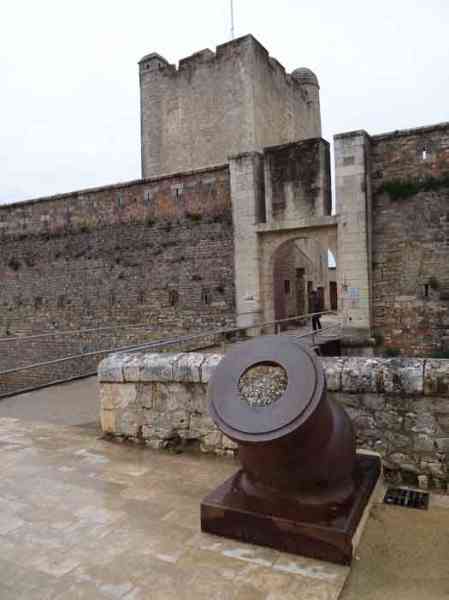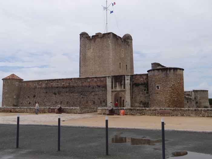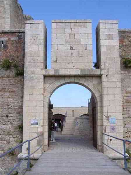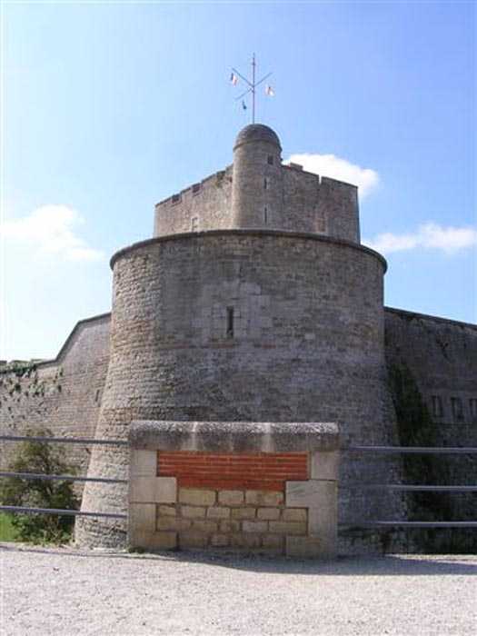 Festung von Rochefort. Das Schloss Fouras, dessen Ursprung auf das 14. Jahrhundert zurückgeht, das aber vor allem im 17. Jahrhundert geprägt wurde, liegt gut am rechten Ufer der Charente-Mündung, etwa senkrecht zur Insel Madame. Es wurde nur einmal erwähnt gefunden, in einem Bericht an den Obersten Kriegsrat vom August 1888, der seine Außerdienststellung vorschreibt, während die Standorte als Stützpunkte für die mobile Verteidigung erhalten bleiben. Dennoch ist 1906 von einer "Batteriegruppe von Fouras" die Rede, die entlang des rechten Ufers gestaffelt sind. Die der Dokumentation beigefügte Karte zeigt drei Batterien. Eine mit mittlerem Kaliber im Fort der Pointe und zwei (zumindest eine der beiden mit kleinem Kaliber) in unmittelbarer Nähe des Schlosses. Wir sind nicht in der Lage, über letztere mehr zu schreiben. Das Schloss, manchmal auch als Fort bezeichnet, besteht aus einem quaderförmigen Donjon, dessen Ursprung auf die 1480er Jahre zurückgeht, umgeben von einer mit Ecktürmen bewehrten Umfassungsmauer, die unter Vauban errichtet wurde, und auf der Seeseite findet sich eine kleine niedrige Halbkreisbatterie (1693). Anschließend diente es von 1889 bis 1940 als Semaphor. Heute ist das Schloss für die Öffentlichkeit zugänglich (03/2008) und der Eingang wird von zwei prächtigen Plattenmörsern flankiert.