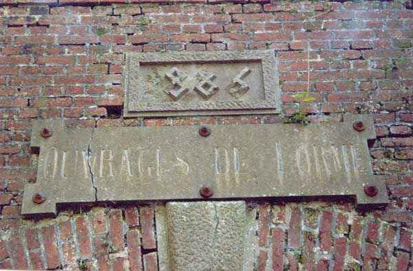 Fortress of Maubeuge, east of the city. 175 m/alt. The central battery of the Rocq works. 3 shelters under traverse, of which the middle one has on the pediment, engraved in the stone (fixed by superb cast iron nails), the inscription "ouvrages de Lorme" as well as the chronogram "1886". A casemate placed perpendicularly flanked the battery courtyard. It housed 4 x 7 guns whose mission was to sweep the summits of the Rocq plateau.