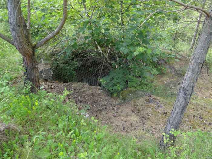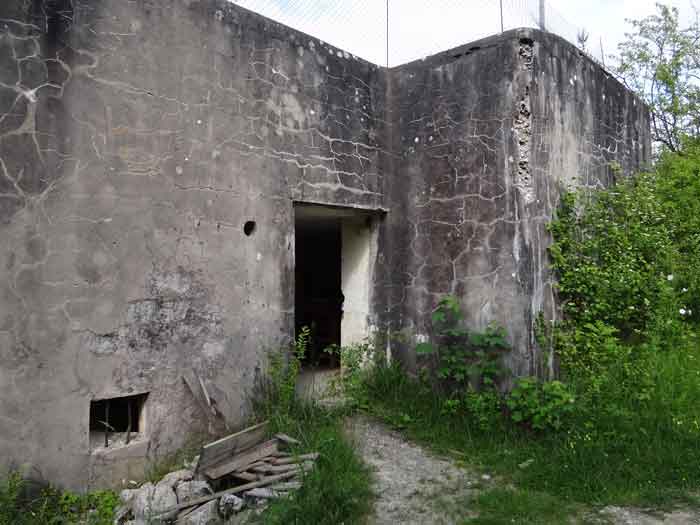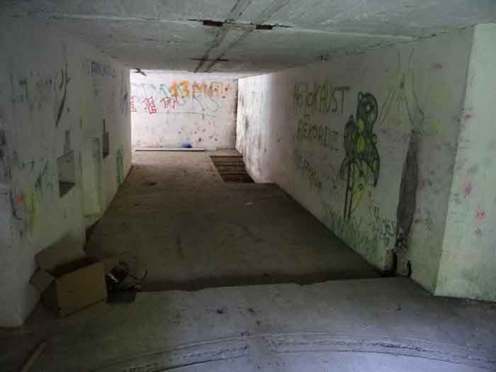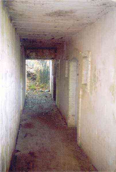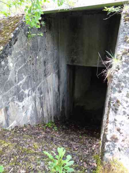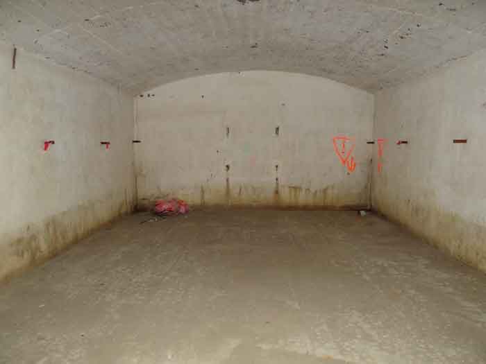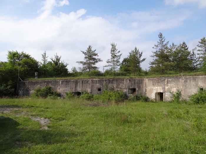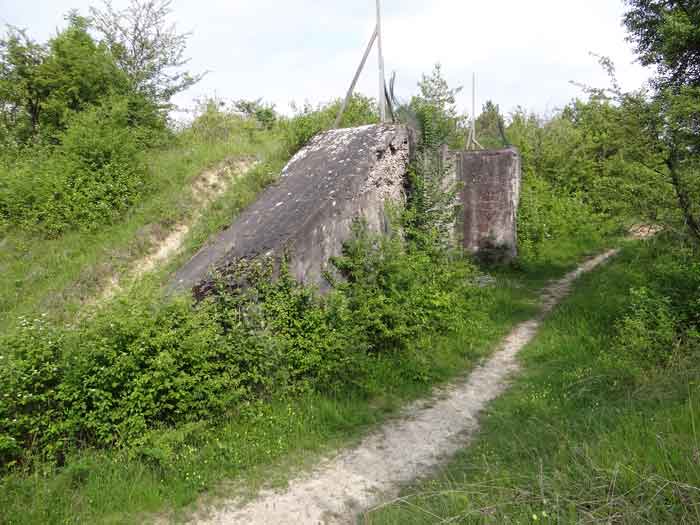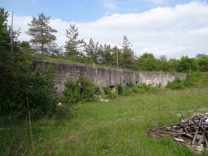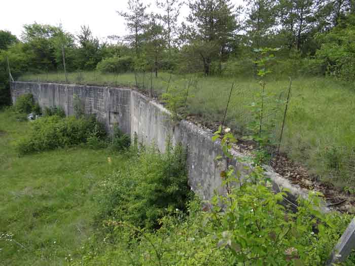 Toul fortified camp, NNE of the city, 1906. 229 m/alt. Small concrete structure located between the works of Bouvron and Ropage. According to the wall inscriptions, its garrison must have numbered 60 (70?) men, 12 non-commissioned officers and 4 officers. The structure, without a ditch, has an almost circular perimeter, with a sloping glacis and a barbed wire belt. In the center, a monolithic concrete structure includes, from left to right, a large barracks for 50 men, a barracks for 12 non-commissioned officers, two magazines, a gallery perpendicular to the gorge, a gallery leading to a machine gun turret (its armored observation post is reached by a transverse gallery passing behind the two magazines), a barracks for 4 officers, the command post and a telegraph post. All these premises are preceded by a circulation corridor to the left of which are the latrines. All the openings of this corridor to the outside, doors and windows have a system of closure by double beam barrier. To the left of this monolith, there is a rampart shelter surmounted by an infantry parapet with armored masks. To the right of the structure, there is a Bourges casemate whose wing wall is very long. The structure was completely stripped of its metalwork, but during our visit in August 2002, the premises were generally in good condition, and only the Bourges casemate was, despite itself, displaying some graffiti. Abandoned and exposed to all the winds.