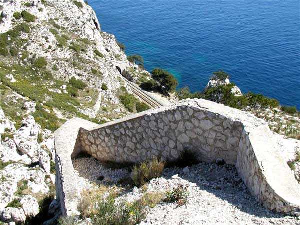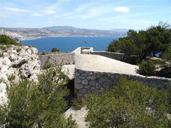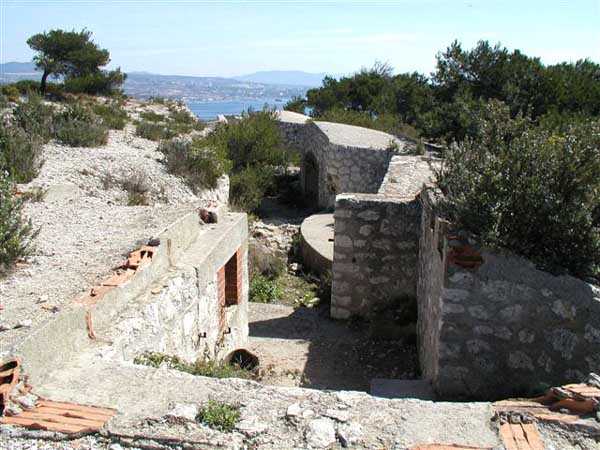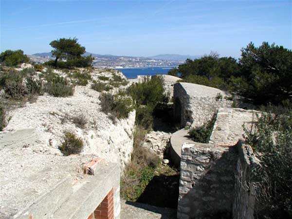 Fortress of Marseille, north-west of the city. Between 1880 and 1890. Battery armed with 3 G mortars 270 Mle 1889 on G PC carriage. Today (04/2004) freely accessible, this battery has suffered little degradation and overlooks a railway line. It comprises two light buildings at its entrance and the firing platforms, deep as required with such armament, are lined with rubble masonry. The traverses separating the pieces possess a niche for safety shots.
