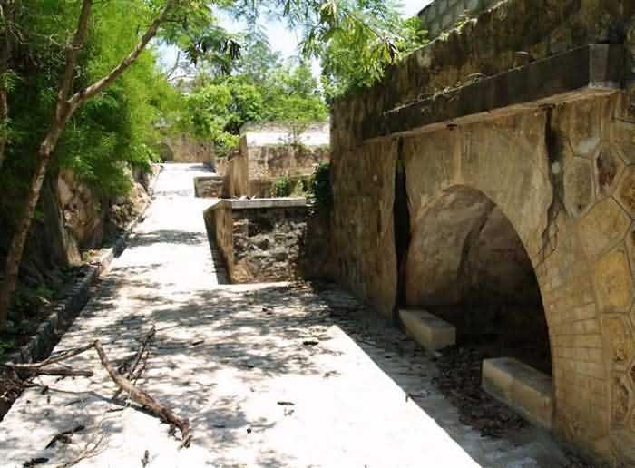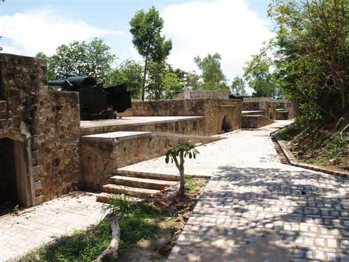 Ehemalige Batterie C, Cap Saint-Jacques, 250 m westlich der Batterie des Lazaretts. Diese Batterie, auf einer mittleren Höhe von 97 M/ü M erbaut, gehört zur Gruppe Ganh Ray und ist deren nördlichstes Werk. Der erste, 1892 erstellte Entwurf sah eine Bewaffnung mit sechs 270 mm G-Mörsern Mle 1889 auf PC-Lafette vor. Der Entwurf wurde ein Jahr später überarbeitet und die Mörser durch sechs 24 cm M-Kanonen Mle 1870 auf M-Lafette Mle 1889 PC ersetzt. Die Geschütze sind in zwei Gruppen zu drei Stück aufgestellt, deren Schussrichtungen auseinanderlaufen, um die Zufahrten zum Saigon-Fluss zu bestreichen. Sie stehen in gemauerten Geschützständen, die durch Traversen mit einer kleinen Nische für 12 komplette Schuss getrennt sind. Die Munition wird in einem nahegelegenen Kavernenmagazin gelagert, das auch die Lazarett-Batterie versorgt. 1914 sind diese veralteten Geschütze, die bereits bei ihrer Inbetriebnahme überholt waren, immer noch in Stellung, obwohl ein nicht umgesetzter Entwurf von 1905 vorsah, sie durch vier 240 mm Kanonen Mle 1902 zu ersetzen. Sie wurden während des Ersten Weltkriegs nicht ins Mutterland zurückgeschickt. Der Standort wurde 1939 nicht wiederverwendet. Heutzutage, nach einer langen Vernachlässigungsphase, wurde die Batterie vollständig von Vegetation befreit. Die Kanonen sind immer noch an Ort und Stelle. Obwohl viele Zubehörteile fehlen, sind sie sehr repräsentativ. Sie sind in ausgezeichnetem Zustand und werden regelmäßig neu gestrichen. Es scheint, dass die Batterie derzeit für Besucher erschlossen wird. Es ist einer der schönsten Standorte, die wir bei unseren Erkundungen in Übersee sehen konnten. Es ist sehr bedauerlich, dass nichts Vergleichbares im Mutterland existiert. Die Geschütze tragen die Bezeichnungen 24 cm Mle 1870 R 1872 Nr. 1 und 3, R 1873 Nr. 27, R 1876 Nr. 4, Nevers 1873 Nr.4 und Nevers 1874 Nr.33. Ein weiterer Rohrsatz wird in einem Museum in Hanoi ausgestellt. Er trägt die Bezeichnung R 1873 Nr.15. Es handelt sich wahrscheinlich um ein Ersatzrohr der Batterie. JJM 03/07/2008