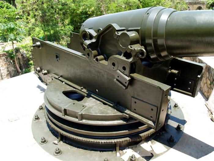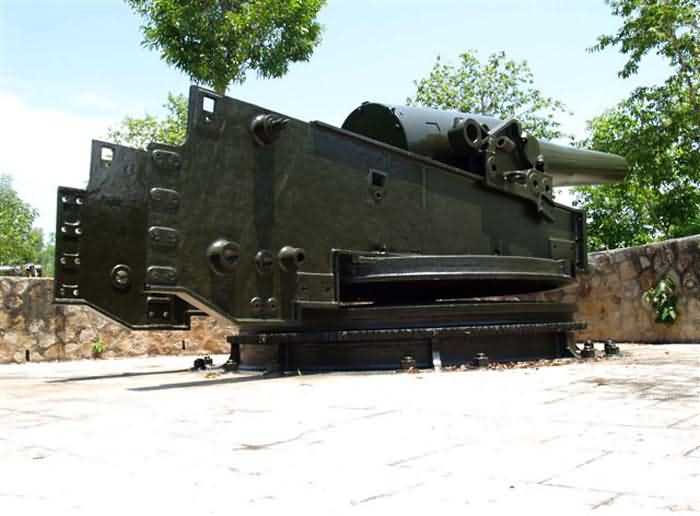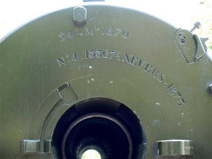 Former Battery C, Cape Saint-Jacques, 250 m west of the Lazaret battery. This battery, built at an average altitude of 97 metres, is part of the Ganh Ray group, and is its northernmost work. The first project, drawn up in 1892, provided for an armament of six 270 mm G mortars Mle 1889 on PC carriage. The project was revised a year later, and the mortars were replaced by six 24 cm M guns Mle 1870 on M carriage Mle 1889 PC. The pieces are arranged in two groups of three, whose firing axes diverge to cover the approaches to the Saigon River. They are placed in masonry emplacements, separated by traverses with a small niche for 12 complete rounds. Ammunition is stored in a cavern magazine located nearby, which also supplies the Lazaret battery. In 1914, these obsolete materials, already outdated at the time of their commissioning, were still in position, although a 1905 project, not adopted, planned to replace them with four 240 mm guns Mle 1902. They were not sent back to mainland France during the First World War. The site was not reused in 1939. Nowadays, after a long period of abandonment, the battery has been completely cleared of vegetation. The guns are still in place. Although many accessories are missing, they remain very representative. They are in excellent condition and repainted regularly. It seems that the battery is currently being developed to be opened to visitors. It is one of the most beautiful sites we were able to see during our reconnaissances overseas. It is a great pity that nothing similar exists in mainland France. The pieces are named 24 cm Mle 1870 R 1872 No.1 and 3, R 1873 No. 27, R 1876 No. 4, Nevers 1873 No.4 and Nevers 1874 No.33. Another barrel is exhibited in a museum in Hanoi. It is named R 1873 No.15. It is probably a spare barrel for the battery. JJM 03/07/2008