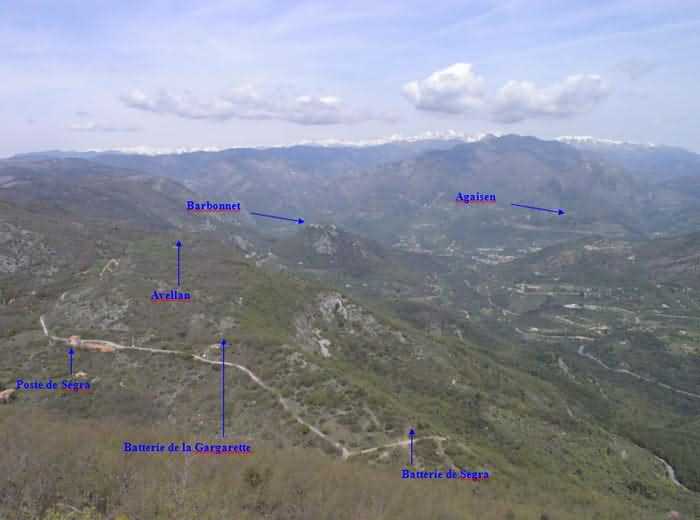 North-eastern avancées of Nice, 189? 4,300 m south-south-west of Sospel. 980 m/alt. Small battery, rarely mentioned, which was interposed between those of Avellan and Ségra, batteries whose action in the valley of the Sambora stream it supported. Much closer to the Ségra post than the homonymous battery, it consists of a clear rock clearing of an area for a maximum of two 80 or 90 mm pieces with a small parapet of in-situ rock. Directly to the rear two meters below, another area, probably for the harnesses and caissons, is reachable by a branch of the access path. Free access (05/2008). See Nice (north-eastern avancées of).