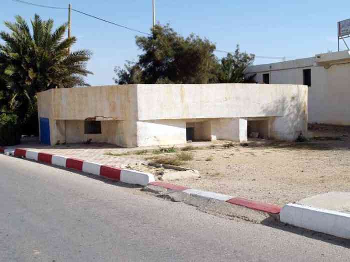 Gabès-port Work No. 3 This is a casemate identical to the previous one, located 3,300 metres to its south-east, within the fishing port of Gabès. It is in good condition, but is buried up to the level of the firing embrasures, as the ground level has been raised. It still possesses the armoured flaps of its rifle slits, and its double-leaf door. The latter has been cut, to allow the opening of the part remaining above ground. It is closed by a chain, fitted with a padlock.