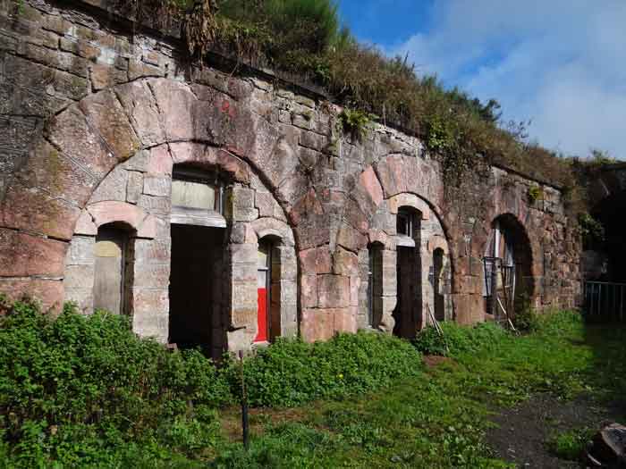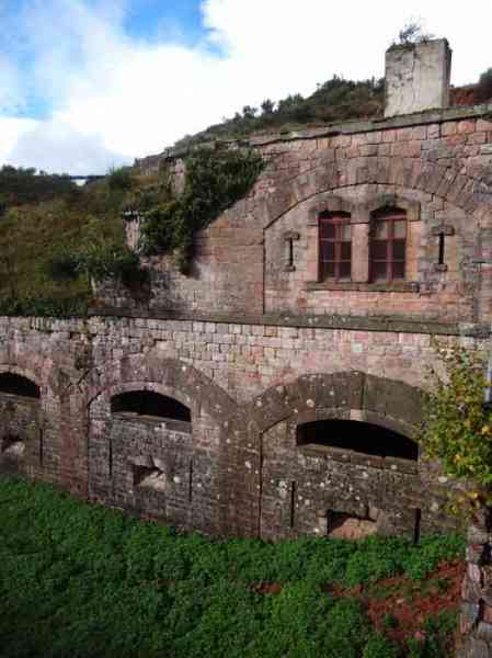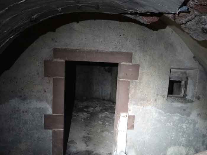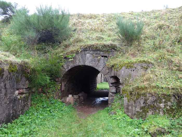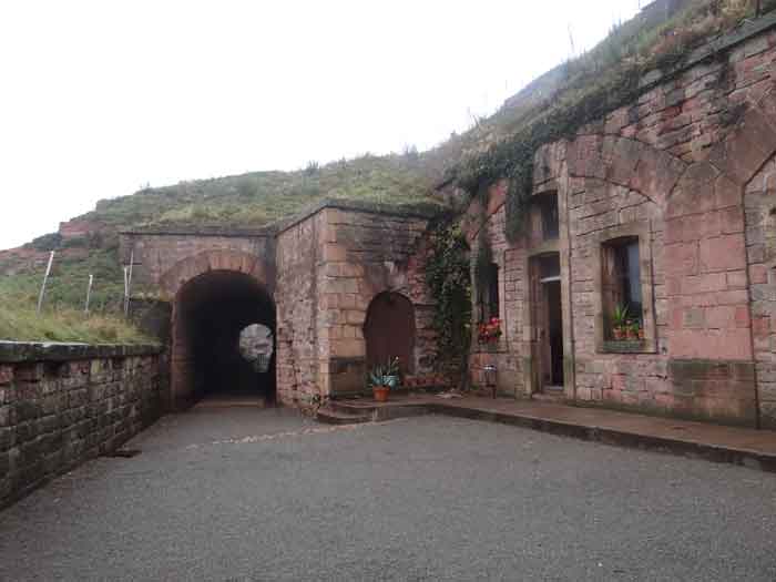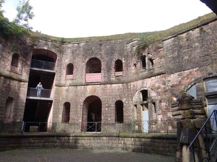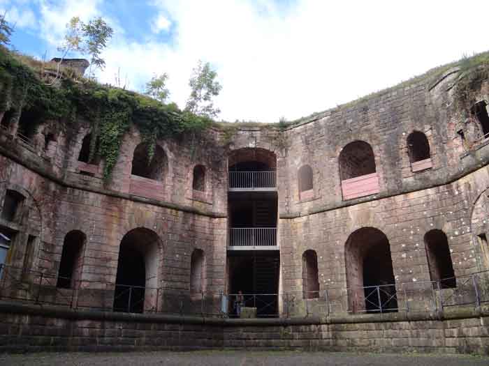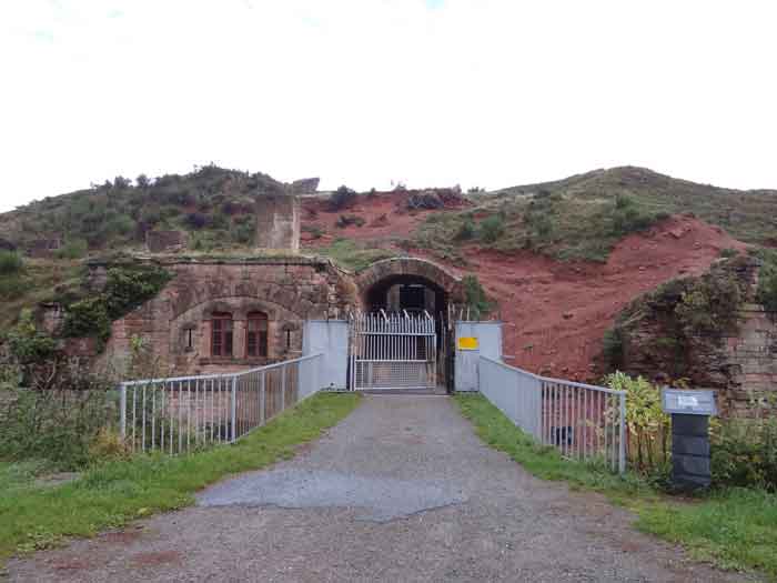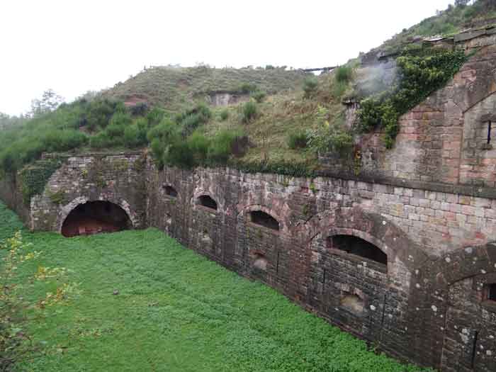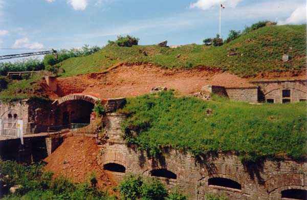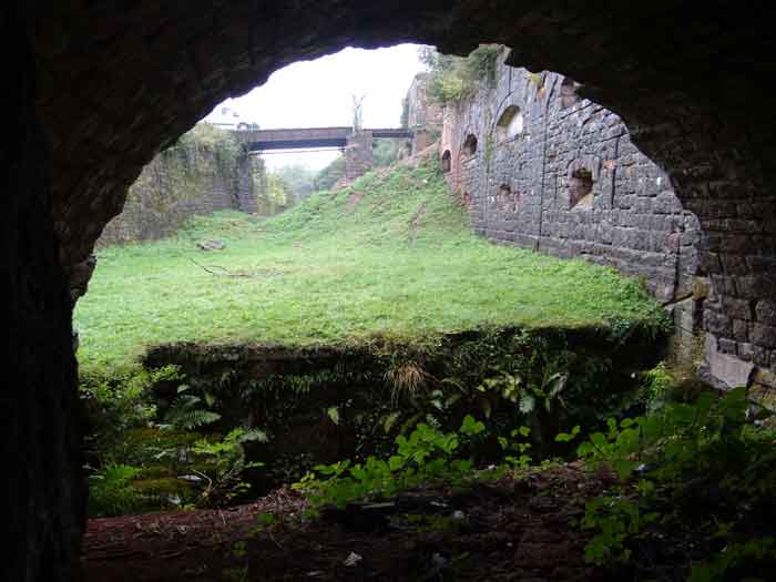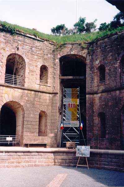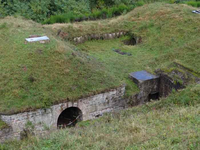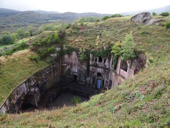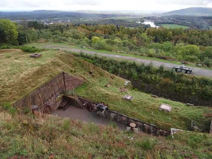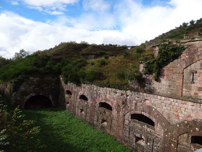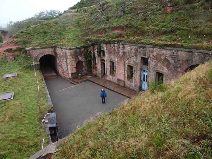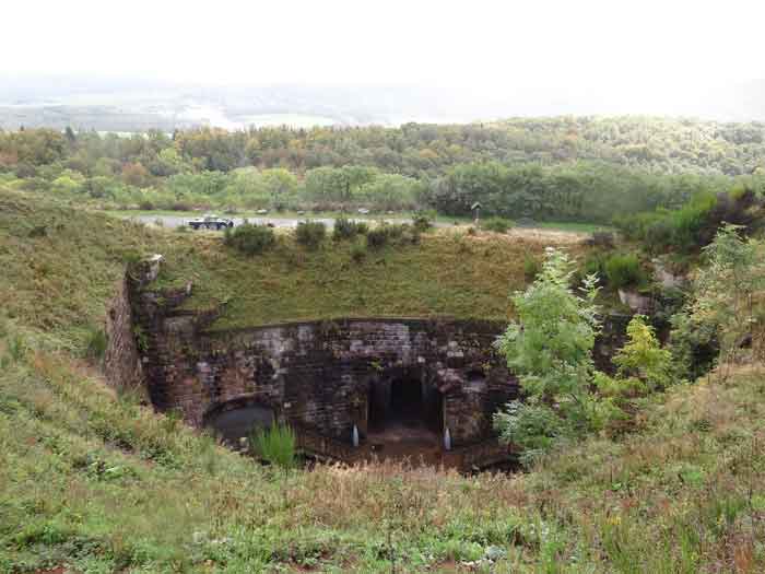 Upper Moselle Curtain, 1875-1879. 580 m/alt. 645 men and 35 guns. Called Fort Dorsner. Dominated 2000 m to the northwest by Mount Ordon-Verrier (963 m/alt), 1800 m to the north by the Tête des Planches (636 m/alt), 2800 m to the northeast by Mount Jean (786 m/alt) and 6000 m to the east by the Fayé (915 m/alt), there could be no question of building a conventional fort. Guardian of the road descending from the Ballon d'Alsace towards Belfort, it occupied a position of prime importance which, added to its potential vulnerability, justified the unusual expense, since only the forts of Manonviller and Barbonnet can boast the installation of two Mougin Mle 1876 turrets. Trapezoid with a curtain wall at the throat, this fort appears concentrated, which the available space and the threat of nearby heights made obligatory. The ten bays of the barracks are aligned at the back of the curtain wall one level lower than the entrance porch. These ten bays were separated into two series of five by the drawbridge maneuvering room. The curtain wall vaults are both equipped with a large visor, a protective device characteristic of exposed organs. Once through the entrance porch, a transverse gallery leads on either side to a small courtyard whose rooms backing onto the lateral fronts show a concrete covering dating from the reinforcements of 1914-1916. Behind the rooms in the left courtyard stretches the powder magazine. This is reported to have a capacity of 102,000 kg, which seems optimistic to us. Its storage room, with three lamp battlements on the same line, has its partitions entirely covered with a cement film. The tunnel in the capital opens onto a small octagonal courtyard surrounded, except on the gorge side, by two floors of rooms and casemates. We have here the most original and, even if it is a necessarily subjective judgment, the prettiest of the courtyards of all the forts of the Séré de Rivières system. Very carefully crafted, its masonry of pink Vosges sandstone rubble and the harmony of the arches of the bays opening onto it contribute to its majesty. Tactically speaking, however, one could compare it, depending on whether one is on the plain or on a height, with a golf course hole or a basketball hoop, which it was convenient for the attacker to hit with his projectiles. Laterally, there are still two large barracks for the troops while towards the front, on either side of the capital, we find the substructures of the turrets. These premises are superb and include some of the most beautiful achievements in rubble masonry that we have ever seen. Everything here is curves, vaults, wells, arcades, in sandstone of excellent texture. Texture perhaps, but, for the record, during the test firing of the two turrets, these masonry will be the source of some fears. A gallery envelops these substructures while serving no less than six casemates for indirect fire whose embrasures break the monotony of the parados of the rampart street. The latter served three shelter traverses, two of which were rooted, on each of the lateral fronts of the fort. The front of head had only two while salients II and III were furnished with an infantry caponette. The aileron of salient II and the double caponier of salient III have, like the chests of the curtain wall, large visors, which makes Giromagny a unique case with all its ditch defense organs arranged in this way. Modernized in 1888, 1913 and then from 1914 to 1916, it did not receive any additional armor, not even an armored observation deck for the turrets. These will, however, be framed by two concrete observation decks, accessible by wells with ladders drilled in 1913 in the vaults of the casemates on level + 1 of their substructures. The caponiers will be reinforced by a thickness of interior concrete, somewhat reducing the available space. Two small magazines under rock will be dug in 1888 under salients I and IV. They will be reached by an extension on either side of the circulation corridor at the rear of the barracks occupying the curtain wall. Their access corridor will be extended in 1914-15 by a staircase descending and reaching two large cave shelters. The one on the left will be built a kind of concrete sarcophagus isolated from the walls of the shelter and in which a mischievous hand left some charcoal sketches. Each of these shelters will be provided with a low gallery leading under the glacis to the gorge of the fort, gallery serving as a possible emergency exit as well as a drainage of condensation water. The turrets will unfortunately be scrapped during the Second World War and the occupier will see fit to dynamite the entrance porch of the fort when he leaves. The fort had two annex batteries. The first, close to salient IV and connected to the fort by a covered way, was armed around 1885 with 3 120 mm L de Bange guns which allowed it to enfilade the Riervescemont valley. It consisted of three artillery platforms separated by solid traverses. Located on the right of a hairpin bend in the access road to the fort, it had a small square guardhouse, with internal dimensions of 7.50 m, the vault of which was supported by a central pillar with a section of 1.50 m. The second, further north, is called "Battery of the Tête des Planches". Managed by an association since 1988, this superb fort, which we highly recommend visiting, is open to the public. In addition to its remarkable architecture in every way, the visitor will perfectly understand the service of a caponier thanks to a superb replica of a 12-breech cannon and a reconstructed acetylene factory.