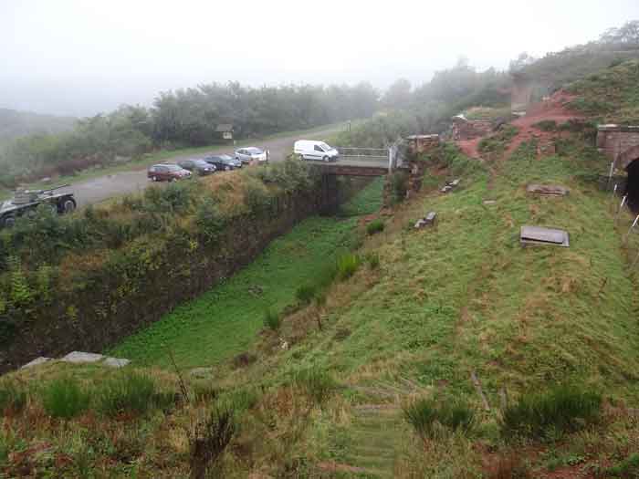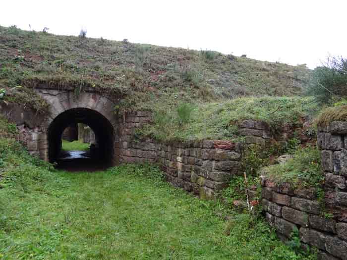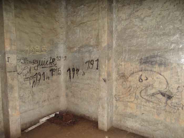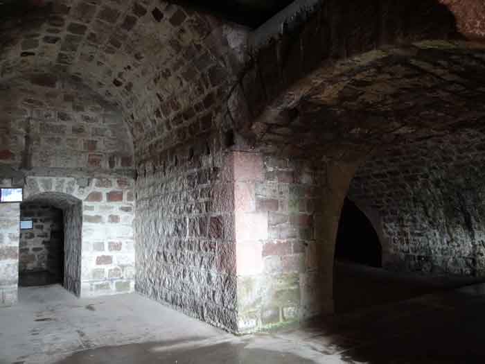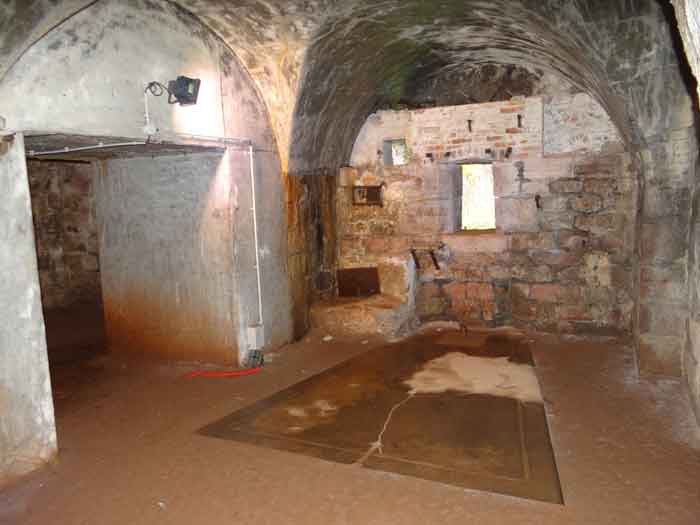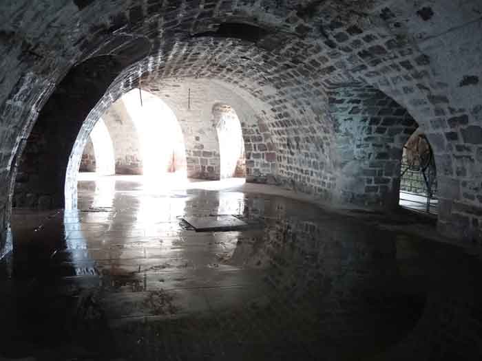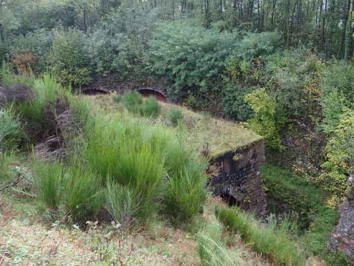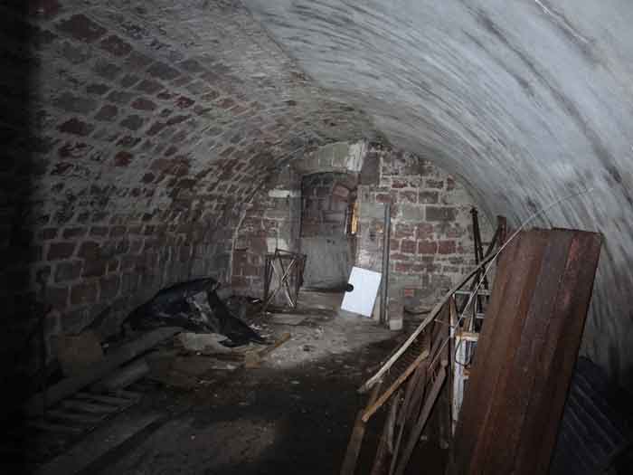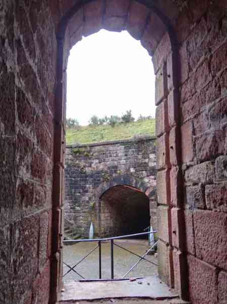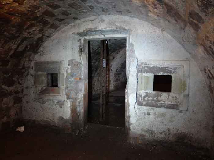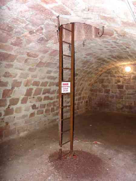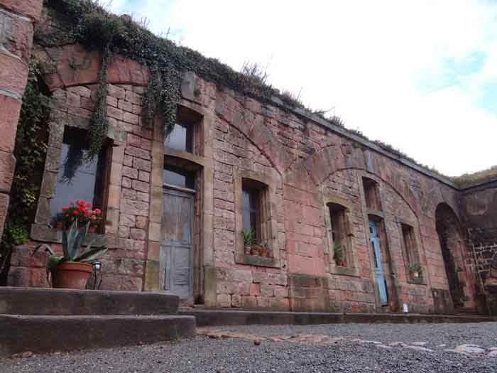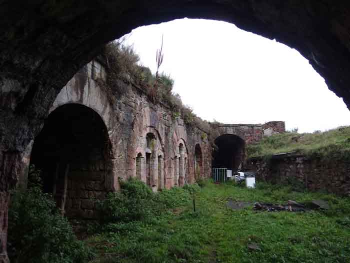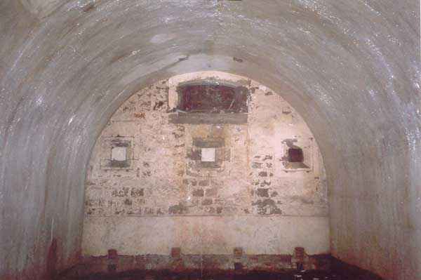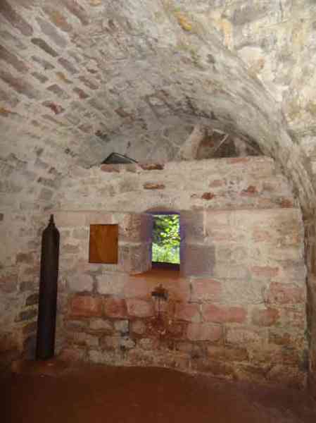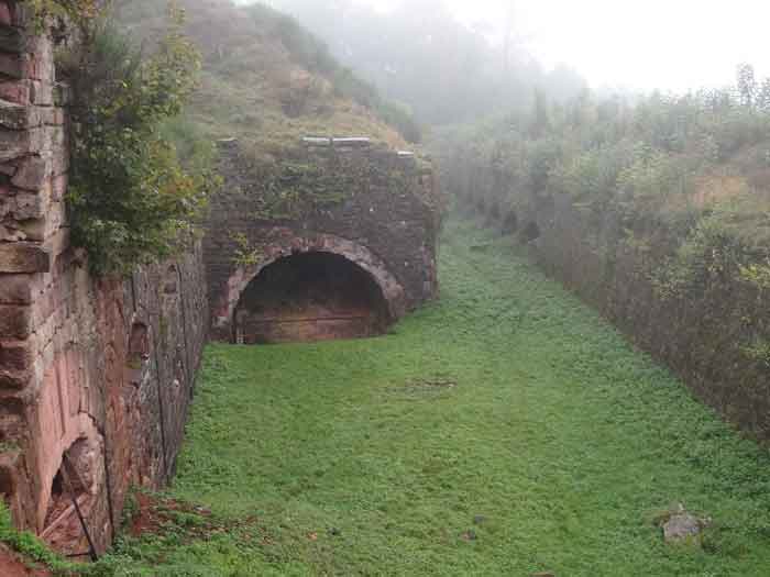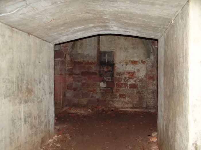 Upper Moselle Curtain, 1875-1879. 580 m/alt. 645 men and 35 guns. Called Fort Dorsner. Dominated 2000 m to the northwest by Mount Ordon-Verrier (963 m/alt), 1800 m to the north by the Tête des Planches (636 m/alt), 2800 m to the northeast by Mount Jean (786 m/alt) and 6000 m to the east by the Fayé (915 m/alt), there could be no question of building a conventional fort. Guardian of the road descending from the Ballon d'Alsace towards Belfort, it occupied a position of prime importance which, added to its potential vulnerability, justified the unusual expense, since only the forts of Manonviller and Barbonnet can boast the installation of two Mougin Mle 1876 turrets. Trapezoid with a curtain wall at the throat, this fort appears concentrated, which the available space and the threat of nearby heights made obligatory. The ten bays of the barracks are aligned at the back of the curtain wall one level lower than the entrance porch. These ten bays were separated into two series of five by the drawbridge maneuvering room. The curtain wall vaults are both equipped with a large visor, a protective device characteristic of exposed organs. Once through the entrance porch, a transverse gallery leads on either side to a small courtyard whose rooms backing onto the lateral fronts show a concrete covering dating from the reinforcements of 1914-1916. Behind the rooms in the left courtyard stretches the powder magazine. This is reported to have a capacity of 102,000 kg, which seems optimistic to us. Its storage room, with three lamp battlements on the same line, has its partitions entirely covered with a cement film. The tunnel in the capital opens onto a small octagonal courtyard surrounded, except on the gorge side, by two floors of rooms and casemates. We have here the most original and, even if it is a necessarily subjective judgment, the prettiest of the courtyards of all the forts of the Séré de Rivières system. Very carefully crafted, its masonry of pink Vosges sandstone rubble and the harmony of the arches of the bays opening onto it contribute to its majesty. Tactically speaking, however, one could compare it, depending on whether one is on the plain or on a height, with a golf course hole or a basketball hoop, which it was convenient for the attacker to hit with his projectiles. Laterally, there are still two large barracks for the troops while towards the front, on either side of the capital, we find the substructures of the turrets. These premises are superb and include some of the most beautiful achievements in rubble masonry that we have ever seen. Everything here is curves, vaults, wells, arcades, in sandstone of excellent texture. Texture perhaps, but, for the record, during the test firing of the two turrets, these masonry will be the source of some fears. A gallery envelops these substructures while serving no less than six casemates for indirect fire whose embrasures break the monotony of the parados of the rampart street. The latter served three shelter traverses, two of which were rooted, on each of the lateral fronts of the fort. The front of head had only two while salients II and III were furnished with an infantry caponette. The aileron of salient II and the double caponier of salient III have, like the chests of the curtain wall, large visors, which makes Giromagny a unique case with all its ditch defense organs arranged in this way. Modernized in 1888, 1913 and then from 1914 to 1916, it did not receive any additional armor, not even an armored observation deck for the turrets. These will, however, be framed by two concrete observation decks, accessible by wells with ladders drilled in 1913 in the vaults of the casemates on level + 1 of their substructures. The caponiers will be reinforced by a thickness of interior concrete, somewhat reducing the available space. Two small magazines under rock will be dug in 1888 under salients I and IV. They will be reached by an extension on either side of the circulation corridor at the rear of the barracks occupying the curtain wall. Their access corridor will be extended in 1914-15 by a staircase descending and reaching two large cave shelters. The one on the left will be built a kind of concrete sarcophagus isolated from the walls of the shelter and in which a mischievous hand left some charcoal sketches. Each of these shelters will be provided with a low gallery leading under the glacis to the gorge of the fort, gallery serving as a possible emergency exit as well as a drainage of condensation water. The turrets will unfortunately be scrapped during the Second World War and the occupier will see fit to dynamite the entrance porch of the fort when he leaves. The fort had two annex batteries. The first, close to salient IV and connected to the fort by a covered way, was armed around 1885 with 3 120 mm L de Bange guns which allowed it to enfilade the Riervescemont valley. It consisted of three artillery platforms separated by solid traverses. Located on the right of a hairpin bend in the access road to the fort, it had a small square guardhouse, with internal dimensions of 7.50 m, the vault of which was supported by a central pillar with a section of 1.50 m. The second, further north, is called "Battery of the Tête des Planches". Managed by an association since 1988, this superb fort, which we highly recommend visiting, is open to the public. In addition to its remarkable architecture in every way, the visitor will perfectly understand the service of a caponier thanks to a superb replica of a 12-breech cannon and a reconstructed acetylene factory.