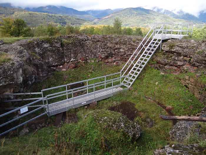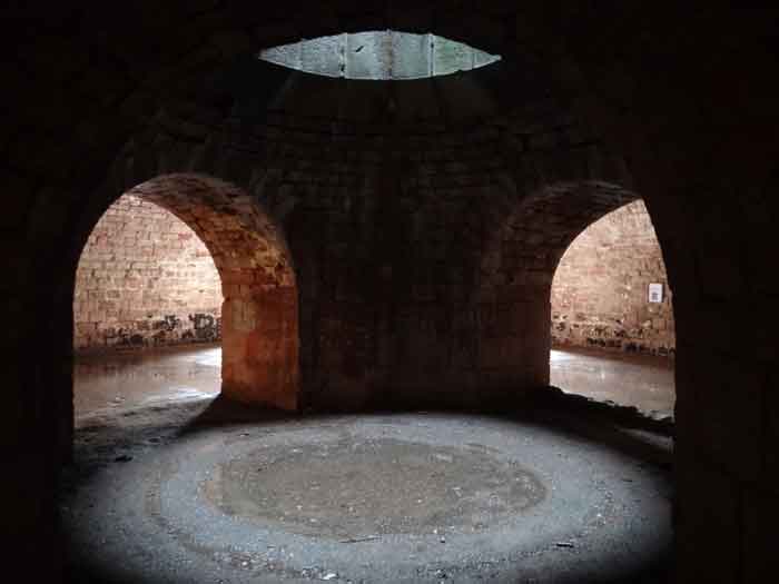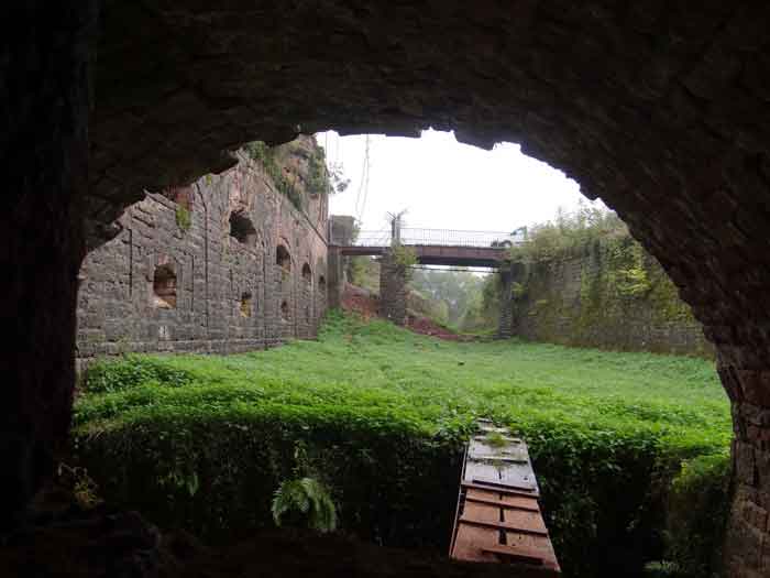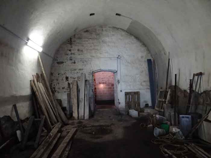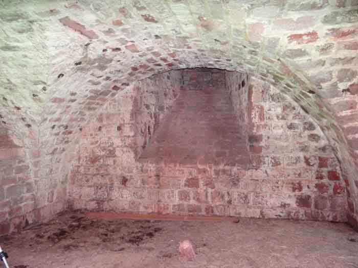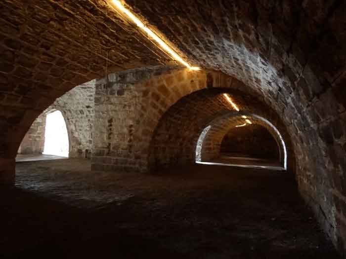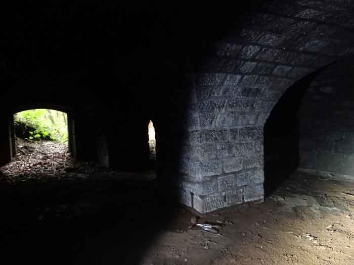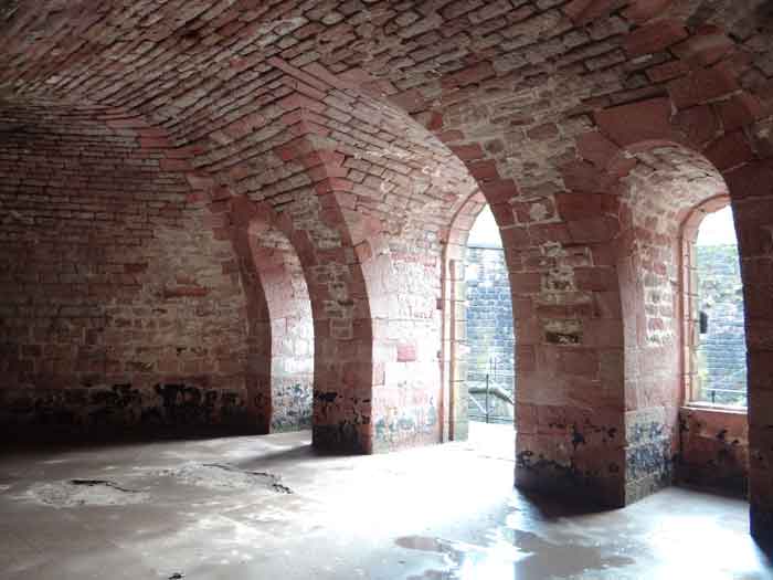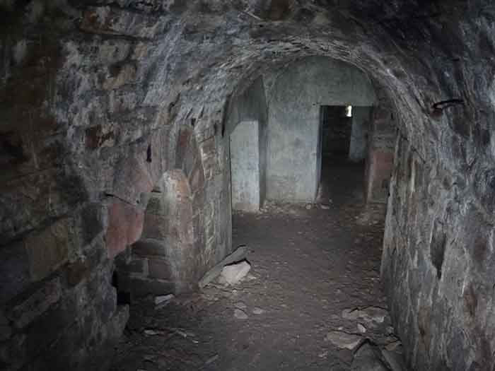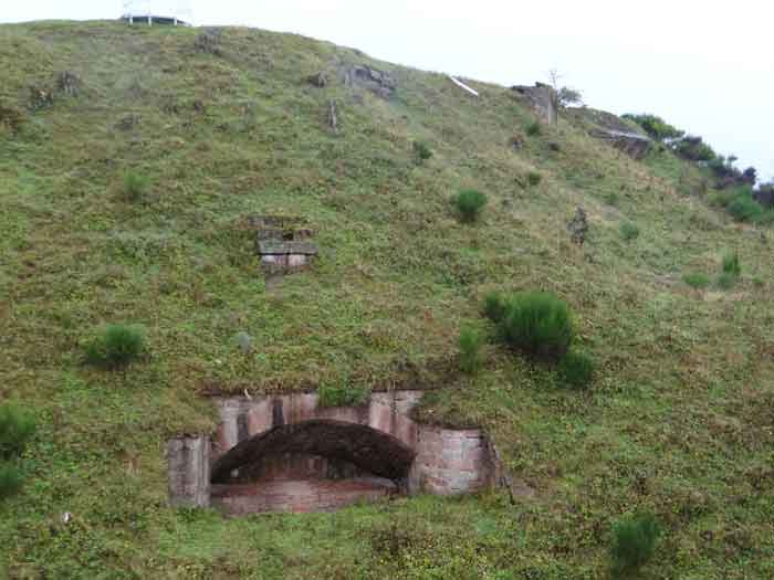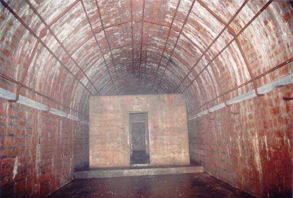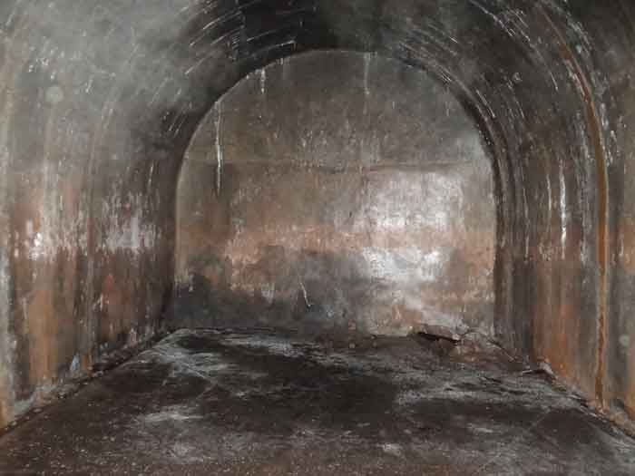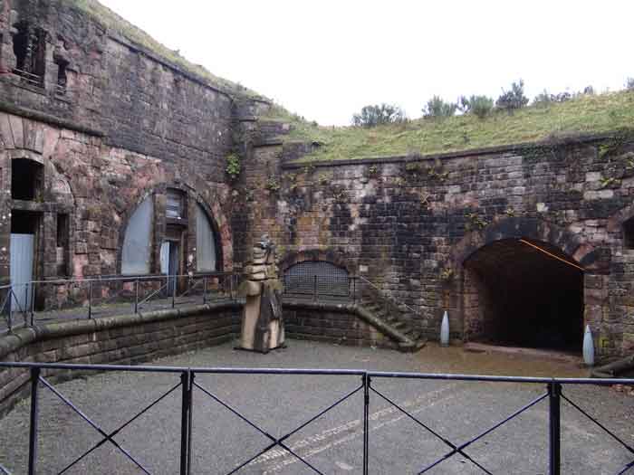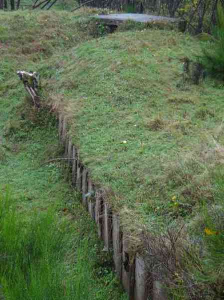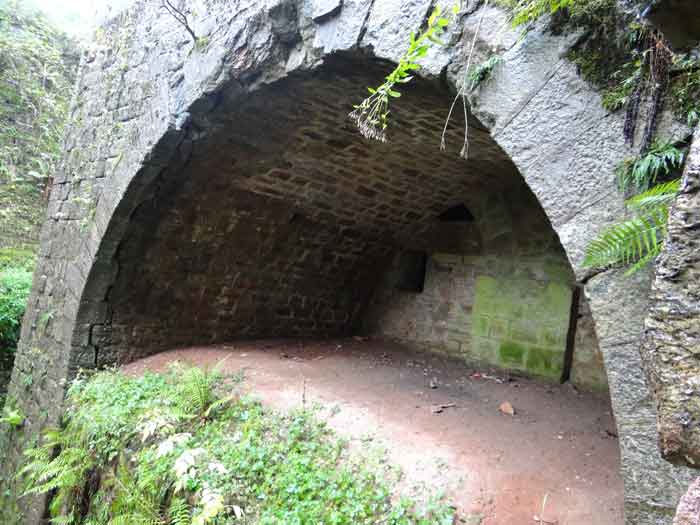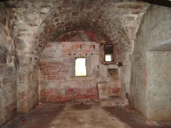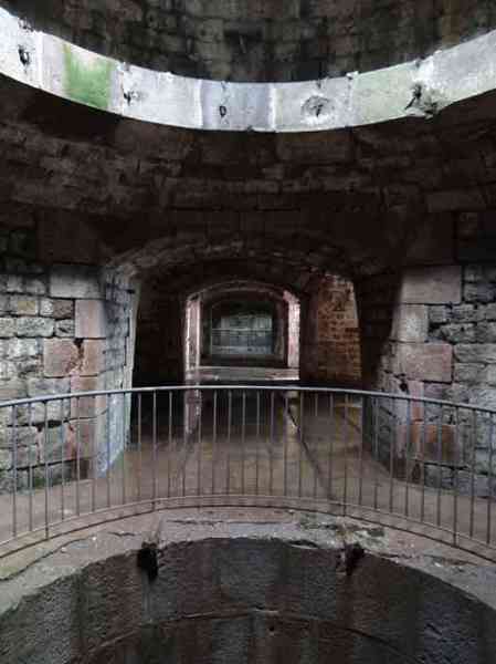 Upper Moselle Curtain, 1875-1879. 580 m/alt. 645 men and 35 guns. Called Fort Dorsner. Dominated 2000 m to the northwest by Mount Ordon-Verrier (963 m/alt), 1800 m to the north by the Tête des Planches (636 m/alt), 2800 m to the northeast by Mount Jean (786 m/alt) and 6000 m to the east by the Fayé (915 m/alt), there could be no question of building a conventional fort. Guardian of the road descending from the Ballon d'Alsace towards Belfort, it occupied a position of prime importance which, added to its potential vulnerability, justified the unusual expense, since only the forts of Manonviller and Barbonnet can boast the installation of two Mougin Mle 1876 turrets. Trapezoid with a curtain wall at the throat, this fort appears concentrated, which the available space and the threat of nearby heights made obligatory. The ten bays of the barracks are aligned at the back of the curtain wall one level lower than the entrance porch. These ten bays were separated into two series of five by the drawbridge maneuvering room. The curtain wall vaults are both equipped with a large visor, a protective device characteristic of exposed organs. Once through the entrance porch, a transverse gallery leads on either side to a small courtyard whose rooms backing onto the lateral fronts show a concrete covering dating from the reinforcements of 1914-1916. Behind the rooms in the left courtyard stretches the powder magazine. This is reported to have a capacity of 102,000 kg, which seems optimistic to us. Its storage room, with three lamp battlements on the same line, has its partitions entirely covered with a cement film. The tunnel in the capital opens onto a small octagonal courtyard surrounded, except on the gorge side, by two floors of rooms and casemates. We have here the most original and, even if it is a necessarily subjective judgment, the prettiest of the courtyards of all the forts of the Séré de Rivières system. Very carefully crafted, its masonry of pink Vosges sandstone rubble and the harmony of the arches of the bays opening onto it contribute to its majesty. Tactically speaking, however, one could compare it, depending on whether one is on the plain or on a height, with a golf course hole or a basketball hoop, which it was convenient for the attacker to hit with his projectiles. Laterally, there are still two large barracks for the troops while towards the front, on either side of the capital, we find the substructures of the turrets. These premises are superb and include some of the most beautiful achievements in rubble masonry that we have ever seen. Everything here is curves, vaults, wells, arcades, in sandstone of excellent texture. Texture perhaps, but, for the record, during the test firing of the two turrets, these masonry will be the source of some fears. A gallery envelops these substructures while serving no less than six casemates for indirect fire whose embrasures break the monotony of the parados of the rampart street. The latter served three shelter traverses, two of which were rooted, on each of the lateral fronts of the fort. The front of head had only two while salients II and III were furnished with an infantry caponette. The aileron of salient II and the double caponier of salient III have, like the chests of the curtain wall, large visors, which makes Giromagny a unique case with all its ditch defense organs arranged in this way. Modernized in 1888, 1913 and then from 1914 to 1916, it did not receive any additional armor, not even an armored observation deck for the turrets. These will, however, be framed by two concrete observation decks, accessible by wells with ladders drilled in 1913 in the vaults of the casemates on level + 1 of their substructures. The caponiers will be reinforced by a thickness of interior concrete, somewhat reducing the available space. Two small magazines under rock will be dug in 1888 under salients I and IV. They will be reached by an extension on either side of the circulation corridor at the rear of the barracks occupying the curtain wall. Their access corridor will be extended in 1914-15 by a staircase descending and reaching two large cave shelters. The one on the left will be built a kind of concrete sarcophagus isolated from the walls of the shelter and in which a mischievous hand left some charcoal sketches. Each of these shelters will be provided with a low gallery leading under the glacis to the gorge of the fort, gallery serving as a possible emergency exit as well as a drainage of condensation water. The turrets will unfortunately be scrapped during the Second World War and the occupier will see fit to dynamite the entrance porch of the fort when he leaves. The fort had two annex batteries. The first, close to salient IV and connected to the fort by a covered way, was armed around 1885 with 3 120 mm L de Bange guns which allowed it to enfilade the Riervescemont valley. It consisted of three artillery platforms separated by solid traverses. Located on the right of a hairpin bend in the access road to the fort, it had a small square guardhouse, with internal dimensions of 7.50 m, the vault of which was supported by a central pillar with a section of 1.50 m. The second, further north, is called "Battery of the Tête des Planches". Managed by an association since 1988, this superb fort, which we highly recommend visiting, is open to the public. In addition to its remarkable architecture in every way, the visitor will perfectly understand the service of a caponier thanks to a superb replica of a 12-breech cannon and a reconstructed acetylene factory.