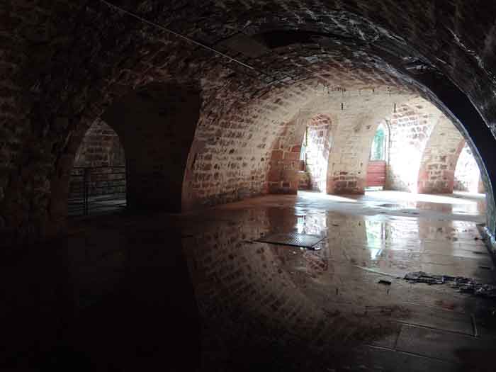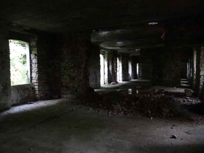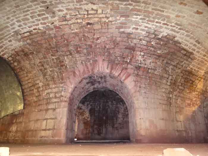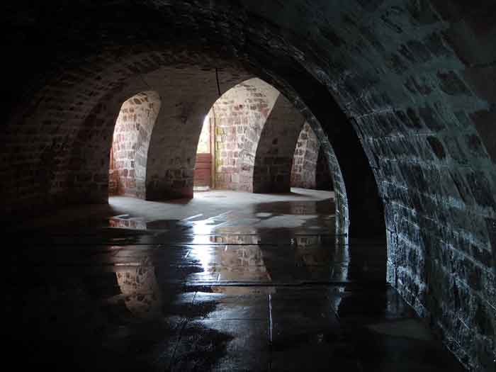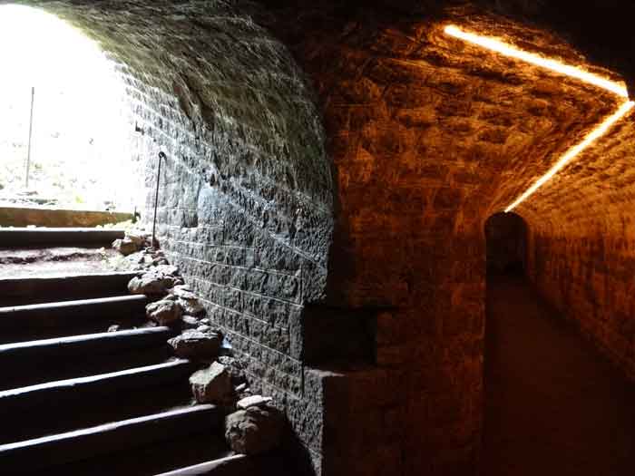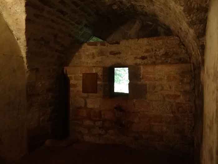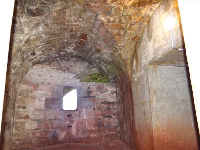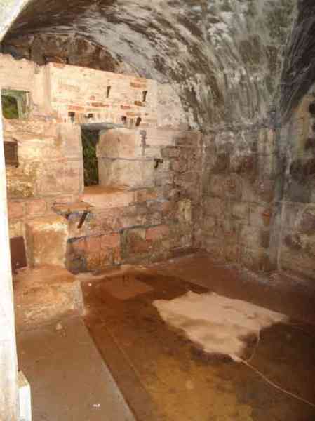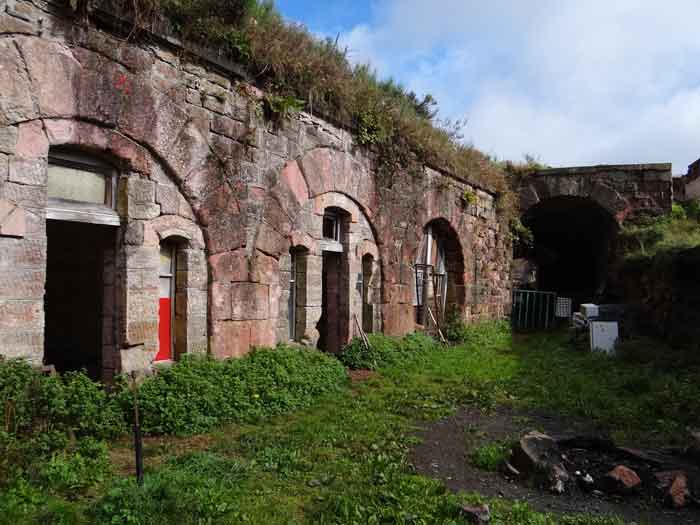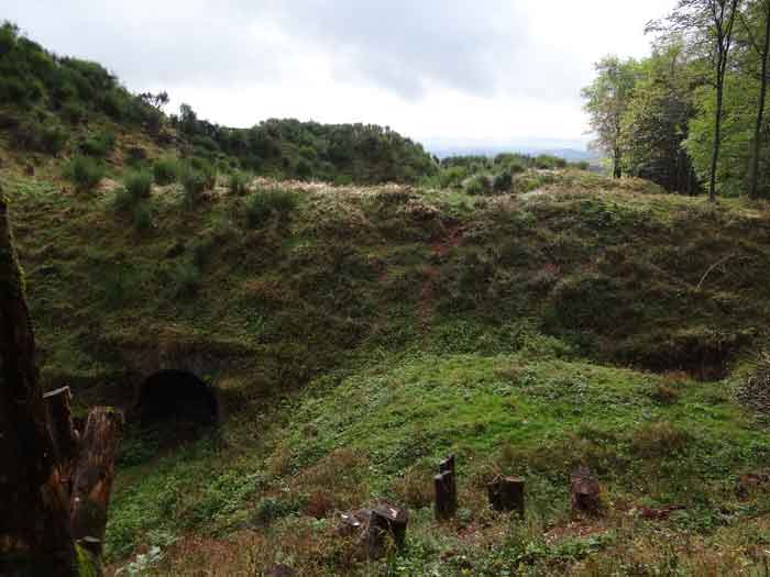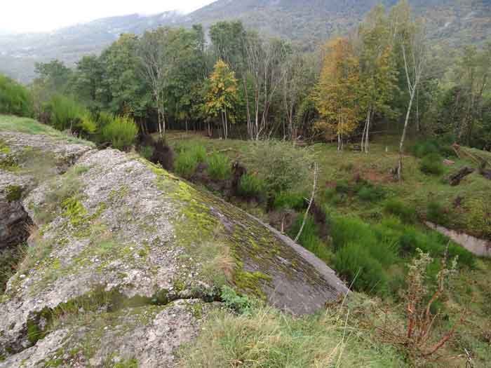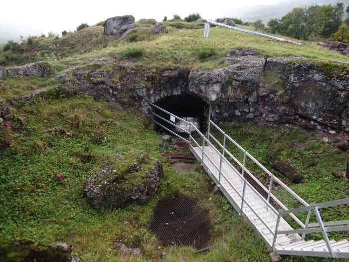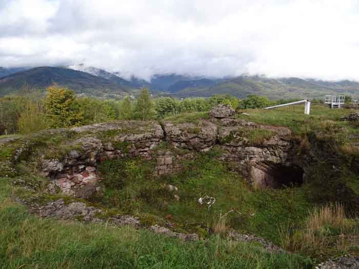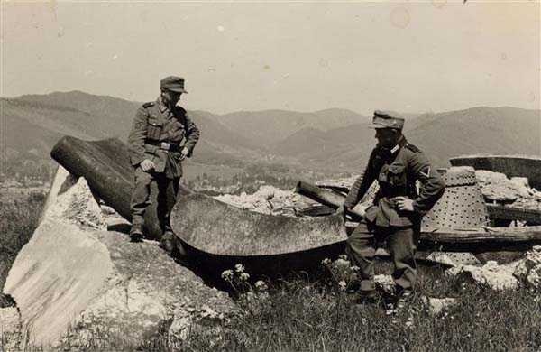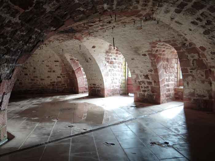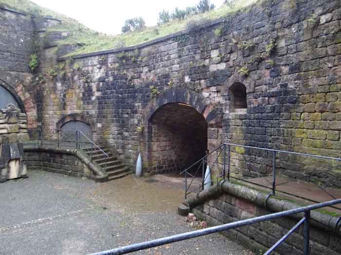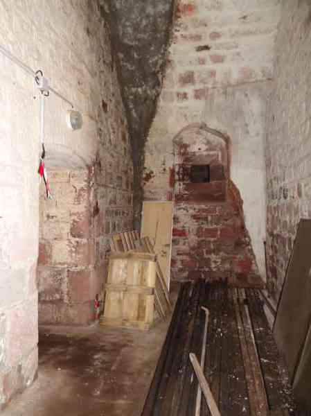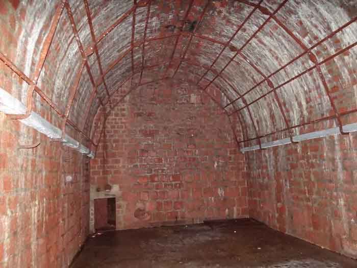 Upper Moselle Curtain, 1875-1879. 580 m/alt. 645 men and 35 guns. Called Fort Dorsner. Dominated 2000 m to the northwest by Mount Ordon-Verrier (963 m/alt), 1800 m to the north by the Tête des Planches (636 m/alt), 2800 m to the northeast by Mount Jean (786 m/alt) and 6000 m to the east by the Fayé (915 m/alt), there could be no question of building a conventional fort. Guardian of the road descending from the Ballon d'Alsace towards Belfort, it occupied a position of prime importance which, added to its potential vulnerability, justified the unusual expense, since only the forts of Manonviller and Barbonnet can boast the installation of two Mougin Mle 1876 turrets. Trapezoid with a curtain wall at the throat, this fort appears concentrated, which the available space and the threat of nearby heights made obligatory. The ten bays of the barracks are aligned at the back of the curtain wall one level lower than the entrance porch. These ten bays were separated into two series of five by the drawbridge maneuvering room. The curtain wall vaults are both equipped with a large visor, a protective device characteristic of exposed organs. Once through the entrance porch, a transverse gallery leads on either side to a small courtyard whose rooms backing onto the lateral fronts show a concrete covering dating from the reinforcements of 1914-1916. Behind the rooms in the left courtyard stretches the powder magazine. This is reported to have a capacity of 102,000 kg, which seems optimistic to us. Its storage room, with three lamp battlements on the same line, has its partitions entirely covered with a cement film. The tunnel in the capital opens onto a small octagonal courtyard surrounded, except on the gorge side, by two floors of rooms and casemates. We have here the most original and, even if it is a necessarily subjective judgment, the prettiest of the courtyards of all the forts of the Séré de Rivières system. Very carefully crafted, its masonry of pink Vosges sandstone rubble and the harmony of the arches of the bays opening onto it contribute to its majesty. Tactically speaking, however, one could compare it, depending on whether one is on the plain or on a height, with a golf course hole or a basketball hoop, which it was convenient for the attacker to hit with his projectiles. Laterally, there are still two large barracks for the troops while towards the front, on either side of the capital, we find the substructures of the turrets. These premises are superb and include some of the most beautiful achievements in rubble masonry that we have ever seen. Everything here is curves, vaults, wells, arcades, in sandstone of excellent texture. Texture perhaps, but, for the record, during the test firing of the two turrets, these masonry will be the source of some fears. A gallery envelops these substructures while serving no less than six casemates for indirect fire whose embrasures break the monotony of the parados of the rampart street. The latter served three shelter traverses, two of which were rooted, on each of the lateral fronts of the fort. The front of head had only two while salients II and III were furnished with an infantry caponette. The aileron of salient II and the double caponier of salient III have, like the chests of the curtain wall, large visors, which makes Giromagny a unique case with all its ditch defense organs arranged in this way. Modernized in 1888, 1913 and then from 1914 to 1916, it did not receive any additional armor, not even an armored observation deck for the turrets. These will, however, be framed by two concrete observation decks, accessible by wells with ladders drilled in 1913 in the vaults of the casemates on level + 1 of their substructures. The caponiers will be reinforced by a thickness of interior concrete, somewhat reducing the available space. Two small magazines under rock will be dug in 1888 under salients I and IV. They will be reached by an extension on either side of the circulation corridor at the rear of the barracks occupying the curtain wall. Their access corridor will be extended in 1914-15 by a staircase descending and reaching two large cave shelters. The one on the left will be built a kind of concrete sarcophagus isolated from the walls of the shelter and in which a mischievous hand left some charcoal sketches. Each of these shelters will be provided with a low gallery leading under the glacis to the gorge of the fort, gallery serving as a possible emergency exit as well as a drainage of condensation water. The turrets will unfortunately be scrapped during the Second World War and the occupier will see fit to dynamite the entrance porch of the fort when he leaves. The fort had two annex batteries. The first, close to salient IV and connected to the fort by a covered way, was armed around 1885 with 3 120 mm L de Bange guns which allowed it to enfilade the Riervescemont valley. It consisted of three artillery platforms separated by solid traverses. Located on the right of a hairpin bend in the access road to the fort, it had a small square guardhouse, with internal dimensions of 7.50 m, the vault of which was supported by a central pillar with a section of 1.50 m. The second, further north, is called "Battery of the Tête des Planches". Managed by an association since 1988, this superb fort, which we highly recommend visiting, is open to the public. In addition to its remarkable architecture in every way, the visitor will perfectly understand the service of a caponier thanks to a superb replica of a 12-breech cannon and a reconstructed acetylene factory.