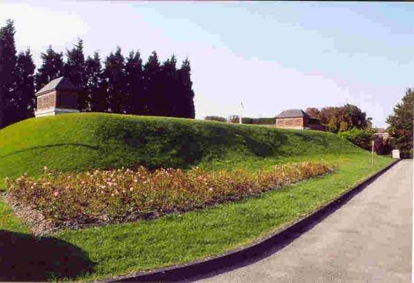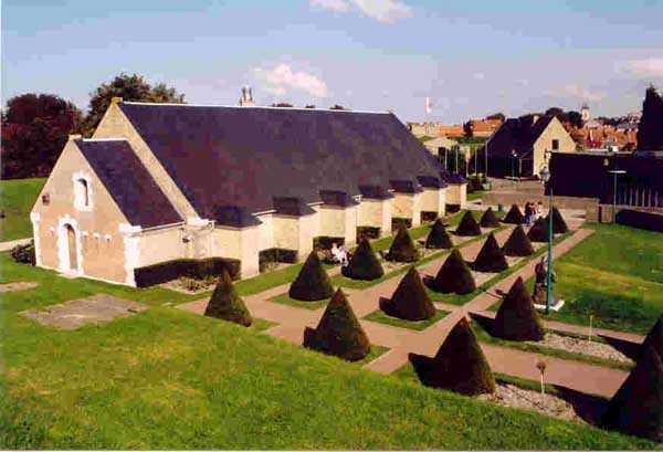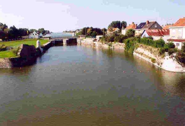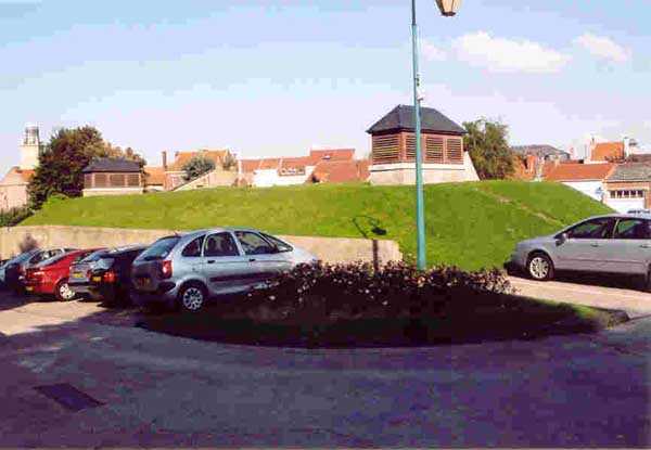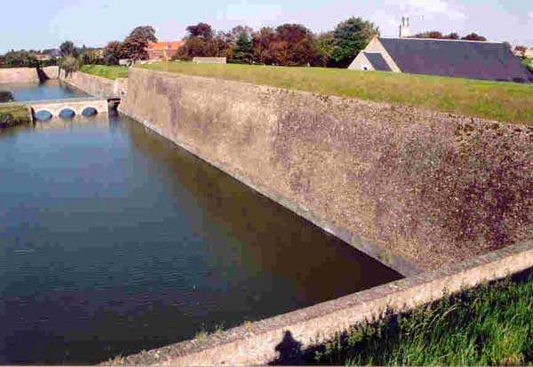 Dept 59 (Nord). Zuerst spanisch, dann französisch, diese bastionierte Küstenfestung liegt auf halbem Weg zwischen Calais und Dünkirchen. Sie war durch einen Kanal mit dem Meer verbunden, dessen Mündung von zwei Forts bewacht wurde, die heute verschwunden sind, aber ihren Namen den neuen Ortschaften geliehen haben, die an ihrer Stelle entstanden sind: Petit Fort Philippe und Grand Fort Philippe. Sie schützte die möglichen Überschwemmungsmanöver im Delta der Aa. Nach dem Bau von zwei Pulvermagazinen beschloss der Oberste Kriegsrat, sie "in ihrem aktuellen Zustand" zu erhalten, am 1. Oktober 1888. Keine Bewaffnung war auf das Meer ausgerichtet und es scheint kein Traversenunterstand gebaut worden zu sein; daher fragen wir uns, was die beiden Pulvermagazine hätten versorgen sollen. Das erste davon liegt außen am Bollwerk an, das als Zitadelle/Redoute dient. Es stammt aus dem Jahr 1877 und trägt einen Stein mit der Aufschrift "MP 1 S". Letzterer ähnelt bemerkenswert gut dem Modell… von 1879. Seine einzige Lampenscharte ist an der Deckenwölbung angebracht. Es dient heute (09/2004) als Ausstellungsraum. Das zweite, am gegenüberliegenden Ende der Stadt, trägt einen Stein mit der eingravierten Inschrift "MP 1bis (?)". Dieses Magazin wird vor Ort als "Pulvermagazin Maréchal de la Meilleraye" bezeichnet. Der Fußweg um die Stadt ist sehr angenehm. Man kann die Pulverkammer der Zitadelle (1742), die Kaserne Varennes und die bombensichere Kaserne Uxelles sehen. Ein weiteres beeindruckendes Element ist der Zisternenbau von 1724, erbaut oberirdisch, mit einem Fassungsvermögen von 1420 m³. Die Festung wurde 1902 außer Dienst gestellt.