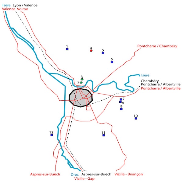 Dept 38 (Isère). Festung zweiter Linie am Zusammenfluss von Isère und Drac. Eingebettet zwischen den Gebirgsmassiven der Chartreuse, von Belledonne und des Vercors, umfasst sie 6 Forts, 1 Werk und 1 Batterie; dies ohne Berücksichtigung der Nebenstellungen der Forts. Die Zitadelle der Stadt, genannt "la Bastille", war militärisch besetzt und beherbergte insbesondere ein Relais für optische Kommunikation. Die allein 6 Forts beherbergten ± 130 Geschütze für eine auf 2689 Mann festgelegte Besatzung. Alle Forts wurden zwischen 1875 und 1879 erbaut mit Ausnahme von Comboire, das zwischen 1882 und 1885 entstehen wird. Es wird keine Modernisierung geben außer der Aushöhlung von Felsmagazinen in der Nähe von 4 der 6 Forts.
