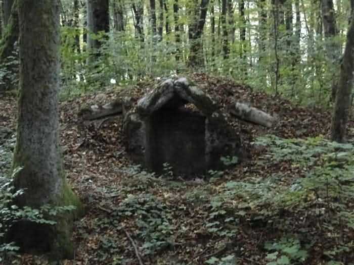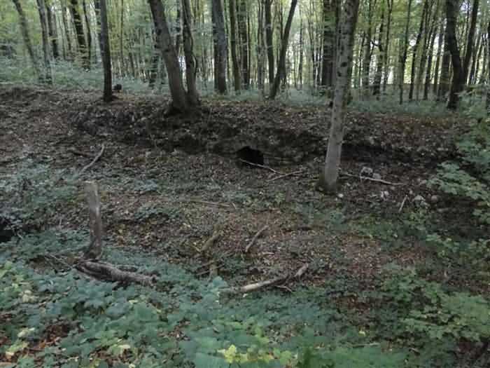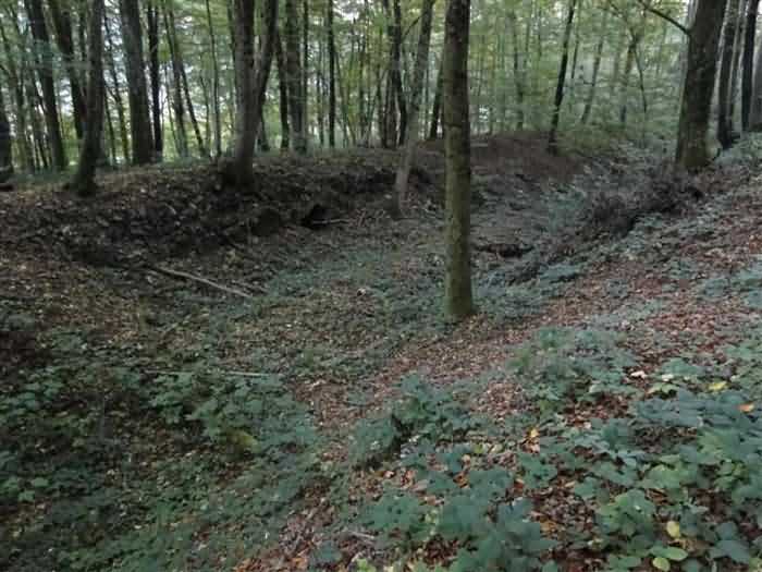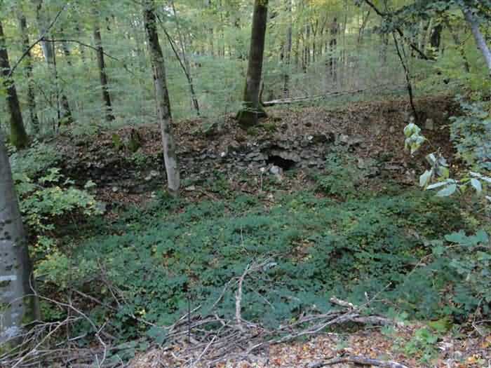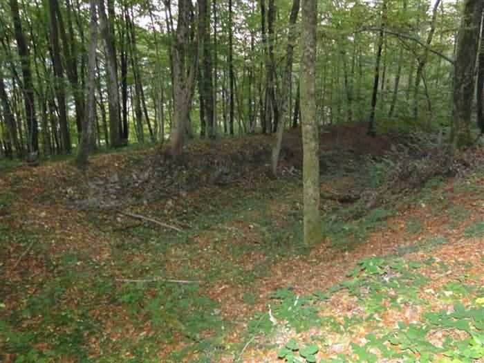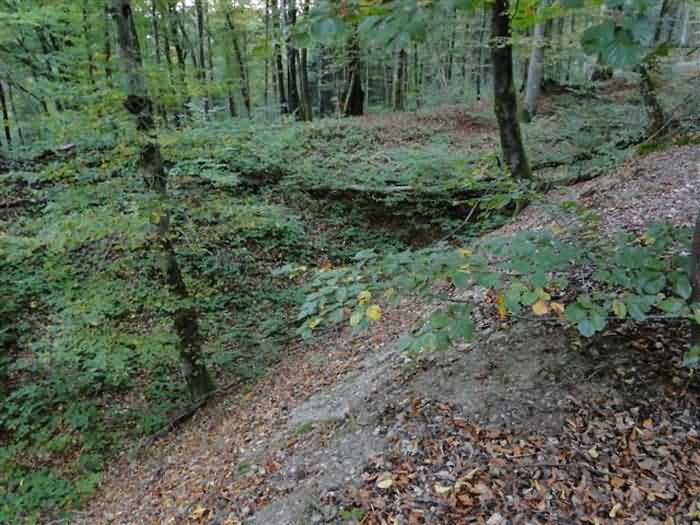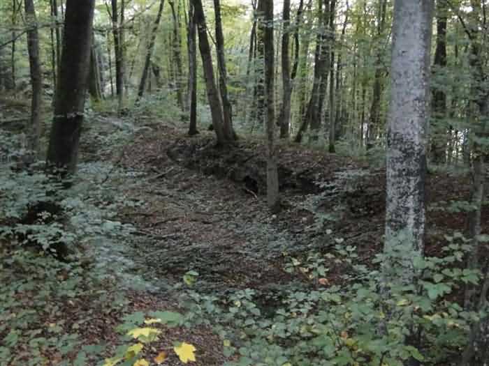 Belfort fortified camp, northwest of the city, 1890-1891. 480 m/alt. Terraced infantry structure stretching in an arc approximately 150 meters long. Consisting of a fairly wide and deep trench, there are three masonry parapets about ten meters long with an ammunition niche in their center. A small observatory, the roof of which was made of moistened cement bags, breaks the monotony of the place by its presence. The structure is located 350 m southwest of the structure North of Salbert, at the foot of the Salbert mountain. Free access and very degraded (10/2010).
