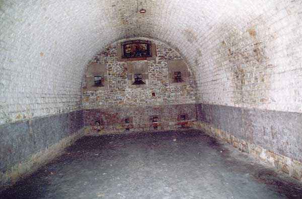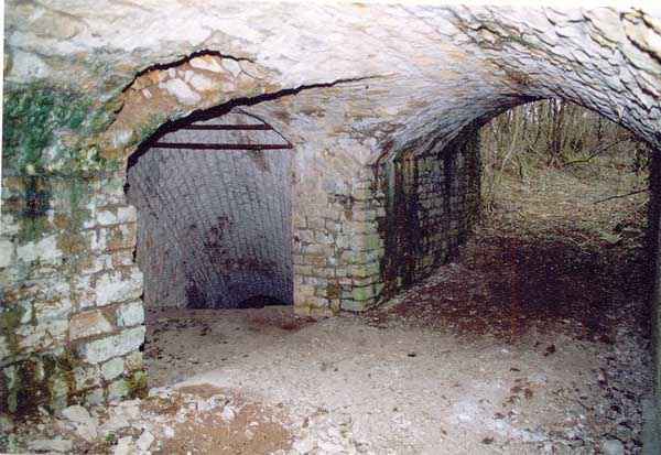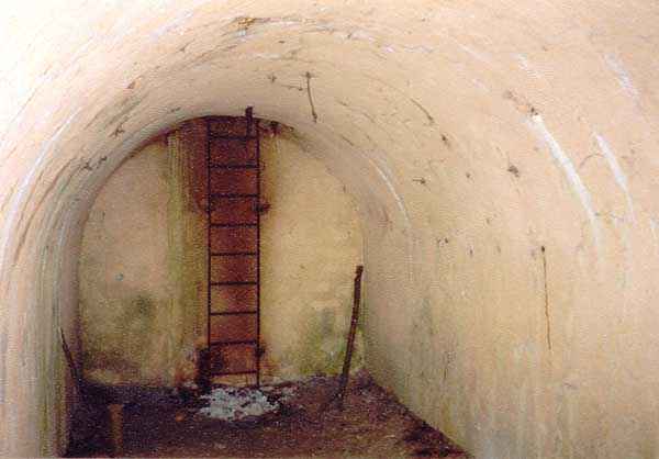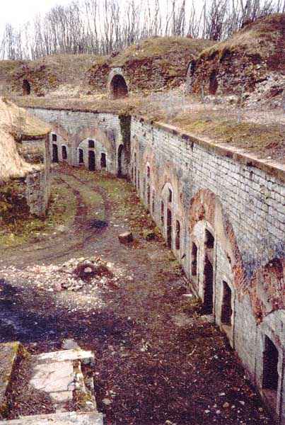 Belfort fortified camp, southeast of the city, 1874-1877. 443 m/alt. A position of prime importance during the Franco-Prussian War, which it was decided to fortify permanently. 228 men and 20 guns, including 12 rampart guns, 6 flanking guns, and 2 mortars. Pentagonal fort whose gorge is reminiscent of that of the Basses Perches. Each small flank includes two low battery shelter traverses. Six other shelter traverses form the cavalier surmounting the ten bays of the barracks arranged in a two-branch chevron of five bays. During our visit in February 2002, recent clearing work gave us the rare opportunity to have a complete view of this cavalier. Unfortunately, some of its sleepers have suffered damage due to bad weather. Also noteworthy, capping the fifth sleeper of the cavalier and accessible by steps from inside this sleeper, is a concrete observatory, probably built during the First World War. The barracks are quite classic except that, made of grayish rubble masonry, the arches emphasizing the bays are made of terracotta bricks arranged vertically, which is very original even if these arches were initially covered with a film of cement. Behind the sleeper shelters on each small flank, we find a powder magazine whose entrance faces the gorge. The facade of the right magazine has been repaired and the interior of both is still sound. If the wing of salient II shows a Mle 1886 platform for its 12-pounder gun, in the wing of salient IV, we find a mixed Mle 1866 platform… To our great shame, we must admit that we do not know what type of platform is in the head caponier. On the side flanking salient II, it is a Mle 1886, but on the other? We forgot to take a photo. The wall markers for aiming the 12-pounder gun are present. The ditches of the fort are unfortunately filled. An infantry position surrounds salient II about twenty meters in front of the latter on the glacis. Military terrain still used for exercises by the 35th Infantry Regiment (info 10/2007). Access prohibited.