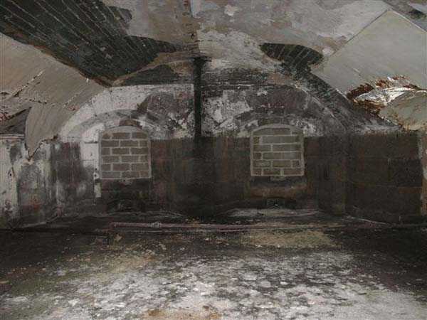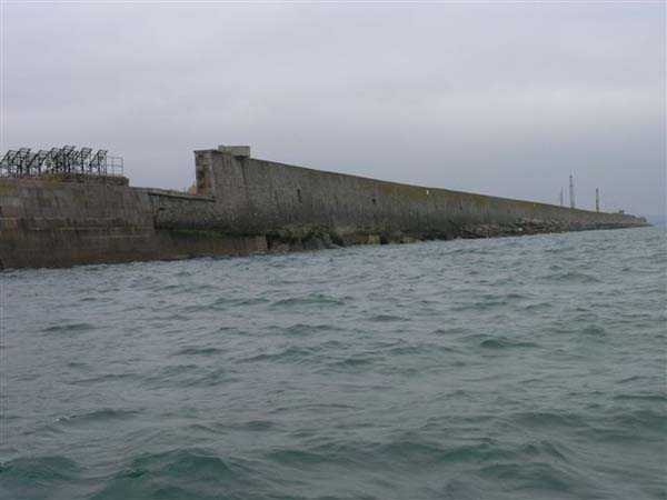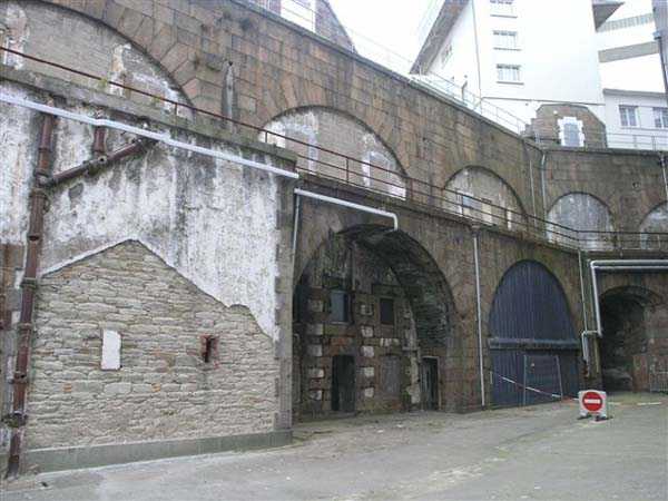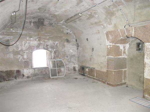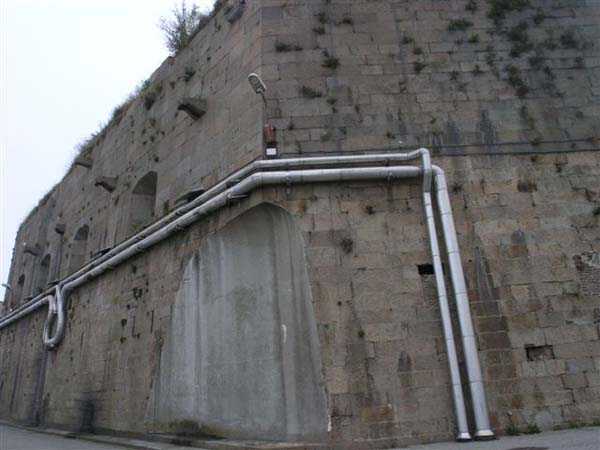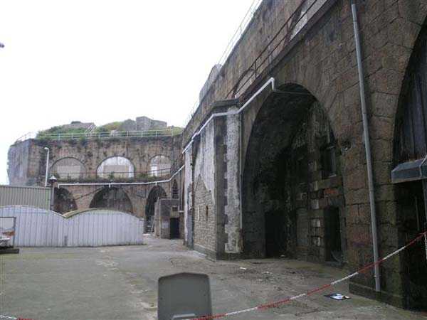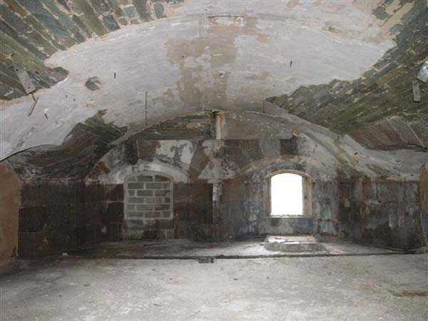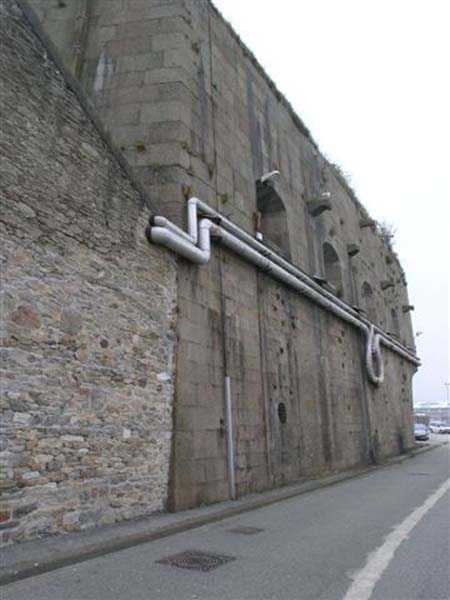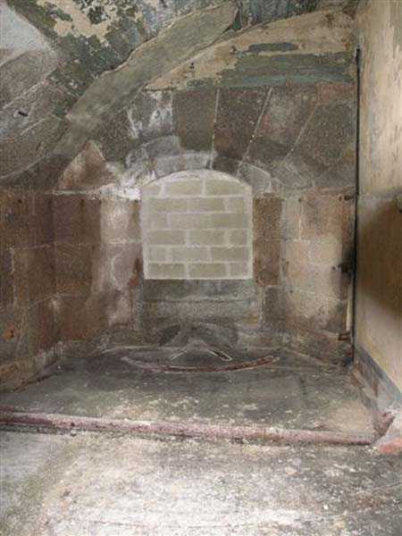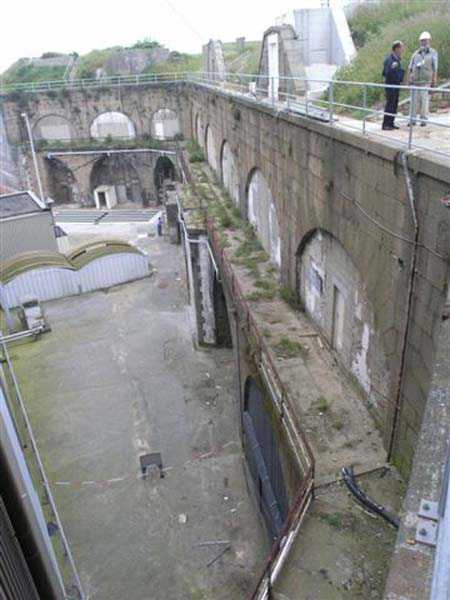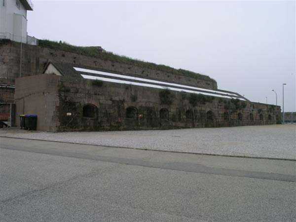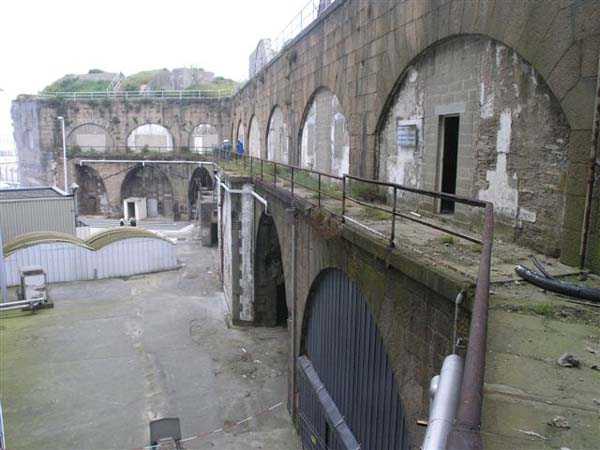 Fortress of Cherbourg, north of the town, on the left of the small roadstead, 1779-1785. Irregular heptagon, situated to the right of bastion I of the arsenal enclosure. Rooted at the base of the dyke of the same name, which encloses the west of the small roadstead of Cherbourg, this two-storey work will undergo practically no modernisation and its armament will be revised downwards until it disappears totally. A firing plan of 1881 assigns it no field of fire. Originally, it was surrounded by a ditch and had two entrances. If we count the salients from the south entrance, we will note that a gallery of 31 firing casemates preceded the ditch on fronts II-III, III-IV, IV-V and partially V-VI. These casemates will lose their importance when the West dyke is erected, as well as Chavagnac fort. The fort comprises casemates for housing about 400 men. There were stored, besides the torpedoes of the submarines and torpedo boats, the ammunition of the mobile defence. In 1891, the observation post of the torpedo line as well as two searchlights were set up there, namely: a 150 cm light at the north angle of the envelope battery and a 90 cm light on the banquette of the access road to the fort. It was at one time considered to concrete this fort, as will be done for the works of the large dyke. Previously, in 1878, it was considered to build in its courtyard a powder magazine model 1874 with a capacity of 19600 kg, but that remained without follow-up. Around 1900, it was on its superstructures that the salute battery was installed which, every day at 05:30, fired the reveille and at 20:00 the retreat. This salute battery was later moved to cavalier XIII-XIV of the arsenal, as attested by numerous postcards. Of this superb granite fort, only fronts III-IV and IV-V as well as stumps of II-III and V-VI remain today (06/2007). Despite these mutilations, the wall still rises proudly and displays the perfection of its masonry combining granite (arkose?) and green schists. In front of front III-IV, eleven of the fourteen casemates of the envelope parallel to this front still exist. On the other hand, of the ditch separating them, nothing remains. The porch allowing access from the fort to the envelope via salient V shows meagre remains of a drawbridge system with two small pulleys placed on the same plane and distant about thirty centimetres from each other. The casemates on the ground floor have the particularity of each possessing five windows in two rows. While the casemates of the envelope are designated by a letter, those on the first floor are numbered with Roman numerals on their pediment. The fourth is singularly designated IIII. All still possess their arch on which the rear wheels of the P.A. mountings rolled. Apart from a small generator plinth difficult to date, nothing distinguishes the observation post of the torpedo line from the other casemates. However, it should be noted in this room a mural fresco partly using the navy blue typical of French coastal works of the Interwar period, a fresco representing an orchestra and dancers. The top of the fort received small hollow traverses in 1867 but also and especially a battery of 2 x 75 mm Sa model 1908 Schneider in 1927. This battery, initially planned for six pieces, then reduced to three and finally to two, was only handed over to the coastal battalion in 1931. Its pieces were scuttled on 19 June 1940, but miraculously one of the two guns is still in place. Its mounting and its emplacement are partially buried and the upper part of its armoured mask ended up with a scrap dealer, but this very rare piece (a second example of the 160 - number subject to reservation - built survives in Gâvres) deserves a better fate. Its fire control post is also located on the tops of the fort, in the extension of an old traverse to the right of the two emplacements. Fort du Homet is located in the perimeter of the Cherbourg arsenal depending on the DGA and is forbidden access. For information, let us note that the Homet dyke, built between 1909 and 1917, was also provided with a crenellated wall.