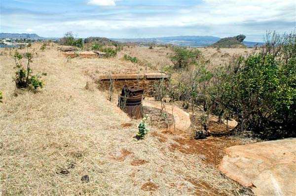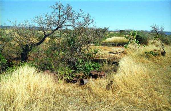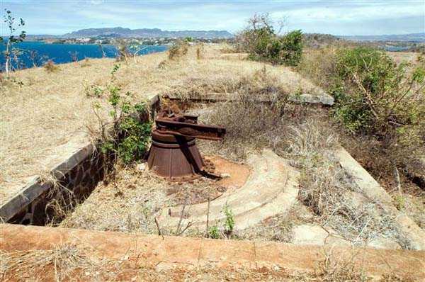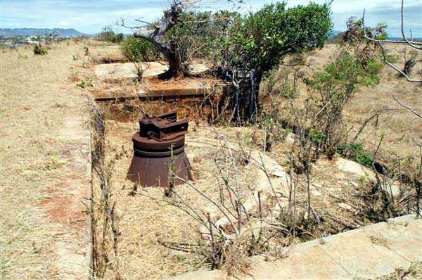 Diego-Suarez. Located between the battery of Andrahompotsy and Cap Diego, 35 m/alt, this battery was armed, in 1914, with 5 138 mm M guns Model 1870 on M mount Model 1897 PA. With this mount, the range of these guns is 7500 meters. The rate of fire is one shot per minute. The field of fire is 120°. The battery, built as early as 1891 and armed at that time with 10 138 mm guns Model 1870 on mount Model 1847, comprises 5 masonry emplacements, separated by traverse shelters. Each emplacement was designed to support 2 guns. As the mount Model 1897 PA allows for faster firing than the Model 1847, but requires a greater horizontal traverse, only one of these mounts could be installed per emplacement. There is no underground magazine, and ammunition supply is provided by the concrete magazines of Cap Diego. Nowadays, the battery is overgrown. It has retained its M mount Model 1897 bases and part of the chassis of the same mounts. Military land. JJM 02/12/07