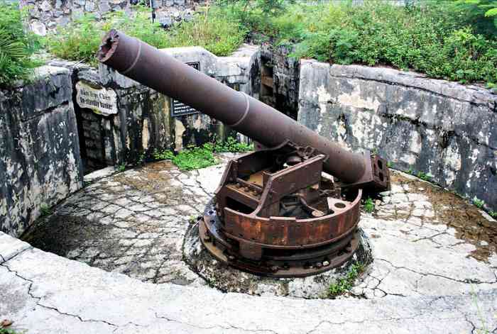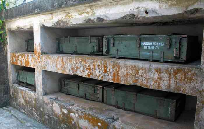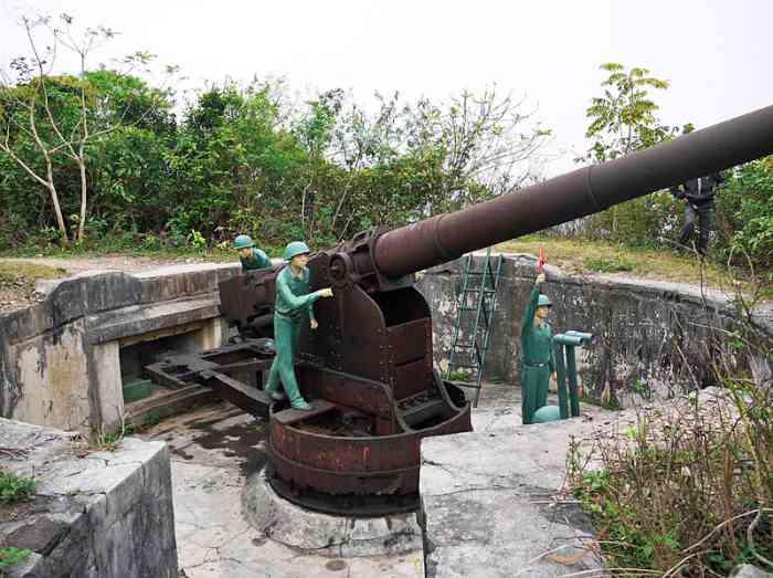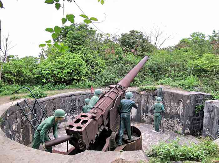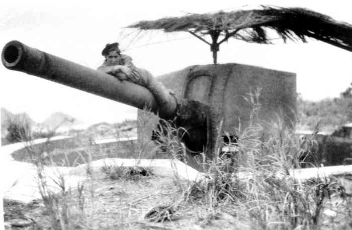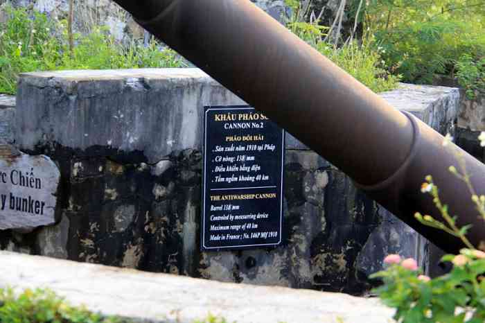 Haiphong. Baie d’Along. Batterie de trois canons de 138 Mle 1910 sur affût Mle 1919-25, réalisée au sud de l’île de Cat-Ba, en 1939. Les pièces sont installées dans des cuves en béton dotées de niches à munitions. La batterie dispose d’un télémètre H Mle 34, d’un conjugateur Colonies et d’un projecteur de 150 GP. Elle reste armée pendant toute la durée du conflit. Le 7 mars 1946, aux mains du Vietminh, elle tire, sans succès, sur l’escadre française transportant les troupes venues, dans le cadre de l’opération « Bentré », réoccuper le Tonkin. L’escorteur Algérien et le croiseur Émile Bertin sont visés. Ce dernier riposte par treize coups de 152. La batterie récidive le 28 novembre, en tirant sur le croiseur Suffren, qui riposte par soixante-neuf coups de 203. Cet ouvrage est devenu un lieu touristique, après que des canons de 138 Mle 1910, provenant peut-être de la batterie de l’Île de Tagne, aient été installés dans les cuves. Ils sont malheureusement démunis de leur masque. À la déclaration de guerre, la batterie d’Appowan a été complétée par une batterie de circonstance, armée de quatre canons de 75 Mle 1897 sur affût Mle 1916, installée en deux sections, à l’est et à l’ouest de la batterie de 138. Bucht von Along. Batterie von drei Kanonen 138 mm Mle 1910 auf Lafette Mle 1919-25, errichtet 1939 südlich der Insel Cat-Ba. Die Geschütze sind in Betongruben mit Munitionsnischen installiert. Die Batterie verfügt über einen Entfernungsmesser H Mle 34, einen „Kolonien“-Konjugator und einen 150-cm-Scheinwerfer GP. Sie bleibt während der gesamten Dauer des Konflikts bewaffnet. Am 7. März 1946, in den Händen des Vietminh, feuert sie ohne Erfolg auf das französische Geschwader, das im Rahmen der Operation „Bentré“ Truppen zur Wiederbesetzung von Tonkin transportiert. Der Geleitzerstörer Algérien und der Kreuzer Émile Bertin sind das Ziel. Letzterer erwidert das Feuer mit dreizehn 152-mm-Schüssen. Die Batterie wiederholt dies am 28. November, indem sie auf den Kreuzer Suffren feuert, der mit neunundsechzig 203-mm-Schüssen antwortet. Dieses Werk ist zu einem Touristenziel geworden, nachdem 138-mm-Kanonen Mle 1910, die möglicherweise von der Batterie der Île de Tagne stammen, in den Gruben installiert wurden. Sie sind leider ohne ihre Blenden. Bei Kriegsausbruch wurde die Batterie Appowan durch eine Behelfsbatterie ergänzt, bewaffnet mit vier Kanonen 75 mm Mle 1897 auf Lafette Mle 1916, die in zwei Sektionen östlich und westlich der 138-mm-Batterie installiert wurde. Baai van Along. Batterij van drie 138 mm-kanonnen Mle 1910 op affuit Mle 1919-25, gerealiseerd in 1939 ten zuiden van het eiland Cat-Ba. De stukken zijn geïnstalleerd in betonnen kazematten met munitienissen. De batterij beschikt over een afstandsmeter H Mle 34, een „Koloniën“-conjugator en een 150 cm-zoeklicht GP. Zij blijft gedurende het hele conflict bewapend. Op 7 maart 1946, in handen van de Vietminh, vuurt zij zonder succes op het Franse eskader dat troepen vervoert om, in het kader van operatie „Bentré“, Tonkin te heroccuperen. De escortejager Algérien en de kruiser Émile Bertin zijn het doel. Deze laatste antwoordt met dertien 152 mm-schoten. De batterij herhaalt dit op 28 november door te vuren op de kruiser Suffren, die antwoordt met negenenzestig 203 mm-schoten. Dit werk is een toeristische attractie geworden, nadat 138 mm-kanonnen Mle 1910, mogelijk afkomstig van de batterij van Île de Tagne, in de kazematten zijn geïnstalleerd. Ze zijn helaas zonder hun maskers. Bij het uitbreken van de oorlog werd de batterij Appowan aangevuld met een noodbatterij, bewapend met vier 75 mm-kanonnen Mle 1897 op affuit Mle 1916, geïnstalleerd in twee secties, ten oosten en ten westen van de 138 mm-batterij. Along Bay. Battery of three 138 mm guns Mle 1910 on mounting Mle 1919-25, built in 1939 south of Cat-Ba Island. The pieces are installed in concrete pits with ammunition niches. The battery has a rangefinder H Mle 34, a “Colonies” conjugator and a 150 cm searchlight GP. It remains armed throughout the conflict. On 7 March 1946, in the hands of the Vietminh, it fires, unsuccessfully, on the French squadron transporting troops to reoccupy Tonkin as part of Operation “Bentré”. The escort destroyer Algérien and the cruiser Émile Bertin are targeted. The latter replies with thirteen 152 mm rounds. The battery repeats on 28 November, firing on the cruiser Suffren, which replies with sixty-nine 203 mm rounds. This work has become a tourist attraction, after 138 mm guns Mle 1910, possibly from the Île de Tagne battery, were installed in the pits. They are unfortunately deprived of their shields. At the declaration of war, the Appowan battery was completed by an improvised battery, armed with four 75 mm guns Mle 1897 on mounting Mle 1916, installed in two sections, east and west of the 138 mm battery. Zátoka Along. Baterie tří 138mm děl vz. 1910 na lafetě vz. 1919-25, realizovaná v roce 1939 jižně od ostrova Cat-Ba. Kusy jsou instalovány v betonových jámách s muničními nikami. Baterie má dálkoměr H vz. 34, konjugátor „Koloniální“ a 150cm světlomet GP. Zůstává vyzbrojena po celou dobu konfliktu. Dne 7. března 1946, v rukou Vietminhu, střílí neúspěšně na francouzskou eskadru převážející vojska k znovuobsazení Tonkinu v rámci operace „Bentré“. Cílem je eskortní torpédoborec Algérien a křižník Émile Bertin. Ten odpovídá třinácti 152mm granáty. Baterie opakuje 28. listopadu, když střílí na křižník Suffren, který odpovídá šedesáti devíti 203mm granáty. Toto dílo se stalo turistickou atrakcí poté, co byly v jámách instalovány 138mm děla vz. 1910, možná z baterie na ostrově Tagne. Jsou bohužel zbavena svých štítů. Při vyhlášení války byla baterie Appowan doplněna provizorní baterií, vyzbrojenou čtyřmi 75mm děly vz. 1897 na lafetě vz. 1