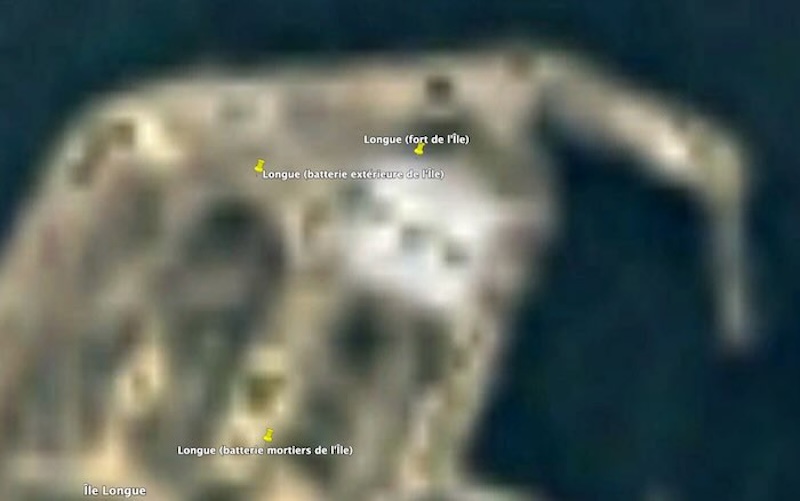 Pevnost Brest, jižně od města. Ostrov Île Longue se nachází východně od poloostrova Roscanvel severoseverozápadně od obce Crozon. První fort byl postaven Dajotem kolem roku 1775 na severovýchodním výběžku ostrova, v 51 m/n. m. V roce 1879 byla postavena hradba v úrovni šíje. Dokument ze dne 26. ledna 1911 upřesňuje, že v případě mobilizace by byl vyzbrojen 4 x 90 cm a 2 revolverovými děly. Z této hradby zůstala brána a dva úseky. Dále na sever byly dvě baterie seřazeny vedle sebe, čelem k rejdě, a kolem roku 1880 se tam nachází 4 x 19 cm. V roce 1901 se tam, v jedné linii, nachází 2 x 27 cm, 2 x 24 cm a 4 x 19 cm. Jejich palebné postavení bylo odděleno traversami. Stavy výzbroje z let 1888 a 1900 uvádějí na Ostrově 4 děla M de 24 cm model 1870, 2 na lafetách M model 1878-T-83 P.C. u vnitřní baterie (ve fortu) a 2 na lafetách M model 1876-T-83 P.A. u vnější baterie; 4 děla M de 19 cm model 1864-66 na lafetách M model 1869 P.A. (vnější batt.), 2 děla M de 27 cm model 1870 na lafetách M model 1876-T-83 (vnější batt.) stejně jako 2 děla de 16 cm model 1858-60 pro obranu pozemní. Stav výzbroje z roku 1914 již žádné z nich neuvádí. Starý fort měl na svých zadních glacis, kolmo ke svému čelu hrdla, prachárnu krytou ochrannými navážkami. Trochu vzadu se nacházela baterie moždířů, hlášená v listopadu 1889 jako ve výstavbě. Byla orientována na severovýchod a její 3 moždíře M de 30 cm mle 1883 na lafetách M Mle 1883 P.A., na místě v roce 1892 a uvedené ve stavu výzbroje z roku 1900, jsou ve stavu z roku 1914 nahrazeny 3 moždíři M de 30 cm model 1883-T-93 na upravených lafetách M model 1883 P.A. (výměna provedena mezi březnem 1904 a červnem 1905). Dva dálkoměrné stanoviště baterie moždířů byly postaveny, jedno v roce 1899 a druhé v roce 1901. Již od roku 1888 a stále v roce 1913 se uvažovalo o instalaci baterie 6 x 100 mm (a poté pouze 4) na ostrově, v baterii s dvojitým hřebenem, která by mohla působit i směrem do vnitrozemí. První světová válka těmto váháním udělala přítrž. Konečně, v letech 1904, 1907 a 1912, se uvažovalo o instalaci 90 cm světlometu ve starém fortu, ale tento záměr nebyl realizován. Bombardování protiletadlové baterie v roce 1944 bylo pro tyto baterie velmi škodlivé, úpravy současné ponorkové základny dokončily jejich zničení, stejně jako starý fort na severozápadním výběžku. Vstup zakázán.