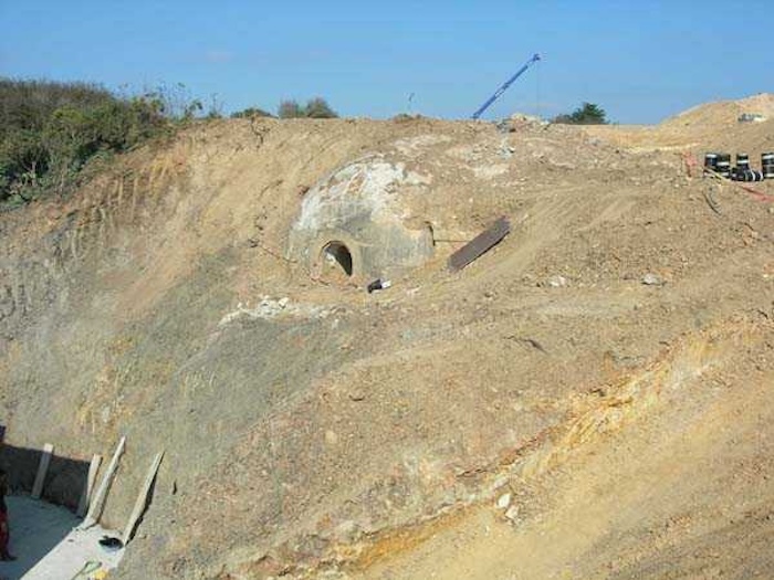 Fortress of Brest, south of the city. Île Longue is located east of the Roscanvel peninsula north-northwest of the town of Crozon. A first fort was built by Dajot around 1775 at the northeastern point of the island, at 51 m/alt. In 1879, a rampart was built at the level of the isthmus. A document dated January 26, 1911 specifies that in case of mobilization, it would be armed with 4 x 90 cm and 2 revolver cannons. Of this rampart, the gate and two sections remain. Further north, two batteries were aligned side by side, facing the roadstead, and around 1880, one finds 4 x 19 cm there. In 1901, one finds there, in a single alignment, 2 x 27 cm, 2 x 24 cm and 4 x 19 cm. Their firing positions were separated by traverses. The armament states of 1888 and 1900 report on the Island 4 M 24 cm model 1870 guns, 2 on M model 1878-T-83 P.C. carriages at the inner battery (in the fort) and 2 on M model 1876-T-83 P.A. carriages at the outer battery; 4 M 19 cm model 1864-66 guns on M model 1869 P.A. carriages (outer batt.), 2 M 27 cm model 1870 guns on M model 1876-T-83 carriages (outer batt.) as well as 2 16 cm model 1858-60 guns for land defence. The 1914 armament state no longer mentions any of them. The old fort had on its rear glacis, perpendicular to its gorge front, a powder magazine covered with protective earth. A little to the rear, there was a mortar battery, reported under construction in November 1889. It was oriented to the northeast and its 3 M 30 cm Mle 1883 mortars on M Mle 1883 P.A. carriages, in place in 1892 and listed in the 1900 armament state, are, in that of 1914, replaced by 3 M 30 cm model 1883-T-93 mortars on modified M model 1883 P.A. carriages (change carried out between March 1904 and June 1905). The two rangefinder posts of the mortar battery were built one in 1899 and the second in 1901. From 1888 and still in 1913, consideration was given to installing a battery of 6 x 100 mm (and afterwards only 4) on the island, in a double-crest battery that could have had actions landwards. The First World War put an end to these hesitations. Finally, in 1904, 1907 and 1912, there was talk of installing a 90 cm searchlight in the old fort, but this design was not realized. The bombardments of the Flak battery in 1944 were very detrimental to these batteries, the developments of the current submarine base completed their destruction, as well as the old fort situated on the northwestern promontory. Access forbidden.