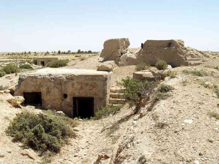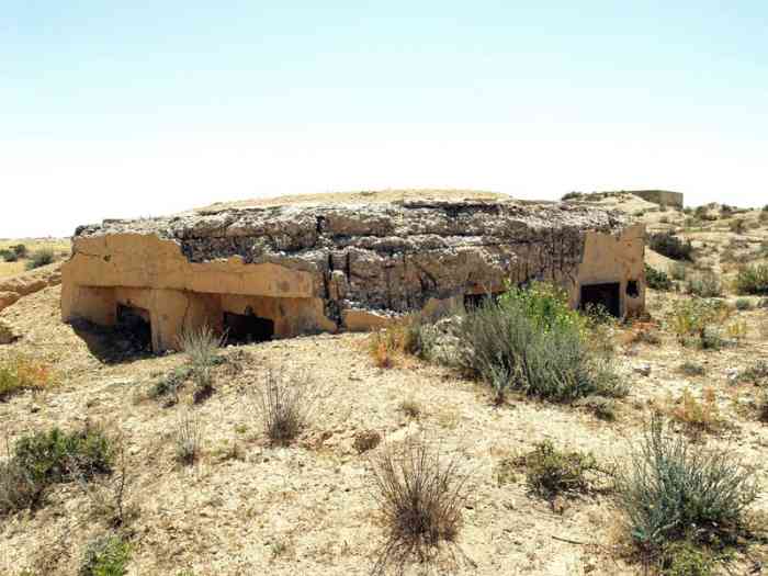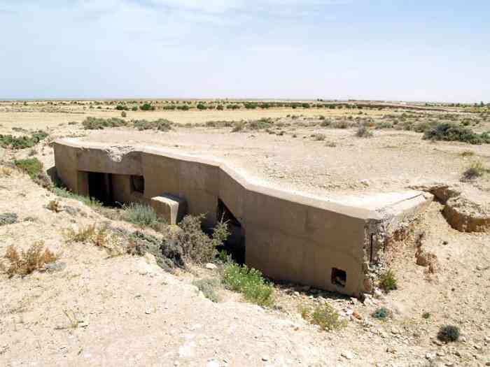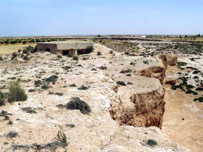 Mareth. Ce PA comprend : un PC de compagnie, deux casemates simples de flanquement pour GM, et une plateforme couverte pour canon de 47 AC, avec abri-soute. Cette position est conquise par les Britanniques le 20 mars 1943, puis reprise par les forces de l’Axe, le 22. Tous ses éléments sont toujours en place, marqués par les combats. Dieser SP umfasst: einen Kompaniegefechtsstand, zwei einfache Flankierungskasematten für MG-Gruppe und eine gedeckte Plattform für 47-mm-Panzerabwehrkanone mit Unterstandsbunker. Diese Stellung wurde am 20. März 1943 von den Briten erobert und am 22. von den Achsenmächten zurückerobert. Alle ihre Elemente sind noch vorhanden, von den Kämpfen gezeichnet. Deze SP omvat: een compagniescommandopost, twee enkelvoudige flankeringskazematten voor GM, en een overdekt platform voor 47 mm-antitankkanon, met onderkomensbunker. Deze positie werd veroverd door de Britten op 20 maart 1943, en vervolgens heroverd door de Asmogendheden op de 22e. Al haar elementen zijn nog aanwezig, getekend door de gevechten. This SP comprises: a company command post, two single flanking casemates for MG group, and a covered platform for 47 mm AT gun, with shelter-magazine. This position was conquered by the British on 20 March 1943, then retaken by the Axis forces on the 22nd. All its elements are still in place, marked by the fighting. Tento OB zahrnuje: rotní velitelské stanoviště, dvě jednoduché flankovací kasematy pro skupinu kulometů a krytou platformu pro 47mm protitankový kanón s úkrytem-skladištěm. Tato pozice byla dobyta Brity 20. března 1943 a poté znovu dobyta silami Osy 22. března. Všechny její prvky jsou stále na místě, poznamenané boji. © JJM 05/03/2026