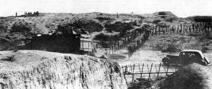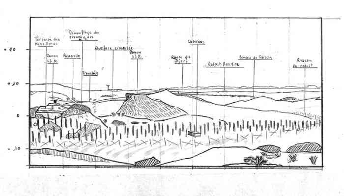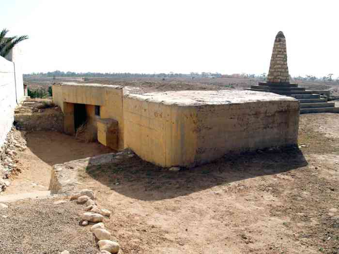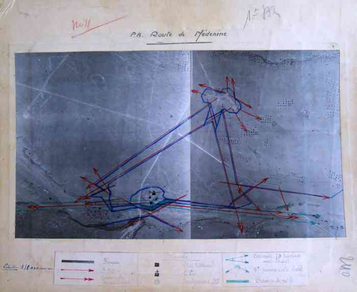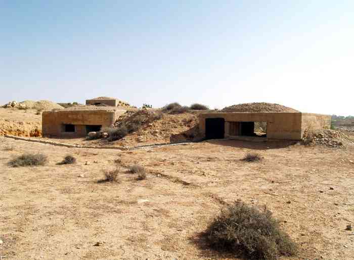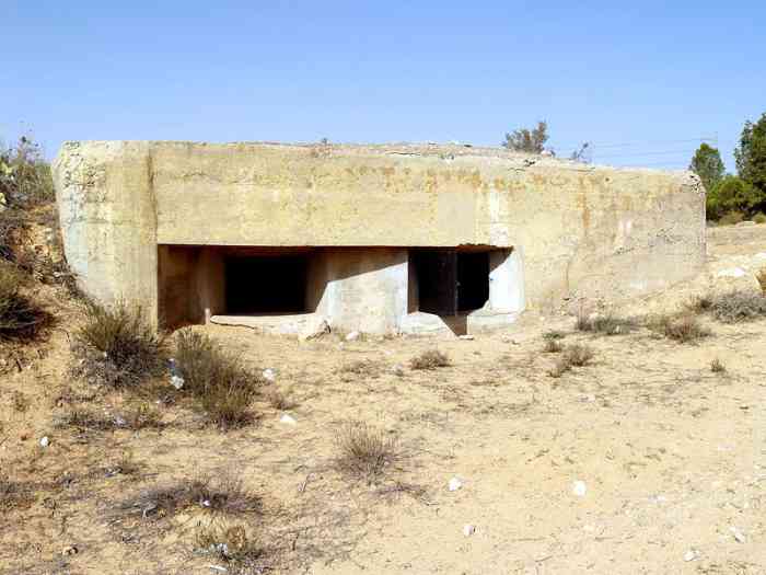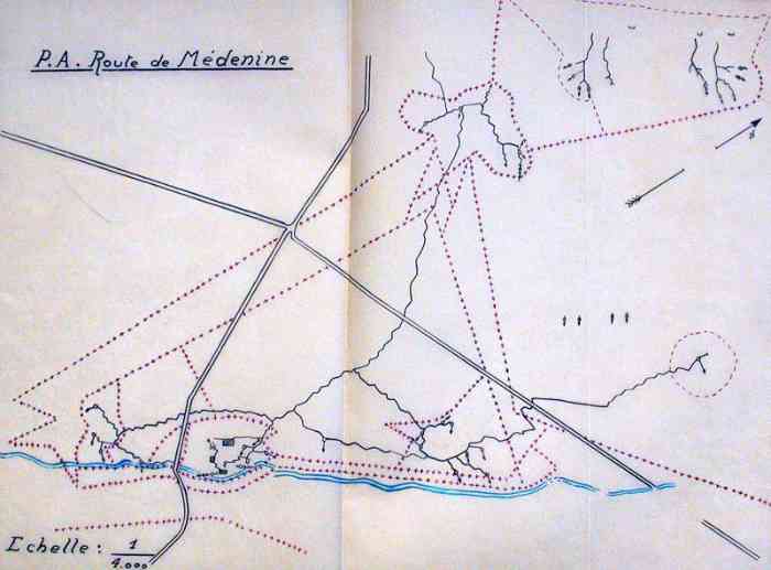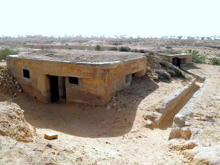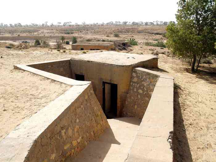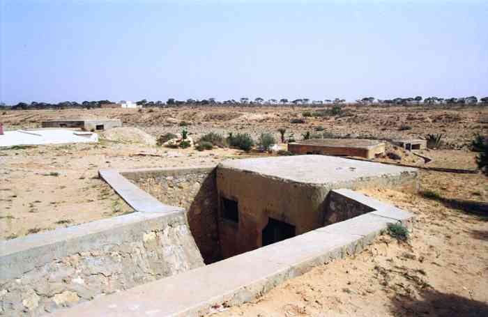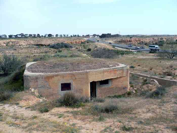 Mareth. Ce PA comprend : un PC de compagnie, une casemate double de flanquement pour groupes de mitrailleuses, deux plateformes couvertes pour canon de 47 M, dont une avec abri-soute, et un central téléphonique. Comme son nom l’indique, cette position contrôle la route de Médenine, qui mène vers la frontière libyenne. Elle est donc de première importance. En 1943, les Italiens transforment les deux cuves pour canon de 47 en blockhaus. Ce sera le seul ajout à l’organisation initiale, avec le blockhaus pour FM de la position P5. De nos jours, tous ces éléments sont toujours visibles. Un bâtiment, construit sur l’arrière de la position, abrite un musée de la ligne Mareth. On peut y voir une tourelle démontable pour mitrailleuse, dont quatre exemplaires étaient en place dans les PA du littoral. Quelques pièces d’artillerie, de diverses nationalités, sont présentes à l’extérieur, parmi lesquelles deux tubes de 90 Mle 1877, provenant de la position P24 Kef N’Soura. Dieser SP umfasst: einen Kompaniegefechtsstand, eine Doppelflankierungskasematte für Maschinengewehrgruppen, zwei gedeckte Plattformen für 47-mm-Kanone M, davon eine mit Unterstandsbunker, und eine Telefonzentrale. Wie der Name sagt, kontrolliert diese Stellung die Straße nach Médenine, die zur libyschen Grenze führt. Sie ist daher von größter Bedeutung. 1943 verwandelten die Italiener die beiden Gruben für die 47-mm-Kanone in Bunker. Dies wird die einzige Ergänzung der ursprünglichen Anlage sein, zusammen mit dem LMG-Bunker der Stellung P5. Heutzutage sind alle diese Elemente noch sichtbar. Ein Gebäude, das im rückwärtigen Bereich der Stellung errichtet wurde, beherbergt ein Museum der Mareth-Linie. Man kann dort einen demontierbaren Maschinengewehrturm sehen, von dem vier Exemplare in den Küstenstützpunkten vorhanden waren. Einige Artilleriegeschütze verschiedener Nationalitäten sind im Freien ausgestellt, darunter zwei Rohre von 90-mm-Kanonen Mle 1877, die von der Stellung P24 Kef N’Soura stammen. Deze SP omvat: een compagniescommandopost, een dubbele flankeringskazemat voor mitrailleurgroepen, twee overdekte platformen voor 47 mm-kanon M, waarvan één met onderkomensbunker, en een telefooncentrale. Zoals de naam aangeeft, controleert deze positie de weg naar Médenine, die naar de Libische grens leidt. Zij is dus van het grootste belang. In 1943 transformeren de Italianen de twee kazematten voor 47 mm-kanon in bunkers. Dit zal de enige toevoeging aan de oorspronkelijke organisatie zijn, samen met de LK-bunker van positie P5. Tegenwoordig zijn al deze elementen nog zichtbaar. Een gebouw, gebouwd aan de achterzijde van de positie, herbergt een museum van de Marethlinie. Men kan er een demonteerbare mitrailleurkoepel zien, waarvan vier exemplaren aanwezig waren in de kuststeunpunten. Enkele artilleriestukken van diverse nationaliteiten zijn buiten aanwezig, waaronder twee lopen van 90 mm-kanonnen Mle 1877, afkomstig van de positie P24 Kef N’Soura. This SP comprises: a company command post, a double flanking casemate for machine gun groups, two covered platforms for 47 M gun, one of which with shelter-magazine, and a telephone exchange. As its name indicates, this position controls the Médenine road, which leads to the Libyan border. It is therefore of prime importance. In 1943, the Italians transformed the two pits for the 47 mm gun into blockhouses. This will be the only addition to the initial organisation, along with the LMG blockhouse of position P5. Nowadays, all these elements are still visible. A building, constructed at the rear of the position, houses a museum of the Mareth Line. One can see a demountable machine gun turret there, four of which were in place in the coastal strongpoints. A few artillery pieces, of various nationalities, are present outside, including two barrels of 90 mm Mle 1877 guns, coming from position P24 Kef N’Soura. Tento OB zahrnuje: rotní velitelské stanoviště, dvojitou flankovací kasematu pro skupiny kulometů, dvě kryté platformy pro kanón ráže 47 M, z toho jednu s úkrytem-skladištěm, a telefonní ústřednu. Jak název napovídá, tato pozice kontroluje silnici na Medenín, která vede k libyjským hranicím. Je tedy prvořadého významu. V roce 1943 Italové přeměnili dvě jámy pro kanón ráže 47 mm na bunkry. To bude jediný dodatek k původní organizaci, spolu s bunkrem pro LK z pozice P5. V dnešní době jsou všechny tyto prvky stále viditelné. Budova postavená v týlu pozice ukrývá muzeum linie Mareth. Je zde k vidění demontovatelná věž pro kulomet, jejíž čtyři exempláře byly na místě v pobřežních opěrných bodech. Venku je několik dělostřeleckých kusů různých národností, mezi nimi dvě hlavně 90mm kanónů vz. 1877 pocházející z pozice P24 Kef N’Soura. © JJM 05/03/2026