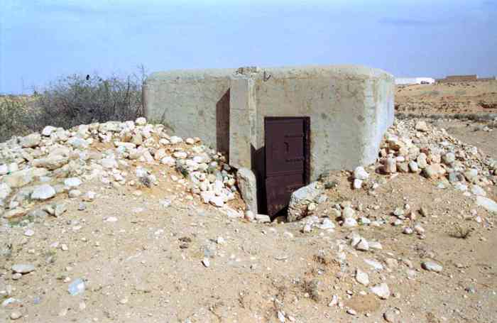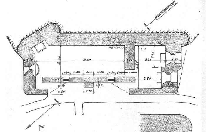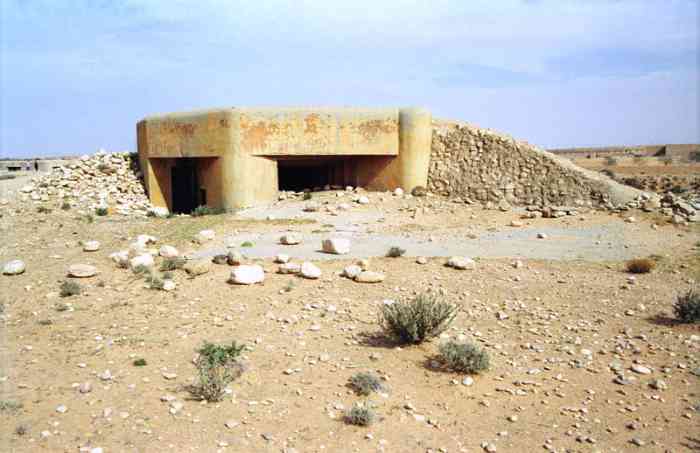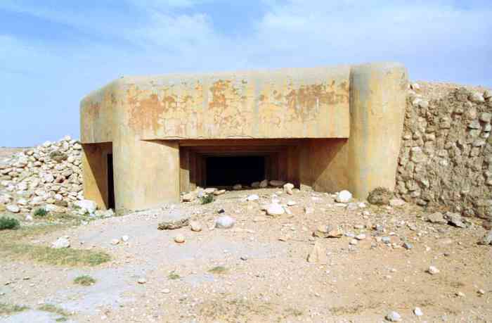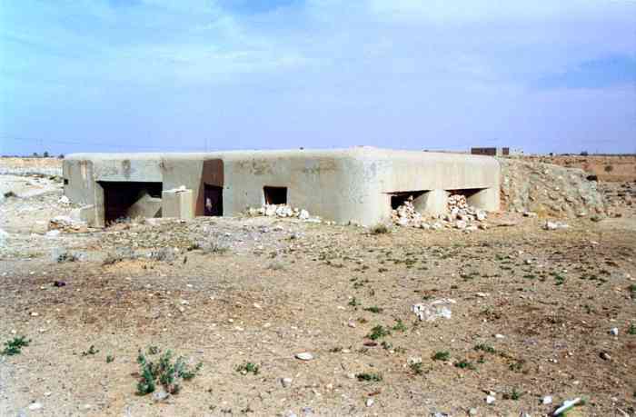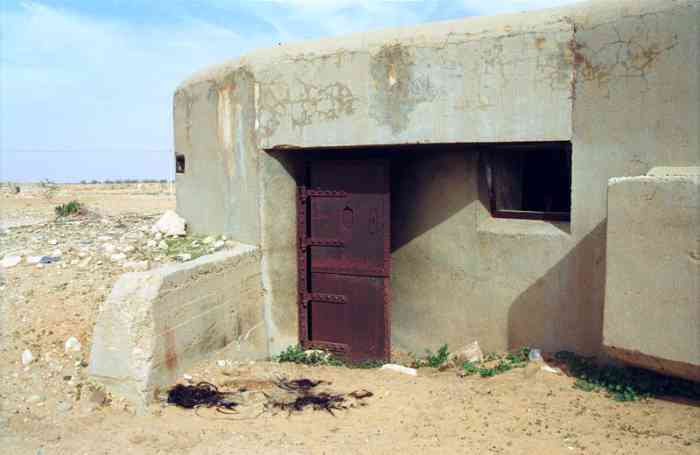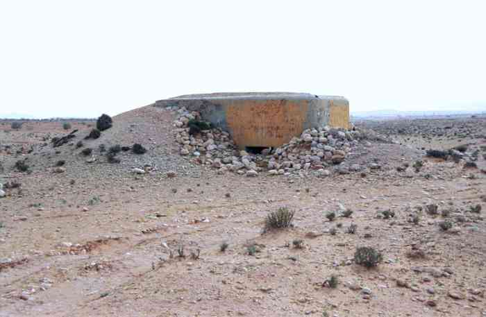 Mareth. Ce PA comprend : un PC de compagnie, avec casemate pour GM accolée flanquant à droite, un blockhaus pour FM, et une casemate de flanquement pour canon de 75 M antichar flanquant à droite. Ces éléments sont toujours visibles, avec leurs volets blindés. Dieser SP umfasst: einen Kompaniegefechtsstand mit angebauter MG-Gruppen-Kasematte rechts flankierend, einen Bunker für LMG und eine Flankierungskasematte für 75-mm-Panzerabwehrkanone M rechts flankierend. Diese Elemente sind noch sichtbar, mit ihren Panzerklappen. Deze SP omvat: een compagniescommandopost, met aangebouwde GM-kazemat rechts flankerend, een bunker voor LK, en een flankeringskazemat voor 75 mm-antitankkanon M rechts flankerend. Deze elementen zijn nog zichtbaar, met hun pantserluiken. This SP comprises: a company command post, with attached MG group casemate flanking right, a blockhouse for LMG, and a flanking casemate for 75 mm anti-tank gun M flanking right. These elements are still visible, with their armoured flaps. Tento OB zahrnuje: rotní velitelské stanoviště s přistavěnou kasematou pro skupinu kulometů flankující vpravo, bunkr pro LK a flankovací kasematu pro 75mm protitankový kanón M flankující vpravo. Tyto prvky jsou stále viditelné, i s pancéřovými klapkami. © JJM 05/03/2026