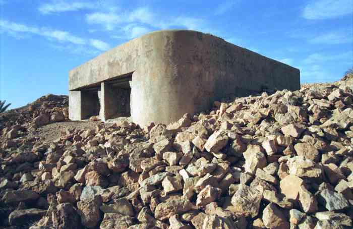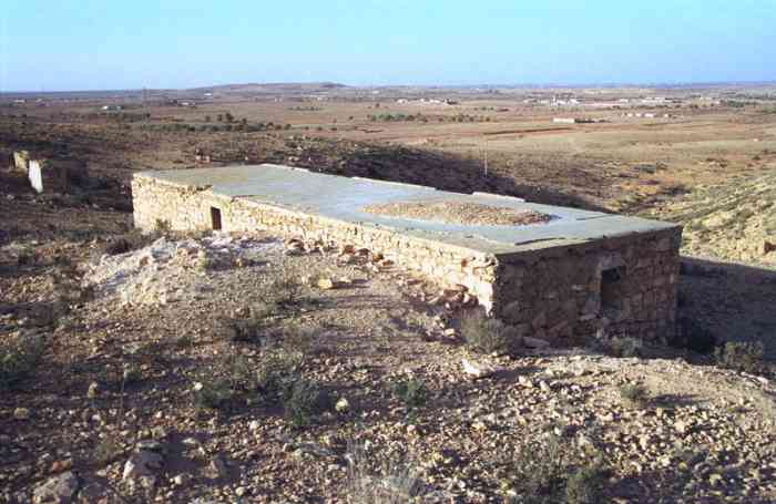 Mareth. Ce PA comprend : un PC de compagnie, trois casemates de flanquement simples pour GM, et trois plateformes couvertes pour canon de 47 M, dont une avec abri-soute. Tous les éléments de cette position, très étendue, sont toujours visibles. Dieser SP umfasst: einen Kompaniegefechtsstand, drei einfache Flankierungskasematten für MG-Gruppe und drei gedeckte Plattformen für 47-mm-Kanone M, davon eine mit Unterstandsbunker. Alle Elemente dieser sehr ausgedehnten Stellung sind noch sichtbar. Deze SP omvat: een compagniescommandopost, drie enkelvoudige flankeringskazematten voor GM, en drie overdekte platformen voor 47 mm-kanon M, waarvan één met onderkomensbunker. Alle elementen van deze zeer uitgestrekte positie zijn nog zichtbaar. This SP comprises: a company command post, three single flanking casemates for MG group, and three covered platforms for 47 M gun, one of which with shelter-magazine. All the elements of this very extensive position are still visible. Tento OB zahrnuje: rotní velitelské stanoviště, tři jednoduché flankovací kasematy pro skupinu kulometů a tři kryté platformy pro kanón ráže 47 M, z toho jednu s úkrytem-skladištěm. Všechny prvky této velmi rozsáhlé pozice jsou stále viditelné. © JJM 05/03/2026