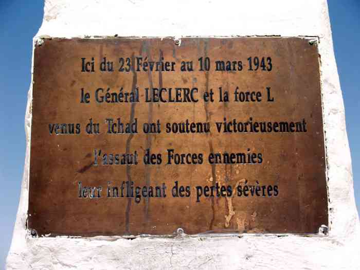 Mareth. Ce n’est pas, à proprement parler, une position avancée de la ligne Mareth, mais cette oasis mérite d’être mentionnée. En effet, sa prise par la force L du général Leclerc, en février-mars 1943, après de durs combats contre des éléments des 15e et 21e panzer-divisions, facilite grandement l’opération de contournement de la position Mareth-Toujane par le Dahar, effectuée par le corps néo-zélandais à partir du 16 mars 1943. Le site vaut surtout pour les ruines du fort romain de Tisavar, et par l’oasis, avec sa source d’eau chaude. Une stèle commémore les événements de 1943. Es ist zwar keine vorgeschobene Stellung der Mareth-Linie im eigentlichen Sinne, aber diese Oase verdient Erwähnung. Denn ihre Einnahme durch die Streitmacht L von General Leclerc im Februar-März 1943 nach harten Kämpfen gegen Teile der 15. und 21. Panzer-Division erleichtert die Umgehungsoperation der Stellung Mareth-Toujane durch den Dahar, die vom neuseeländischen Korps ab dem 16. März 1943 durchgeführt wurde, erheblich. Die Stätte ist vor allem wegen der Ruinen des römischen Forts Tisavar und der Oase mit ihrer heißen Quelle sehenswert. Eine Stele erinnert an die Ereignisse von 1943. Het is strikt genomen geen vooruitgeschoven positie van de Marethlinie, maar deze oase verdient vermelding. De inname ervan door de strijdmacht L van generaal Leclerc in februari-maart 1943, na zware gevechten tegen elementen van de 15e en 21e pantserdivisies, vergemakkelijkt namelijk de omtrekkende beweging van de stelling Mareth-Toujane via de Dahar, uitgevoerd door het Nieuw-Zeelandse korps vanaf 16 maart 1943. De site is vooral de moeite waard vanwege de ruïnes van het Romeinse fort Tisavar, en de oase met zijn warmwaterbron. Een gedenksteen herdenkt de gebeurtenissen van 1943. This is not, strictly speaking, an advanced position of the Mareth Line, but this oasis deserves to be mentioned. Indeed, its capture by General Leclerc's Force L, in February-March 1943, after hard fighting against elements of the 15th and 21st Panzer Divisions, greatly facilitates the outflanking operation of the Mareth-Toujane position via the Dahar, carried out by the New Zealand corps from 16 March 1943 onwards. The site is especially worthwhile for the ruins of the Roman fort of Tisavar, and the oasis, with its hot spring. A stele commemorates the events of 1943. Není to přesně řečeno předsunuté postavení linie Mareth, ale tato oáza si zaslouží zmínku. Její dobytí silou L generála Leclerca v únoru až březnu 1943 po těžkých bojích s prvky 15. a 21. tankové divize totiž značně usnadnilo obchvatnou operaci postavení Mareth-Toujane přes Dahar, provedenou novozélandským sborem od 16. března 1943. Místo stojí za to především kvůli ruinám římské pevnosti Tisavar a oáze s horkým pramenem. Stele připomíná události roku 1943. © JJM 05/03/2026