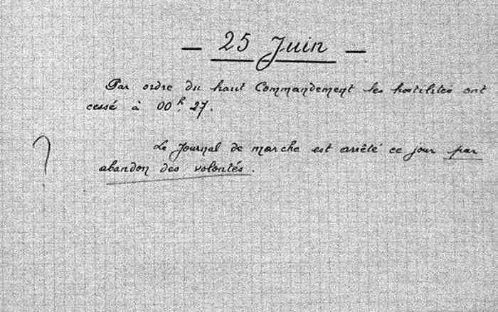 The artillery of the RFST is, of course, reinforced by that of the Infantry Divisions and by the ALCA. All this was to no avail, and the armistice occurred without the slightest notable event having taken place in the RFST. The war diary of the FST bears, under the date of 25 June 1940, this curious annotation, which shows the bewilderment of the writer faced with events: « par ordre du commandement, les hostilités ont cessé à 00 heures 27. Le journal de marche est arrêté ce jour par abandon des volontés ». The underlining was added by an anonymous hand, accompanied by a question mark, certainly disapproving. But the diary is resumed the next day without further incident. It is closed on the date of the dissolution of the FST, the following 1 July, at midnight.Při vstupu Itálie do války zahrnuje sestava FST (Jihotuniská fronta), pod velením generála Poupinela, v podstatě: