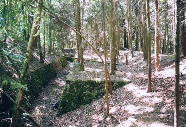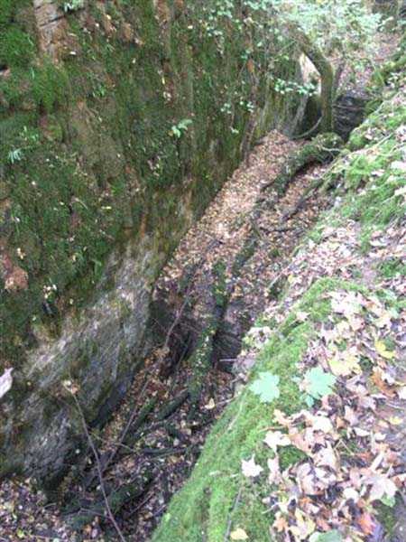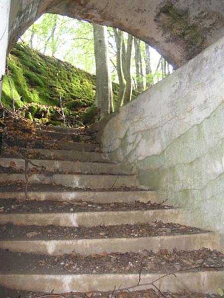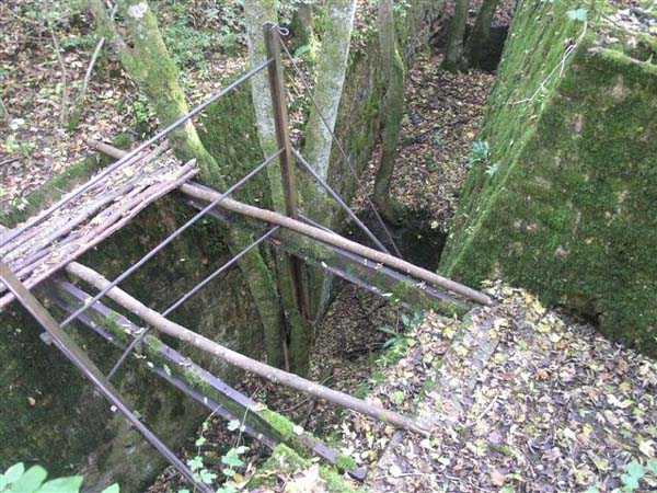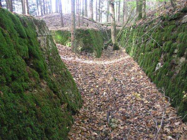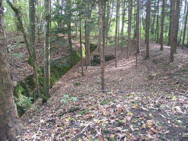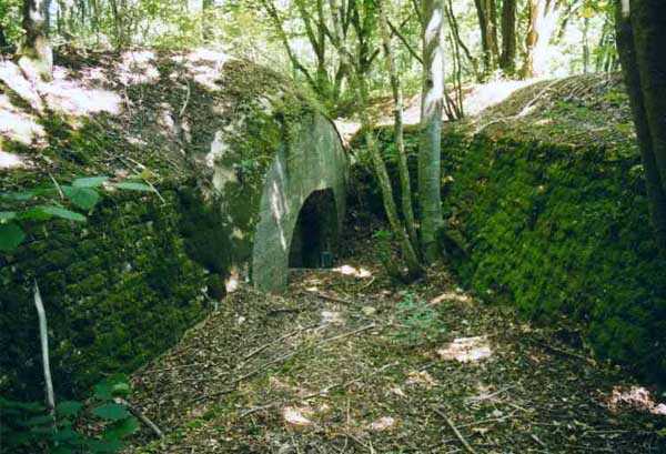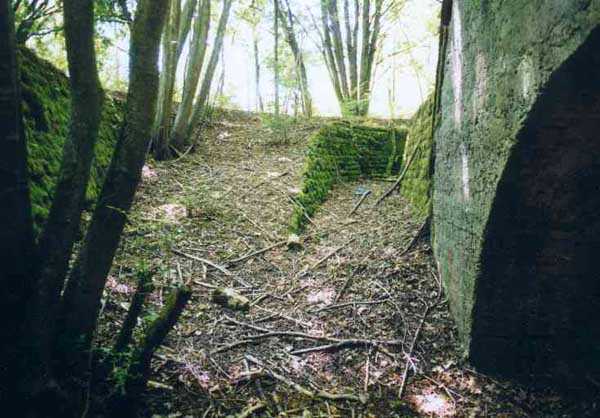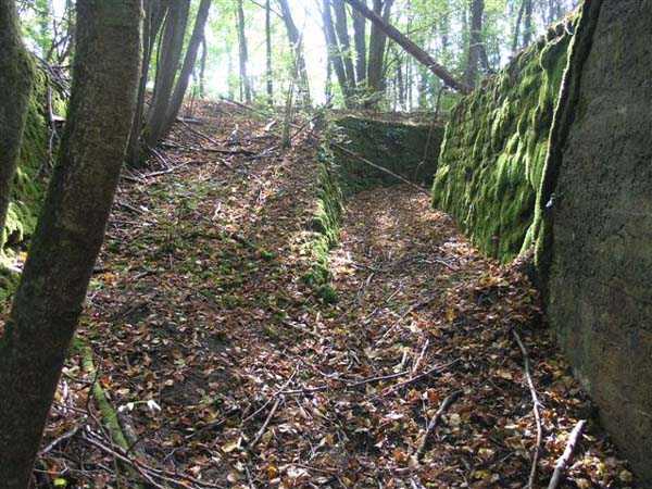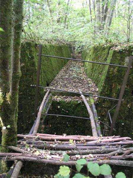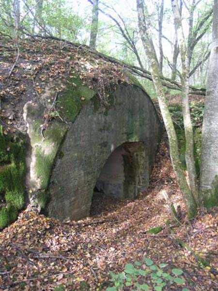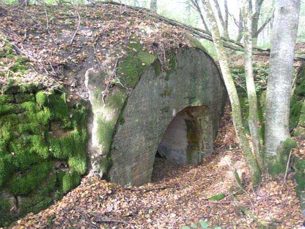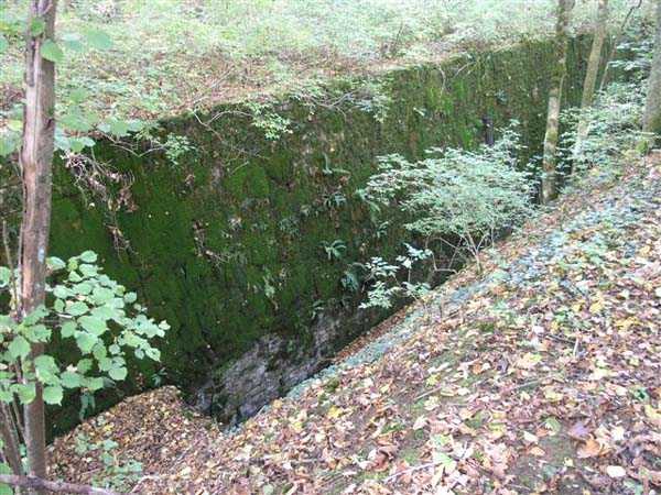 Fortress of Langres, north of the town, 1888. 425 m alt. Infantry work, kidney-shaped, typical of the Langres fortress. However it is less compact than the Montagne work for example. Its masonry is among the best preserved of the place. Its revetted scarp is intact and the trenches where the infantry had to move have their walls in perfect condition. The tops of the work consist partly of a young beech wood and partly of a spruce wood. The herbaceous layer being thus reduced almost to nothing, the reliefs are particularly well discernible, especially on the flanks and the head front. A drawbridge allowed crossing the gorge ditch and it is not impossible that the metallic elements suspended today (10/2007) in the void are remnants of it. Six times, this gorge ditch was deepened to reach the level of the air vents of the quarters located about two metres lower than the bottom of the ditch. As in other works of the same type, two entrances covered with a concrete thickness of about two metres lead to a staircase going about seven metres lower. The basement shows six quarters whose section is horseshoe-shaped. All are perfectly coated with an immaculate cement render except for the presence of a large graffiti near the left entrance "LANOT 1914-15-". The housing of a water fountain can be spotted not far from the foot of the right staircase. In its right half, the circulation corridor of the quarters proves quite remarkable by its concretions. The floor is only a succession of gours over a very long distance. Private property. The approach to the ditches is potentially dangerous, especially the gorge one, very steep and slippery.