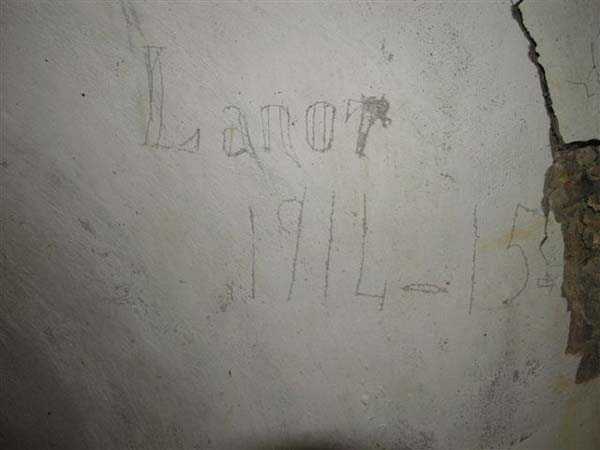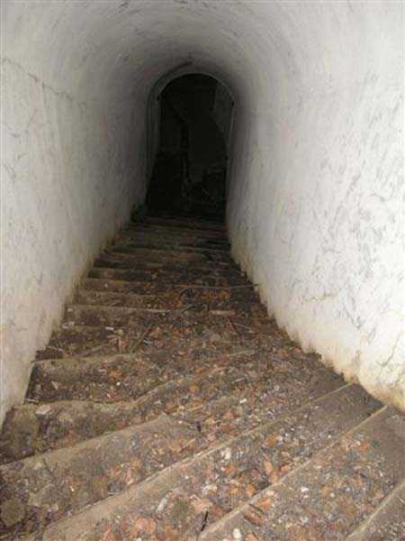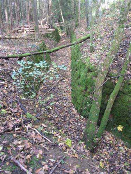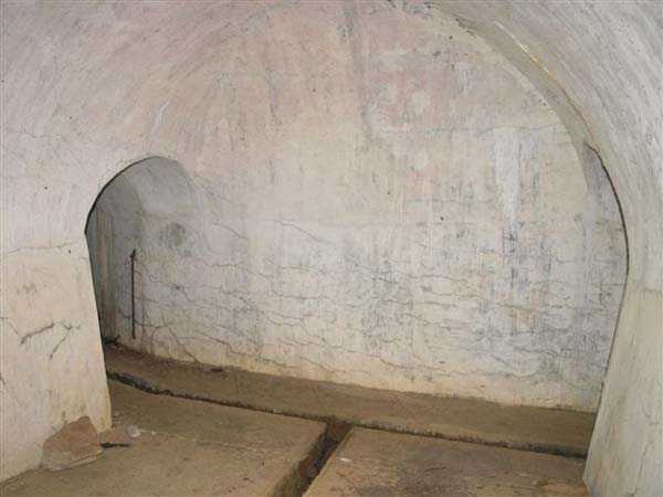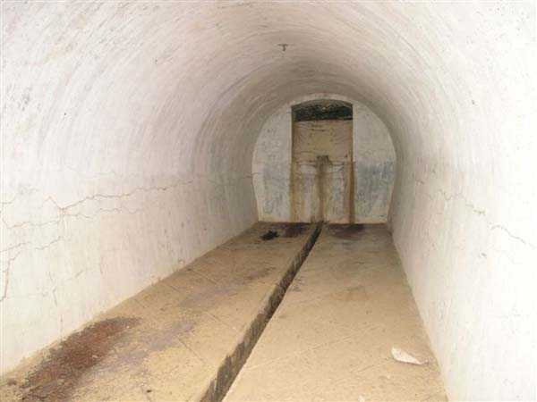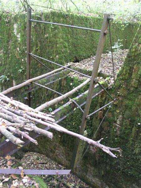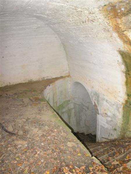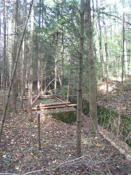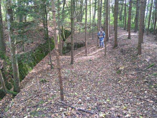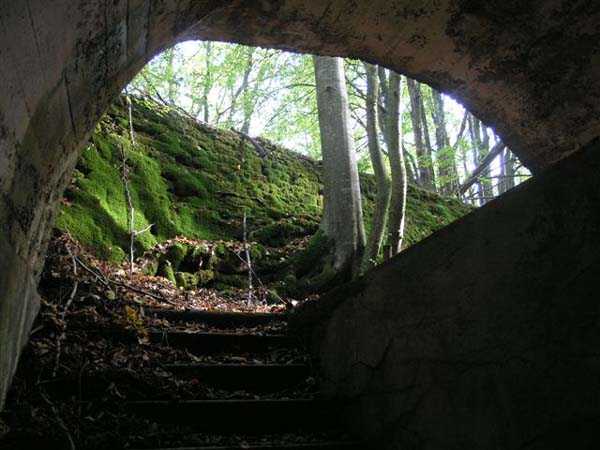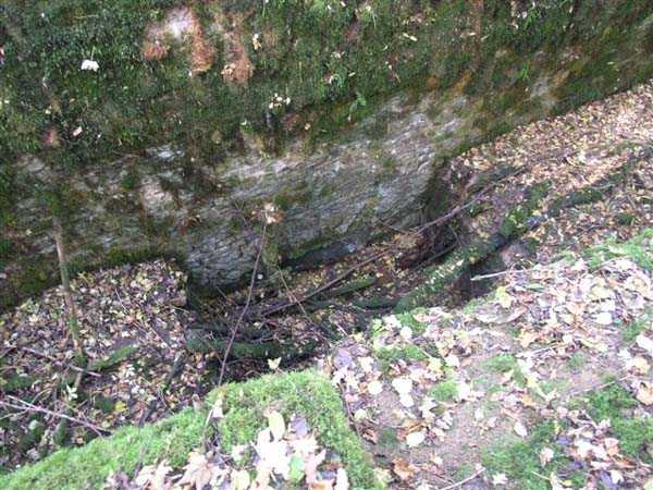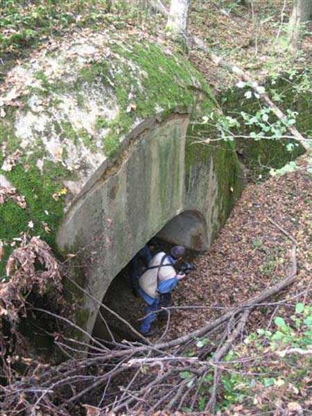 Fortress of Langres, north of the town, 1888. 425 m alt. Infantry work, kidney-shaped, typical of the Langres fortress. However it is less compact than the Montagne work for example. Its masonry is among the best preserved of the place. Its revetted scarp is intact and the trenches where the infantry had to move have their walls in perfect condition. The tops of the work consist partly of a young beech wood and partly of a spruce wood. The herbaceous layer being thus reduced almost to nothing, the reliefs are particularly well discernible, especially on the flanks and the head front. A drawbridge allowed crossing the gorge ditch and it is not impossible that the metallic elements suspended today (10/2007) in the void are remnants of it. Six times, this gorge ditch was deepened to reach the level of the air vents of the quarters located about two metres lower than the bottom of the ditch. As in other works of the same type, two entrances covered with a concrete thickness of about two metres lead to a staircase going about seven metres lower. The basement shows six quarters whose section is horseshoe-shaped. All are perfectly coated with an immaculate cement render except for the presence of a large graffiti near the left entrance "LANOT 1914-15-". The housing of a water fountain can be spotted not far from the foot of the right staircase. In its right half, the circulation corridor of the quarters proves quite remarkable by its concretions. The floor is only a succession of gours over a very long distance. Private property. The approach to the ditches is potentially dangerous, especially the gorge one, very steep and slippery.