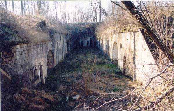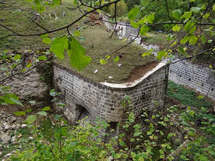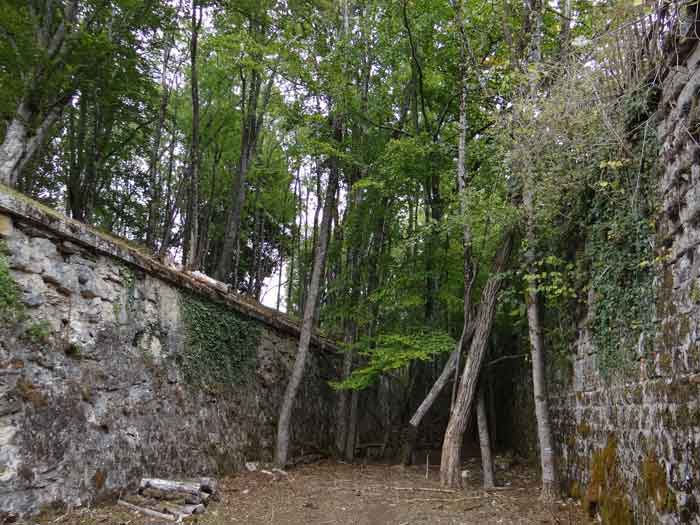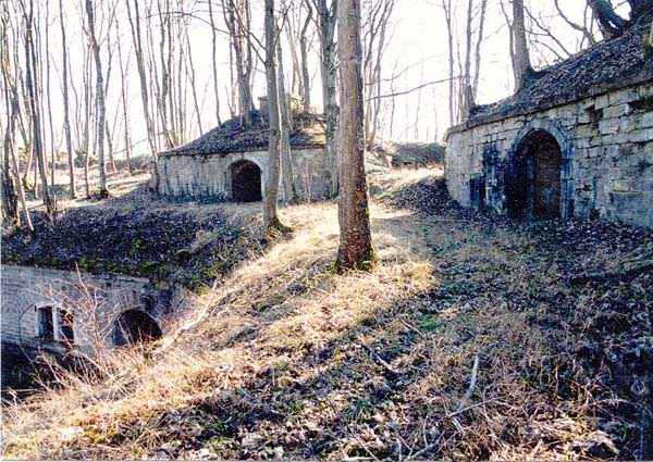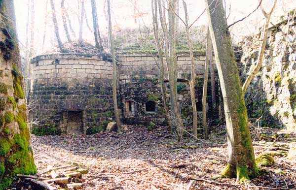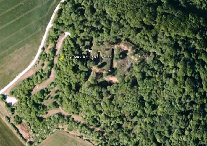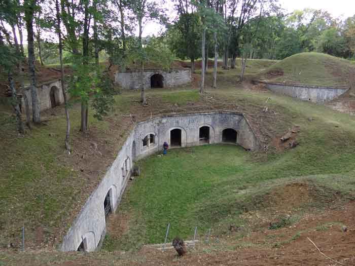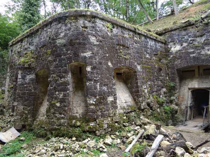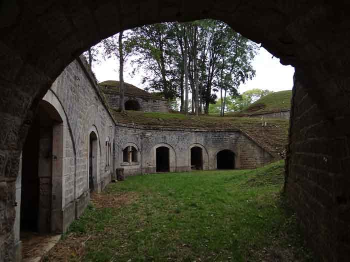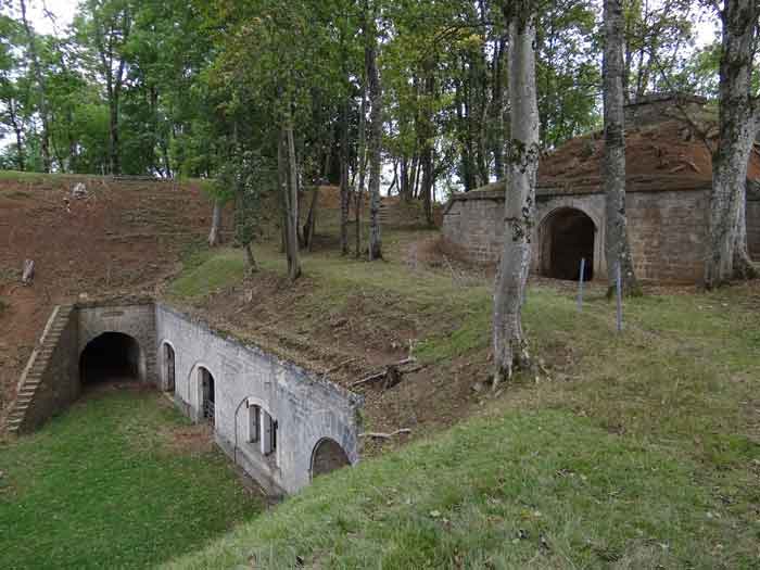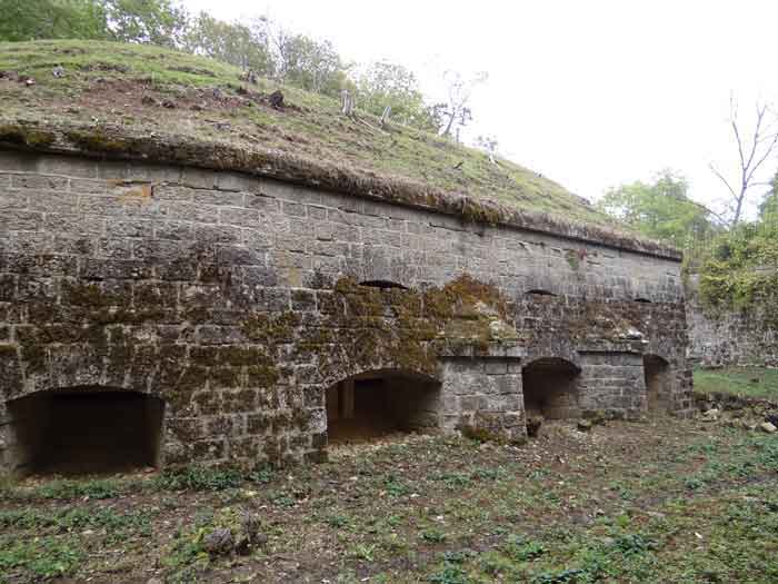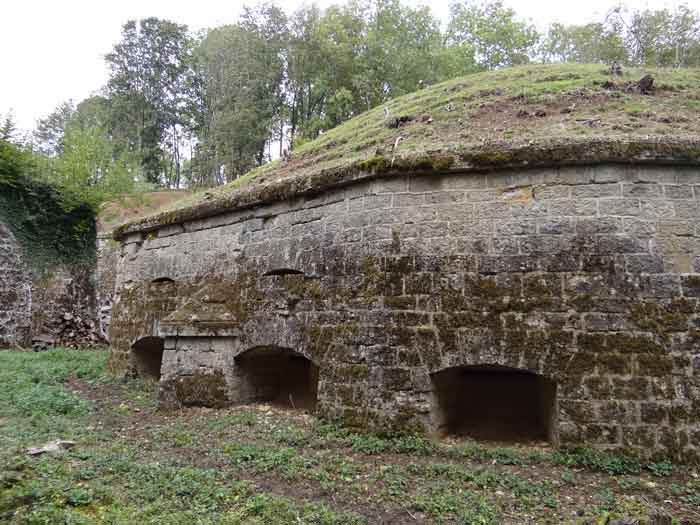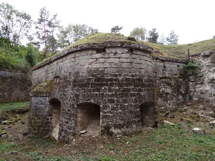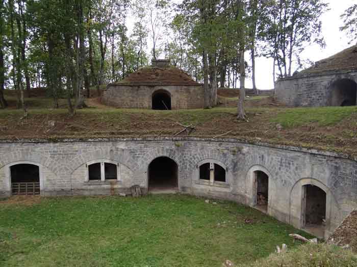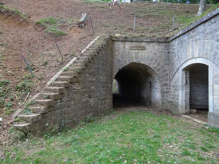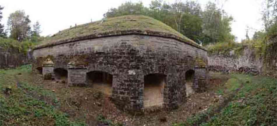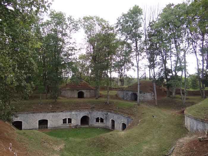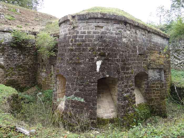 Defensive curtain of the Meuse heights, 1883-1885. 360 m/alt. Called fort Raoult. The southernmost structure of the curtain. Works 17 and 1 magazine under the scarp (walled). 535 men and 26 guns planned during construction. Before 1910, this armament had been reduced to 4 x 120 L, 3 x 90 mm, 3 x 12-breech cannons and 5 revolver cannons. After 1910, there were 2 x 120 L, 4 x 90 mm and the same armament for flanking. An infantry structure, surrounded by a shallow ditch, is attached to the fort. Most of the counterscarp railings are in place. Extremely rare flail bridge at the postern of the wing of salient III. The drawbridge bears, in relief, the inscription "PAINDAVOINE CONSTRUCTEUR". The fort contains beautiful masonry, especially the intrados of the vaults of the orillons of the caponiers and, more unexpectedly, the ceiling of the guardhouse of the counterscarp. To the extreme left of the artillery cavalier, we find a curious little observatory, very narrow, with a metal visor. Property of the municipality.